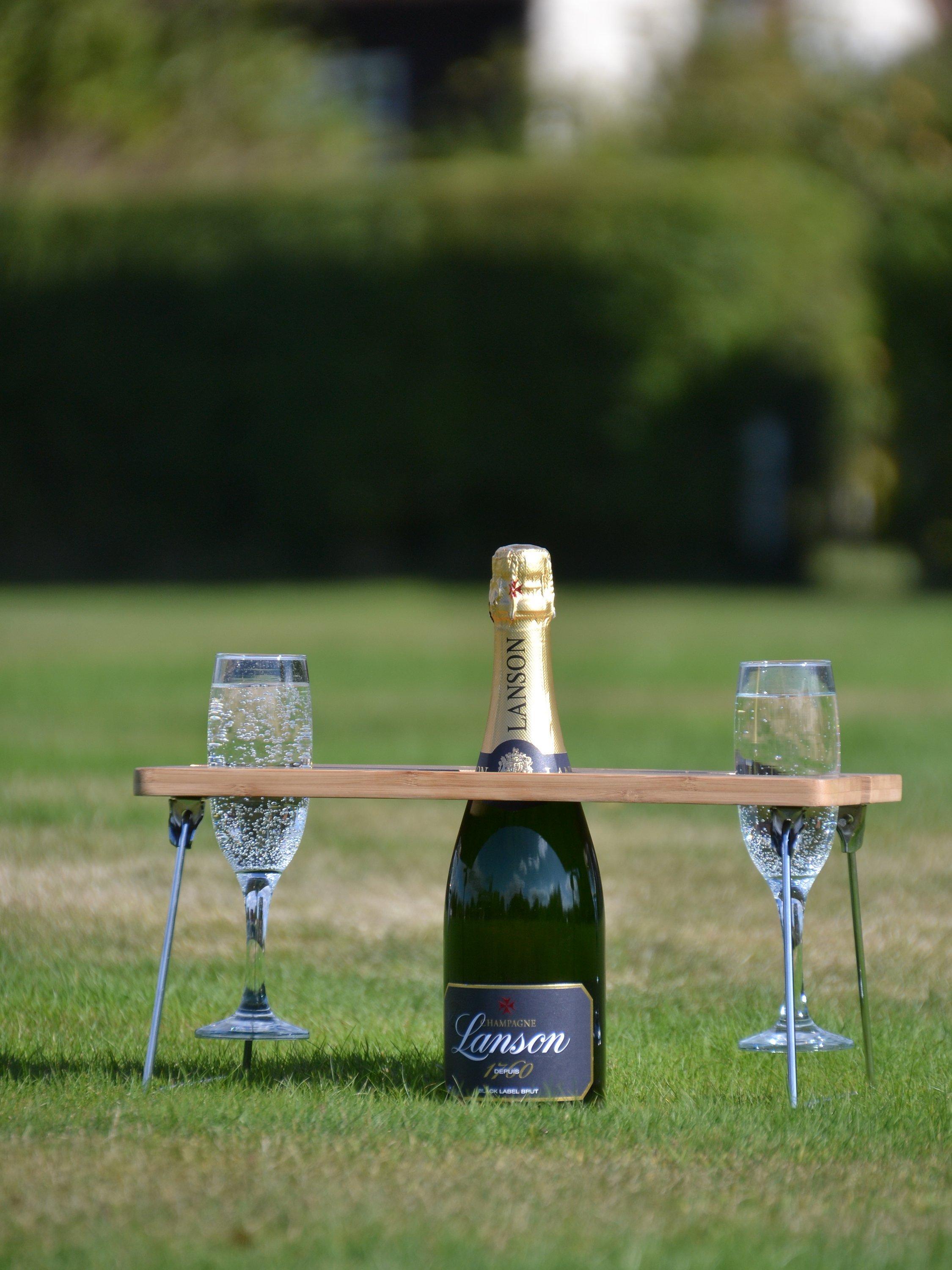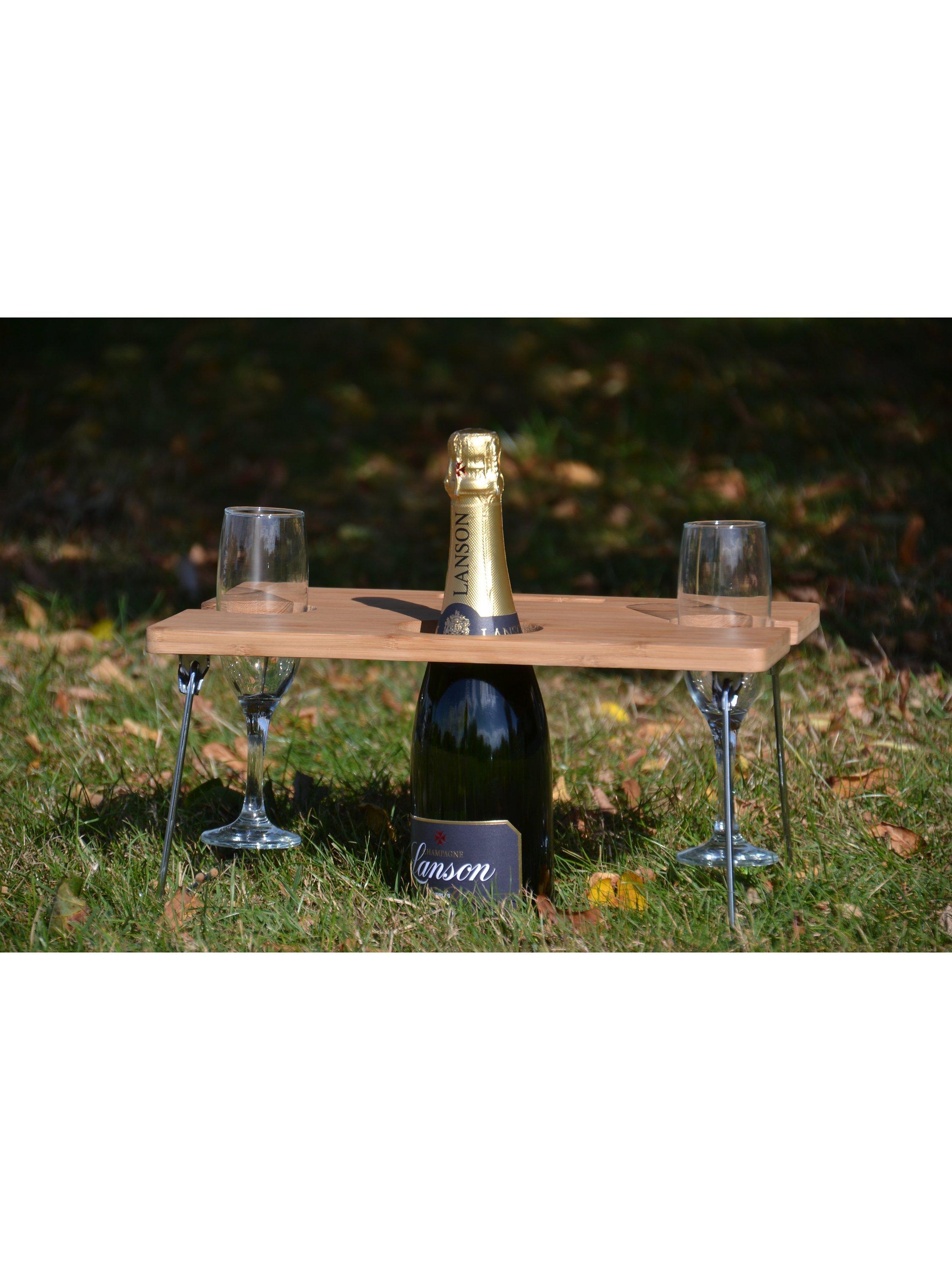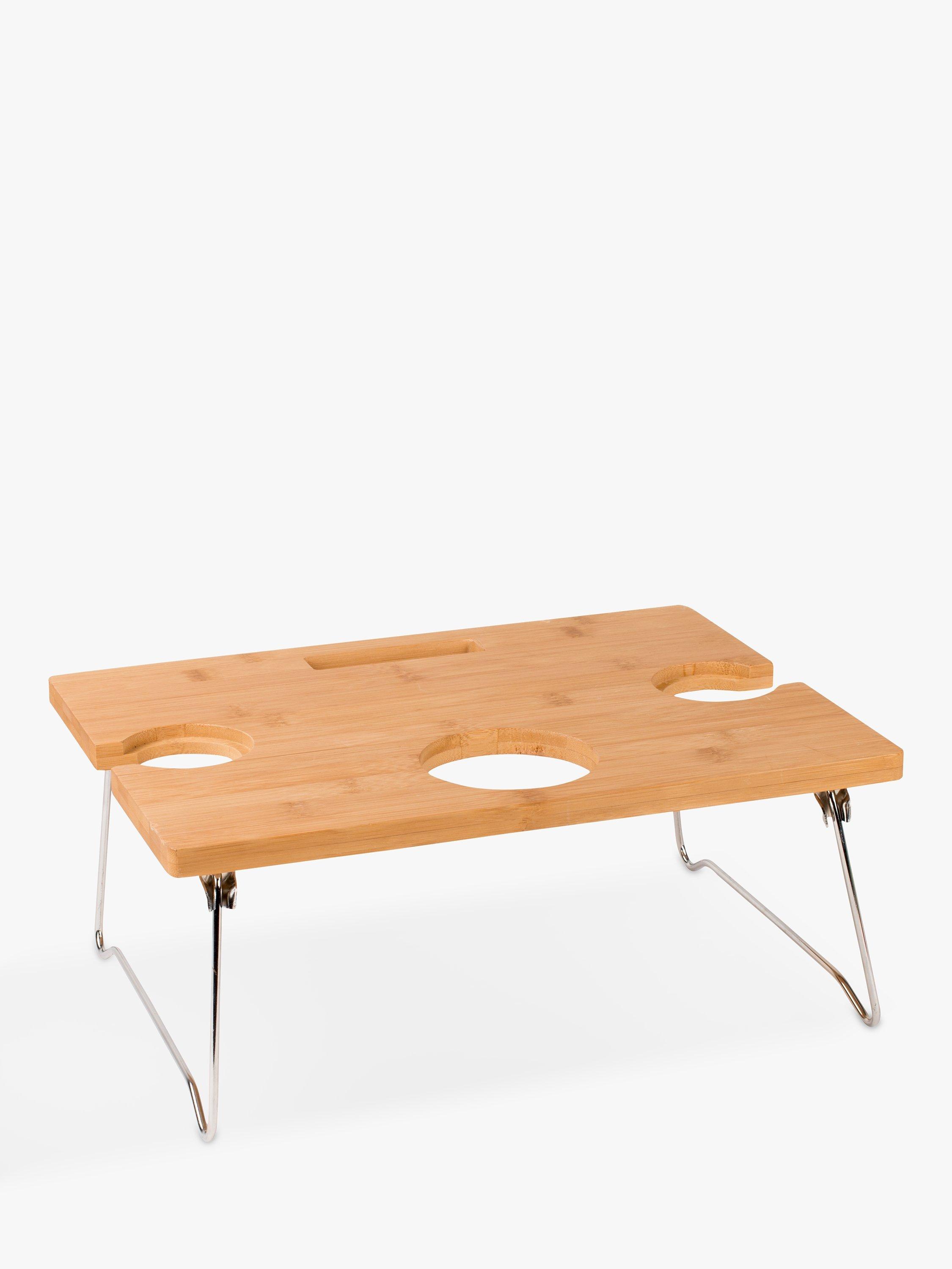 For drinks on the lawn at parties, picnics, festivals and events, this foldaway table from Navigate solves the problem of keeping glassware from toppling over. Made of lightweight bamboo with sturdy metal legs, this portable mini table holds two glasses and one bottle. It folds up neatly to tuck into a picnic bag or backpack.