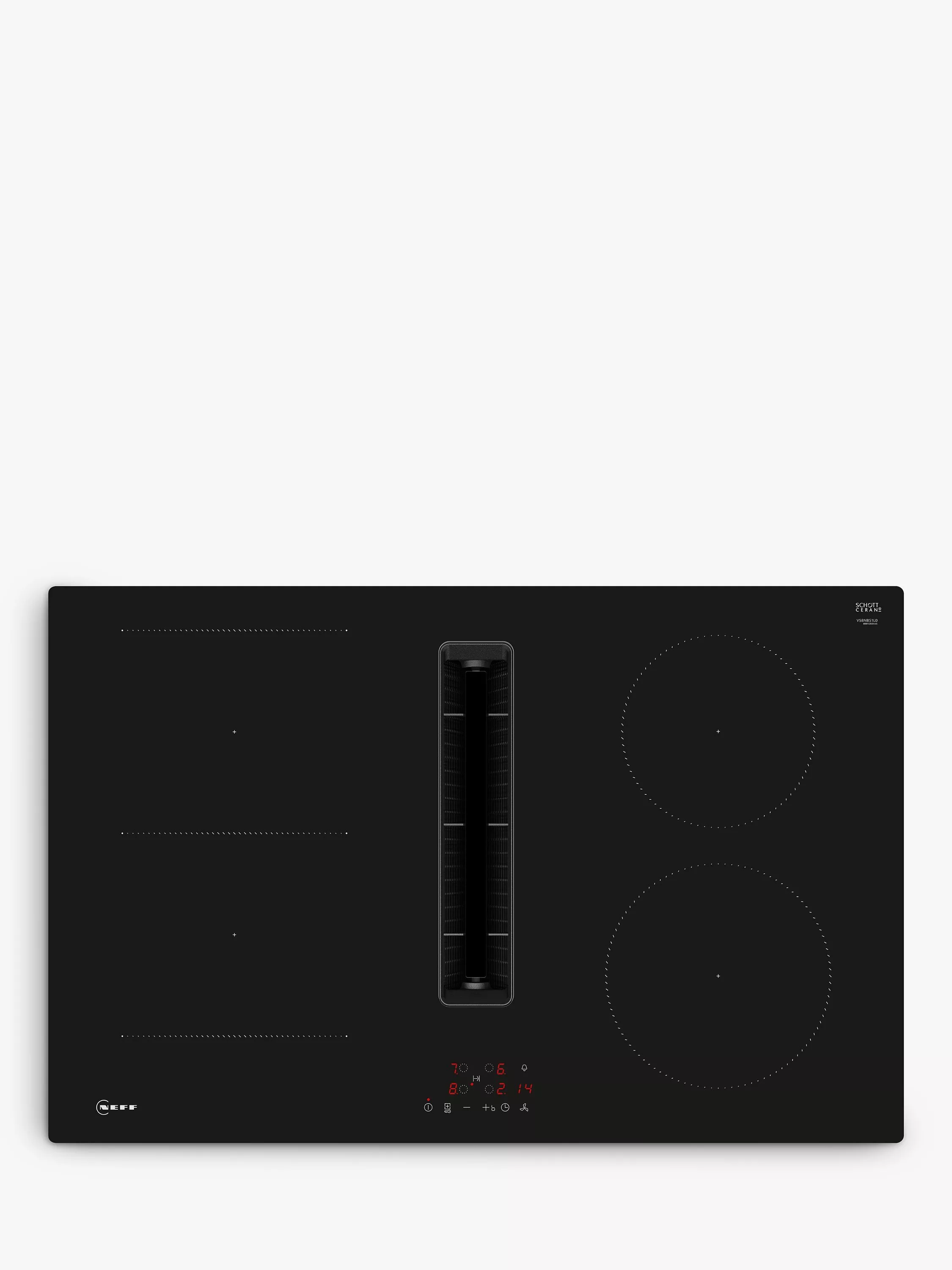 This Neff hob with integrated ventilation combines two appliances in one for a clear view while cooking. Induction technology gives you instant, precise temperature control, boiling water in less than a minute, and it's a cinch to clean up if anything does spill over too. Power boost gives you boiling water super quick, and the touch controls are super simple to use. Combi Induction offers two individual cooking zones or one large combined zone, its High Extraction Rate ensures a clear view while cooking thanks to efficient motor technology, and an optimized motor guarantees a quiet cooking experience.