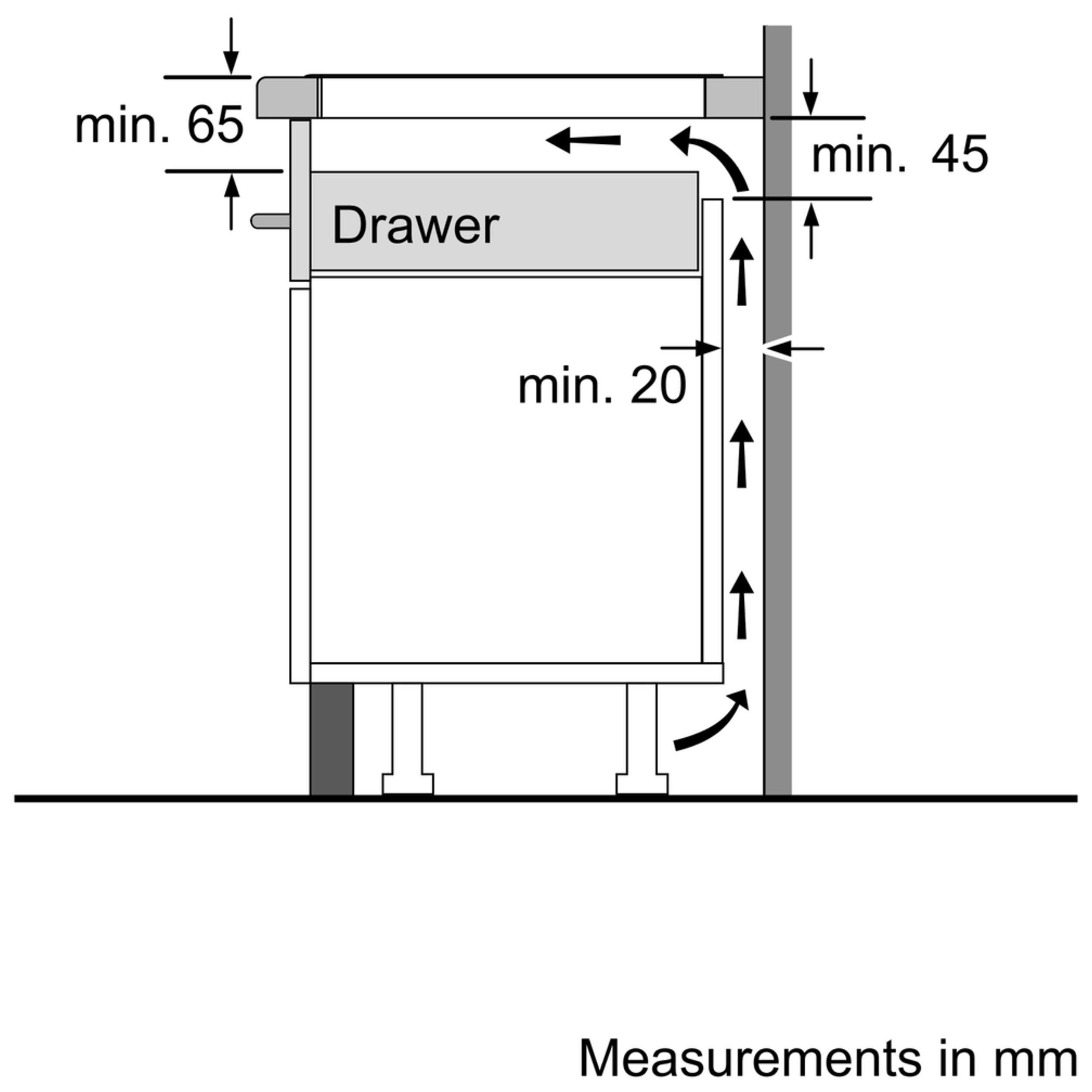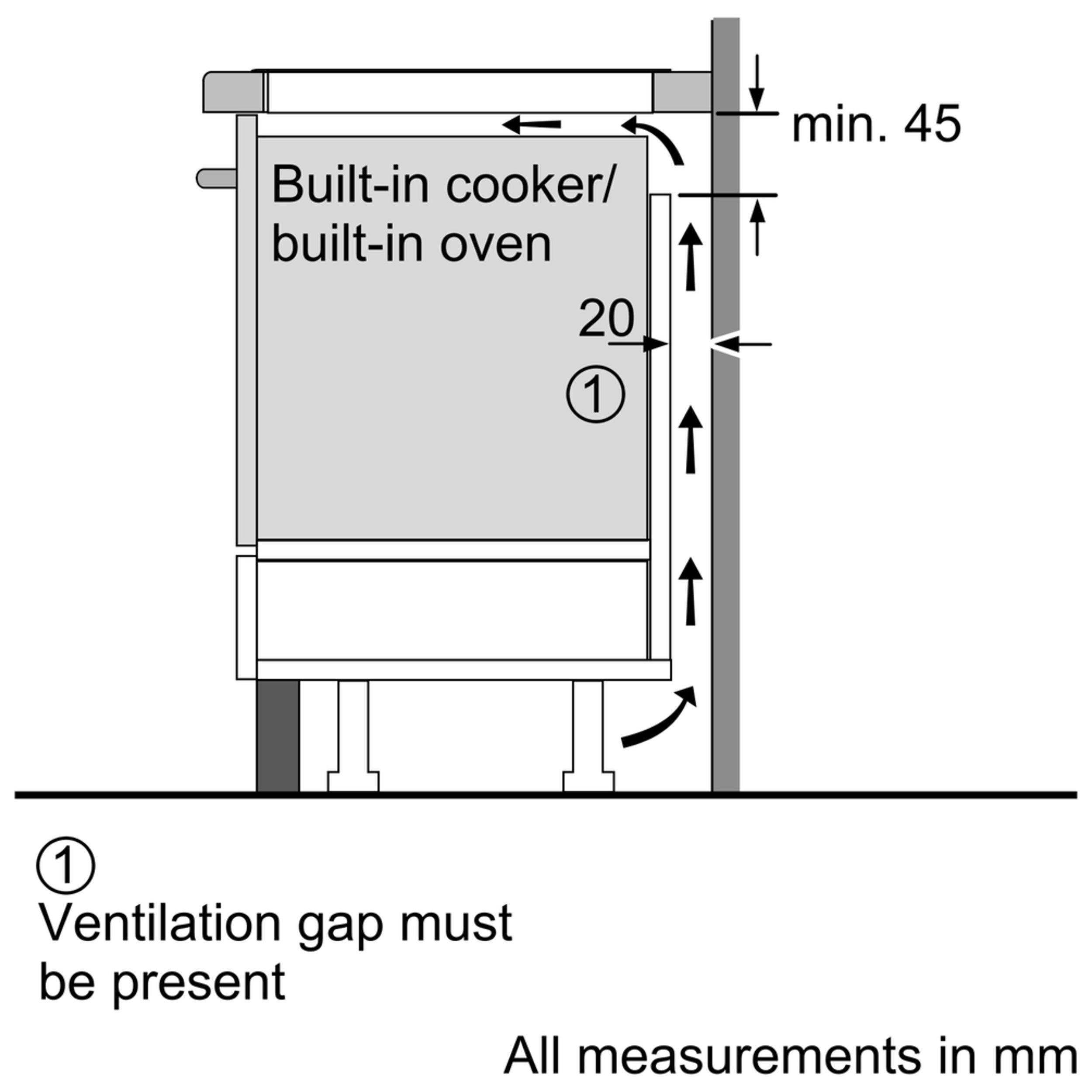Please note: there should be a minimum height clearance of 65cm between an electric hob and the cooker hood above it.