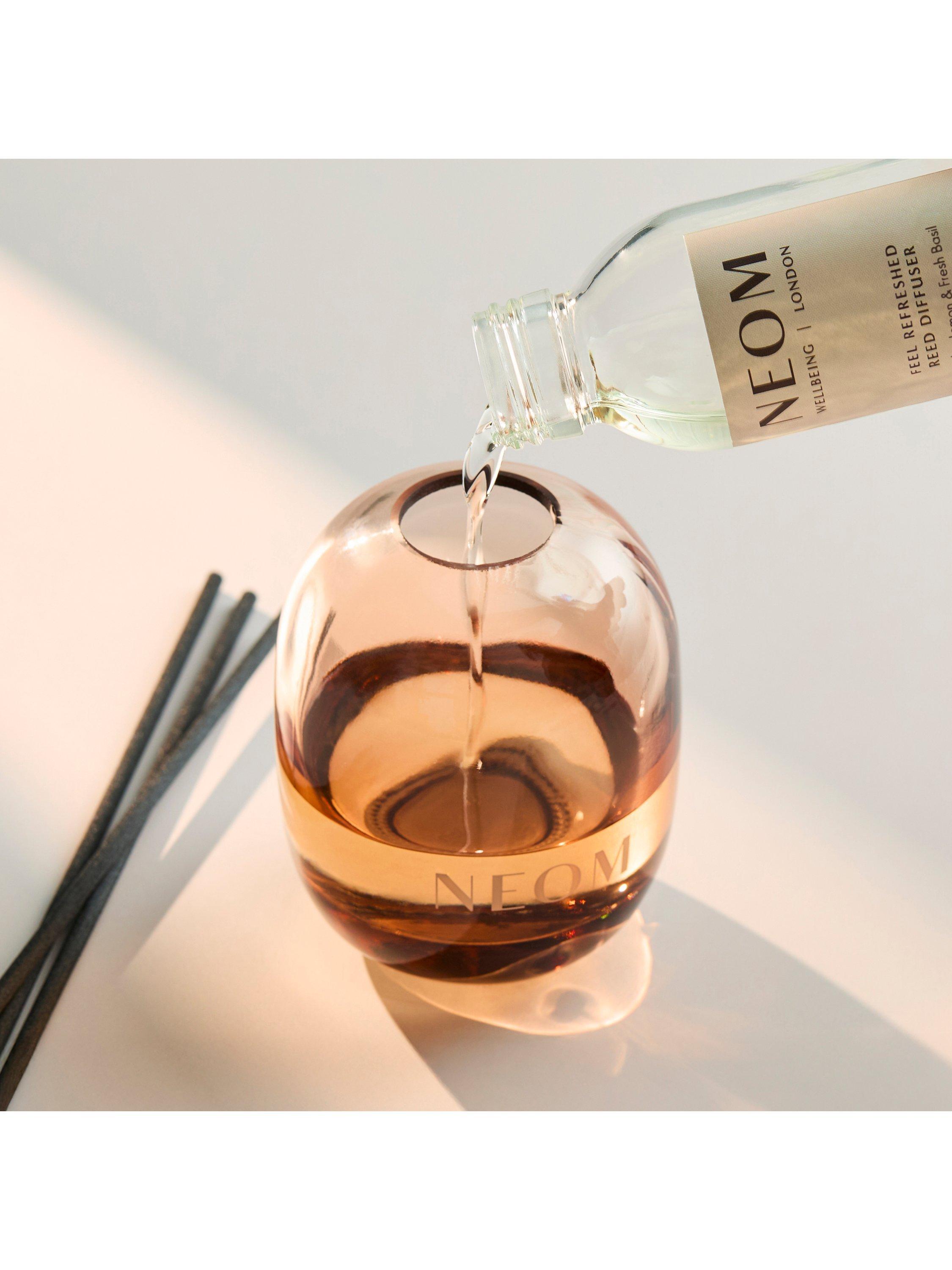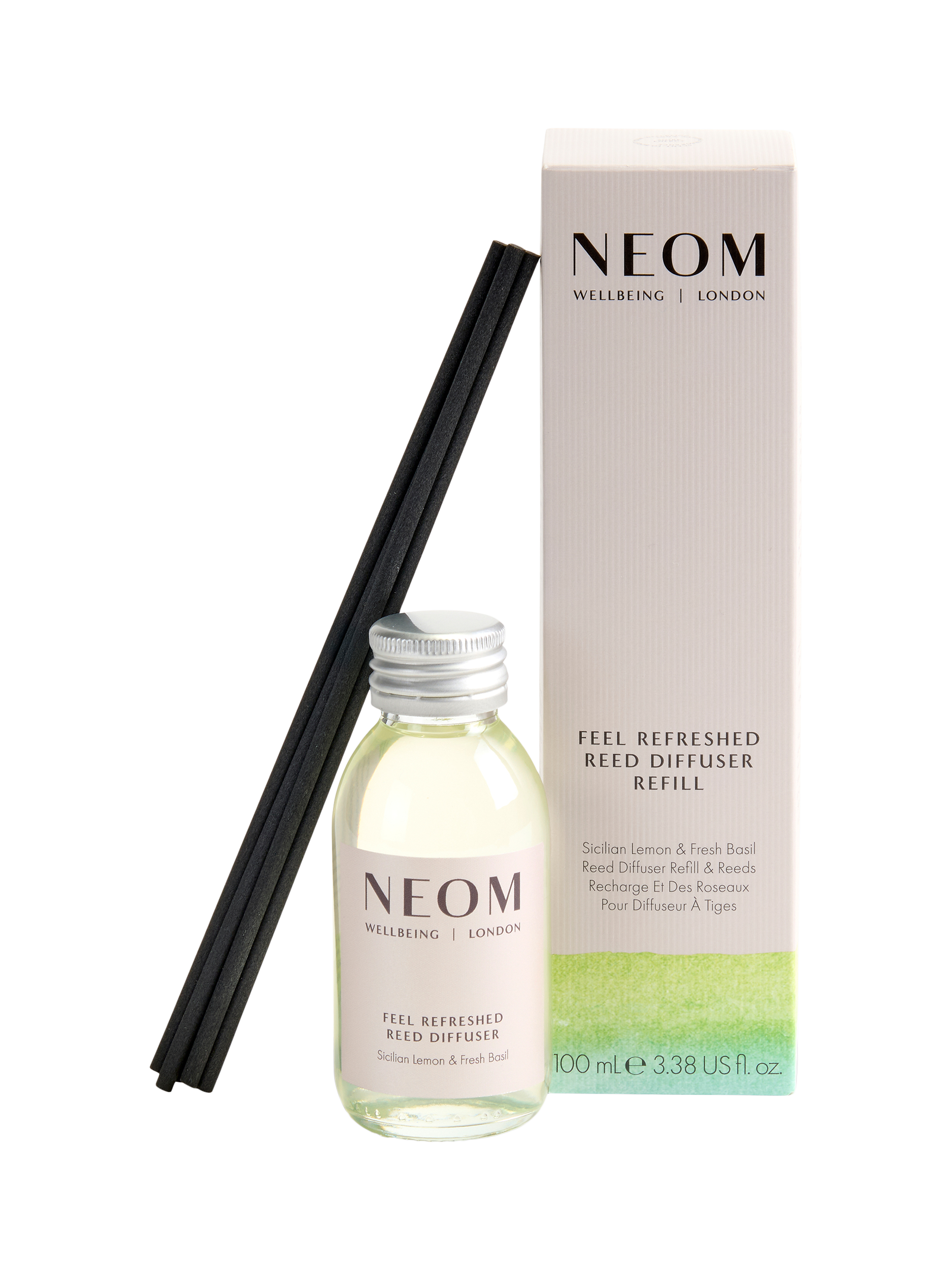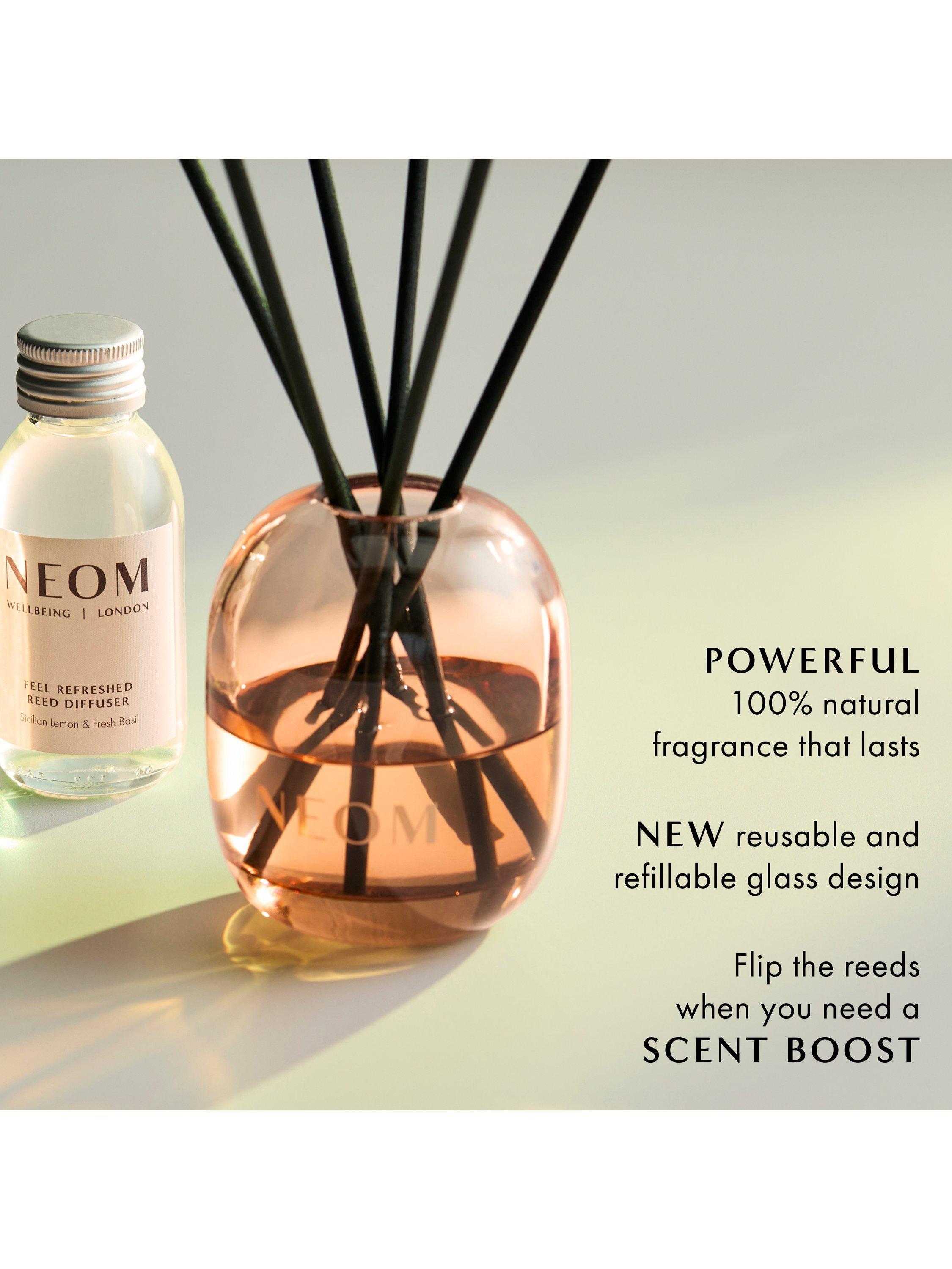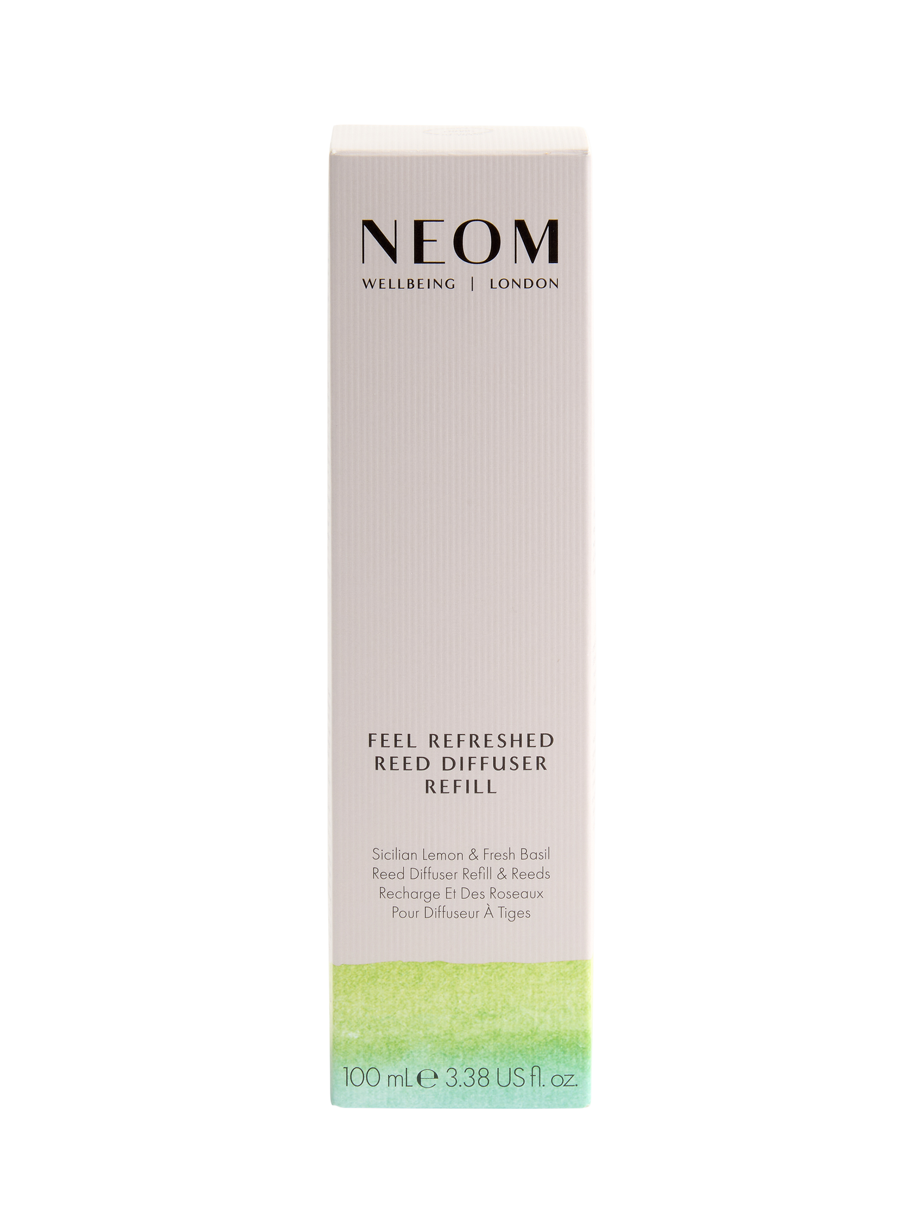 NEOM Feel Refreshed fragrance is a complex blend of 17 pure essential oils, including Sicilian lemon and fresh basil, all chosen to help stimulate a tired mind and encourage clear thinking. For unlimited moments of wellbeing, reuse and refill your beautiful glass vessel with any NEOM fragrance.
