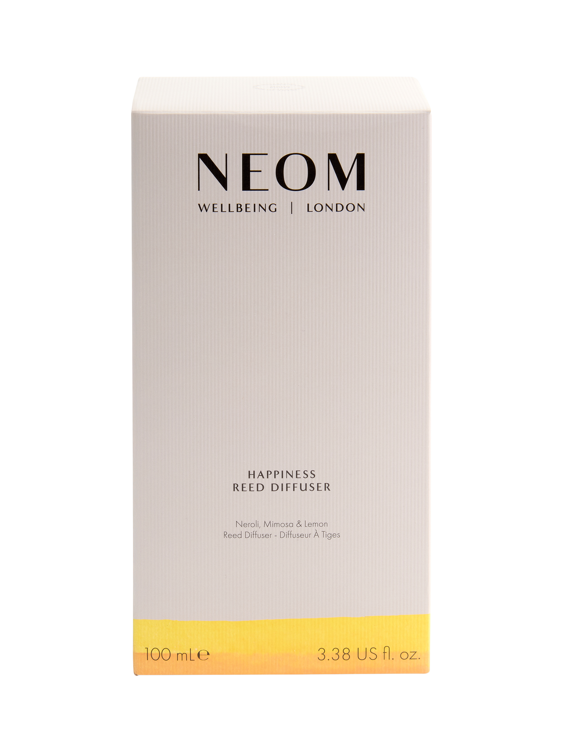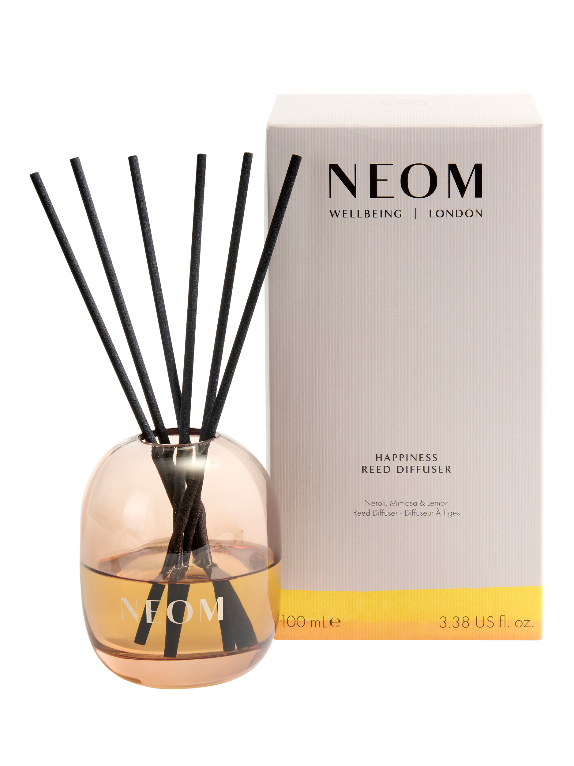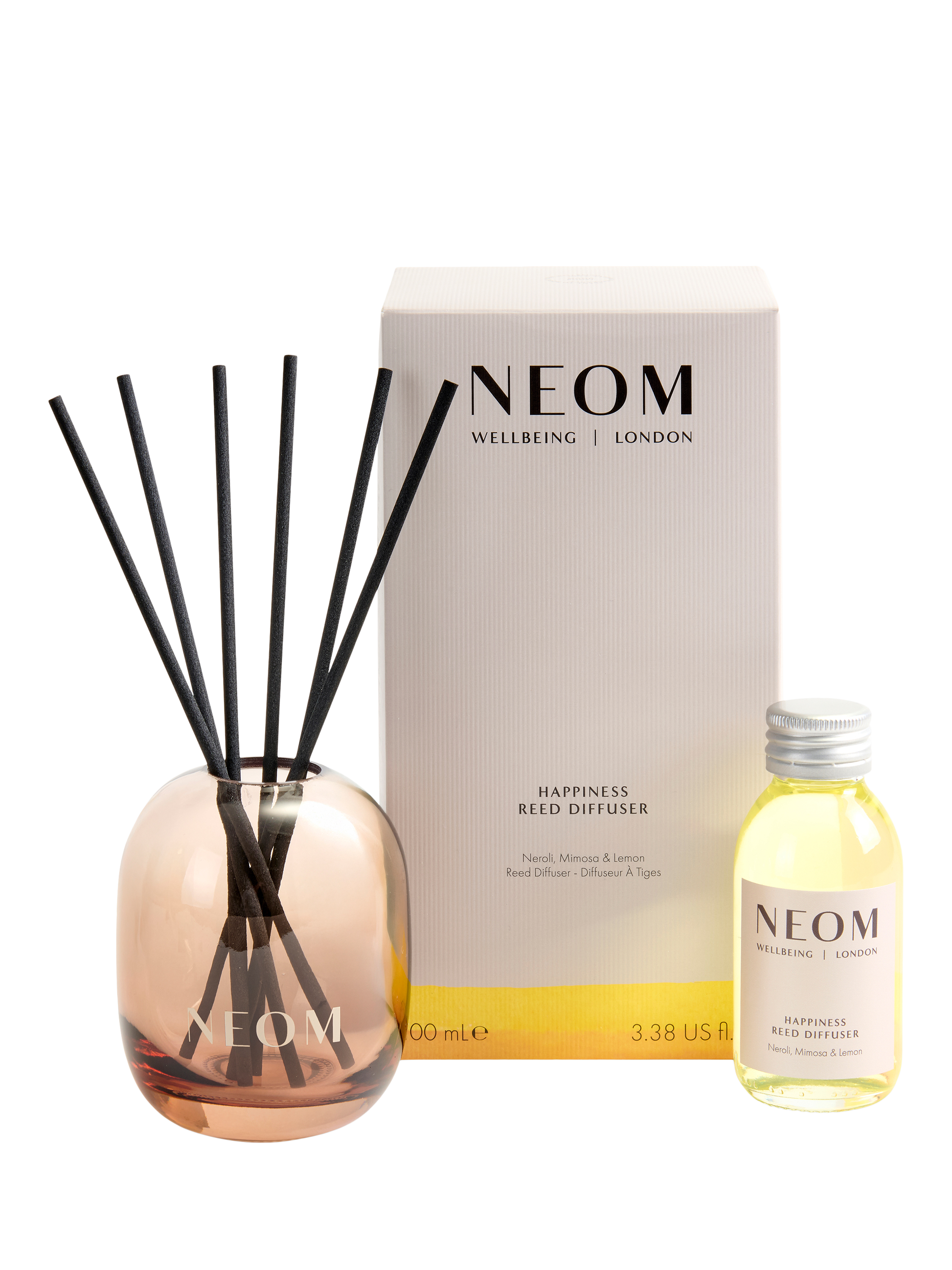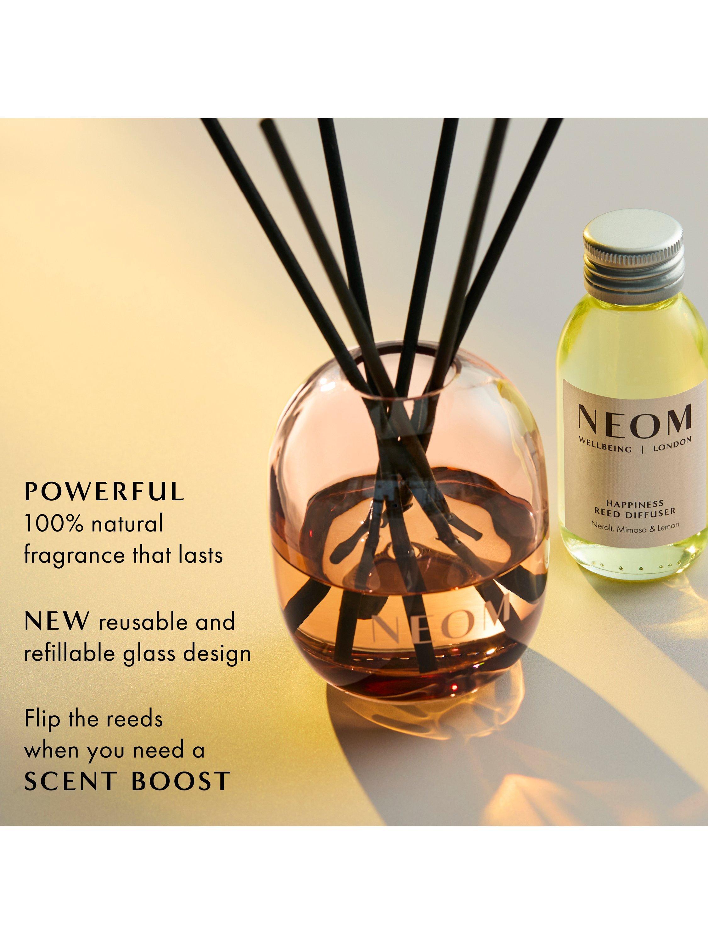NEOM Happiness fragrance is a complex blend of 11 pure essential oils, including neroli, mimosa and lemon, all expertly blended to boost your mood. For unlimited moments of wellbeing, reuse and refill your beautiful glass vessel with any NEOM fragrance.