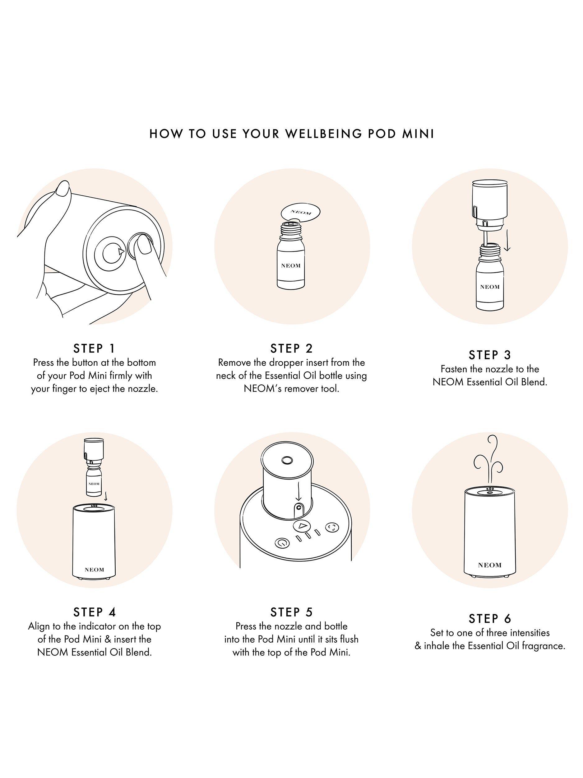 Simply place your favourite NEOM Essential Oil Blend inside the Pod Mini. Using cold diffusion technology, essential oils are converted into micro fine vapour without using heat or water and released into the atmosphere to stimulate your senses and boost your wellbeing. The NEOM Wellbeing Pod Mini is battery operated and comes with a USB cable for charging.