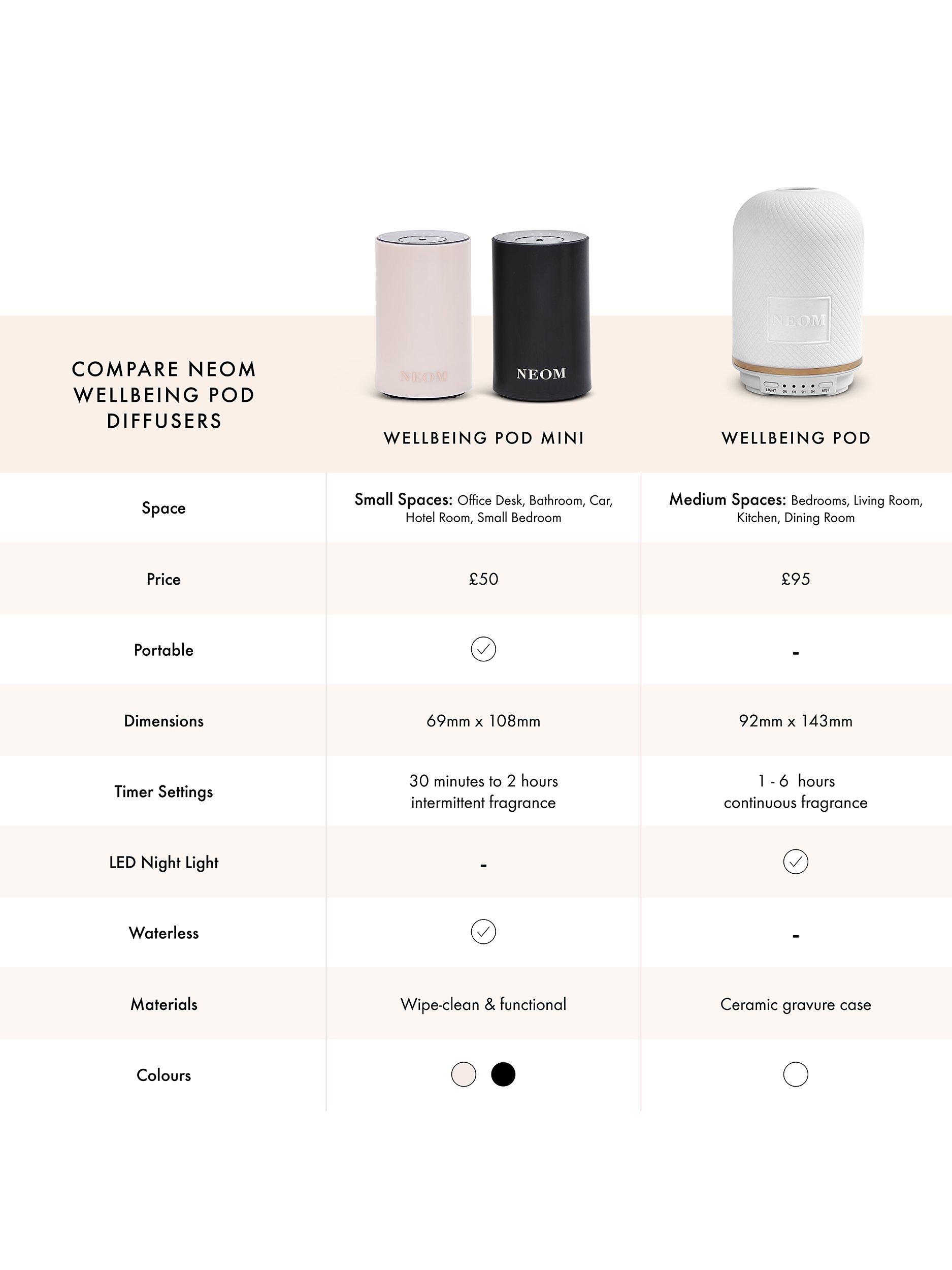 Discover the NEOM Wellbeing Pod Mini. Designed to scent little spaces (think car, home office, bathrooms...) in minutes. Whatever your wellbeing need, the NEOM Wellbeing Pod Mini works at the touch of a button, helping you achieve better sleep, less stress, more energy or a mood boost through our 100% natural Essential Oil Blends