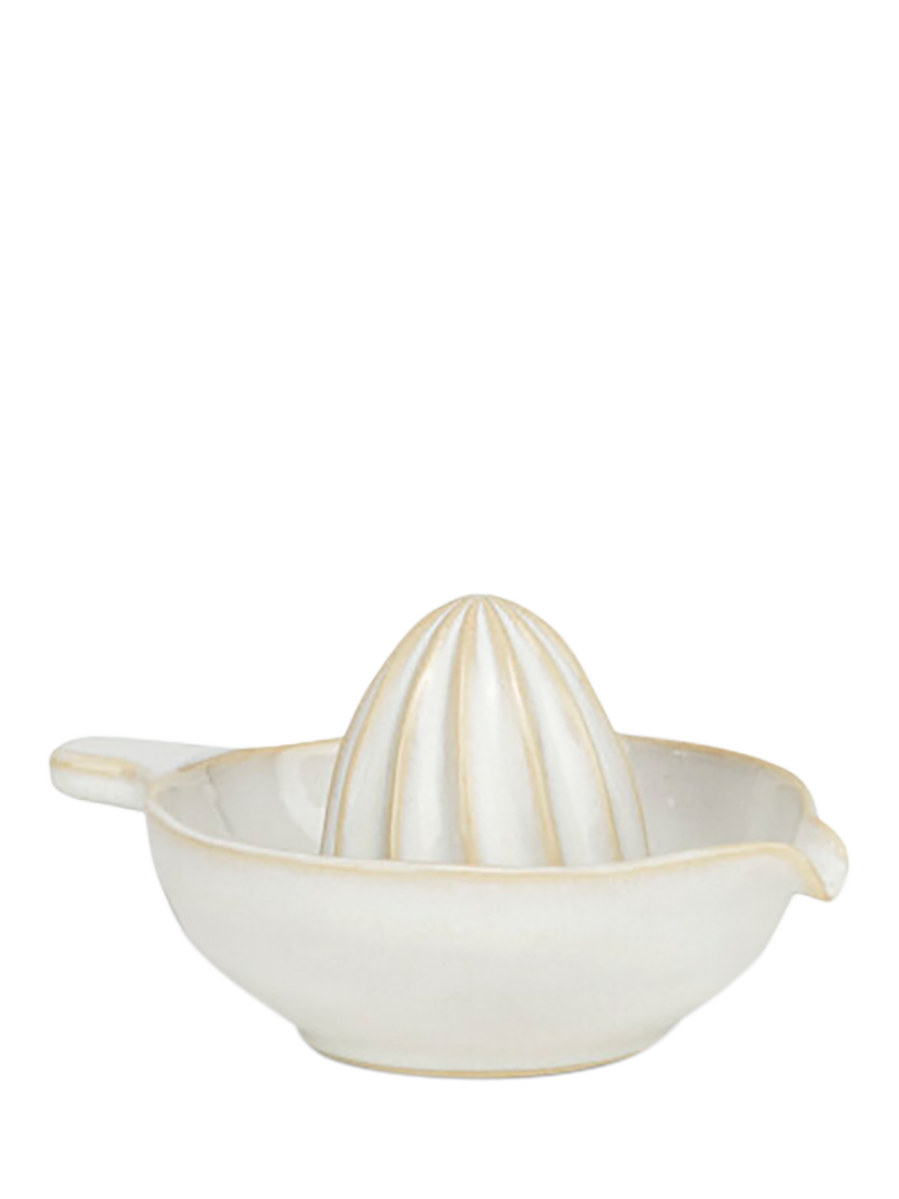 Crafted from durable stoneware by skilled artisans in Portugal, the white Bramley lemon juicer is finished with a hand-applied reactive glaze that creates a unique speckled effect. Designed with practicality in mind, it has a generously sized dish to capture freshly squeezed citrus juice, along with an easy-to-use handle and spout for pouring.