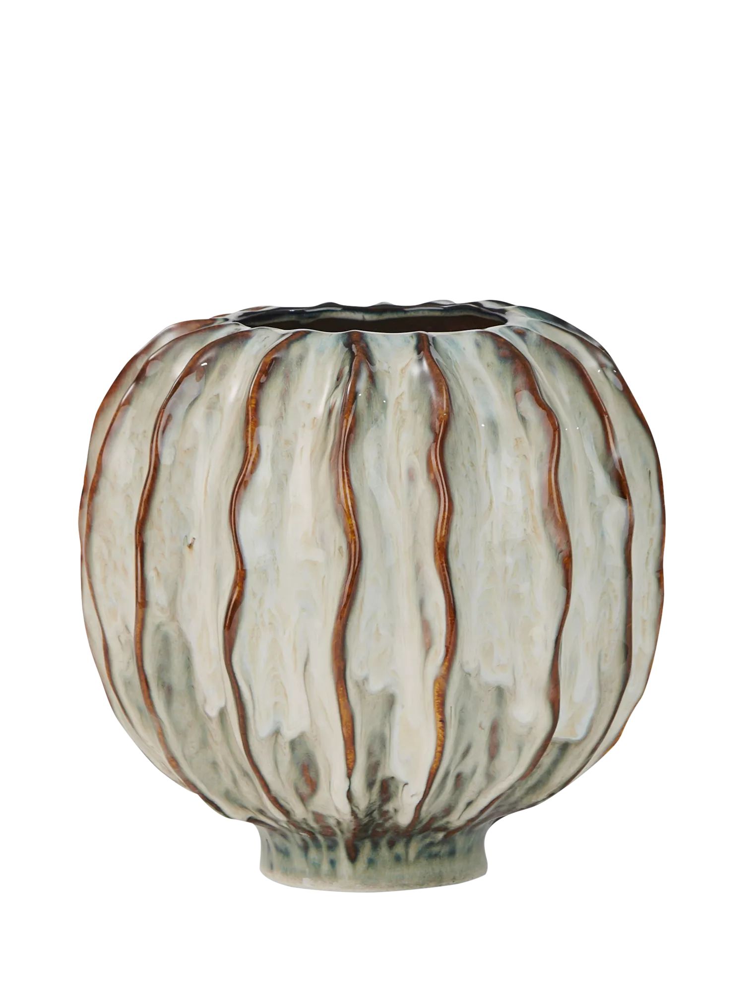 The round Lavington vase is crafted from hardwearing stoneware by skilled artisans in Portugal and moulded into a striking wavy ripple design. The reactive glaze is hand-applied, creating touches of flax blue, neutrals and browns that develop during the kiln-drying process. The process creates slight variations from piece to piece, making each vase unique.