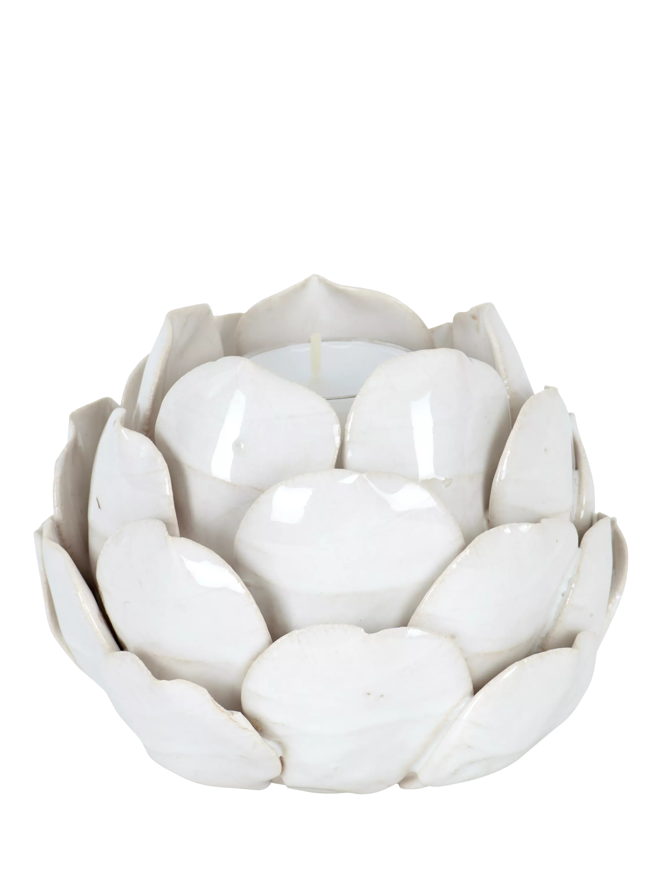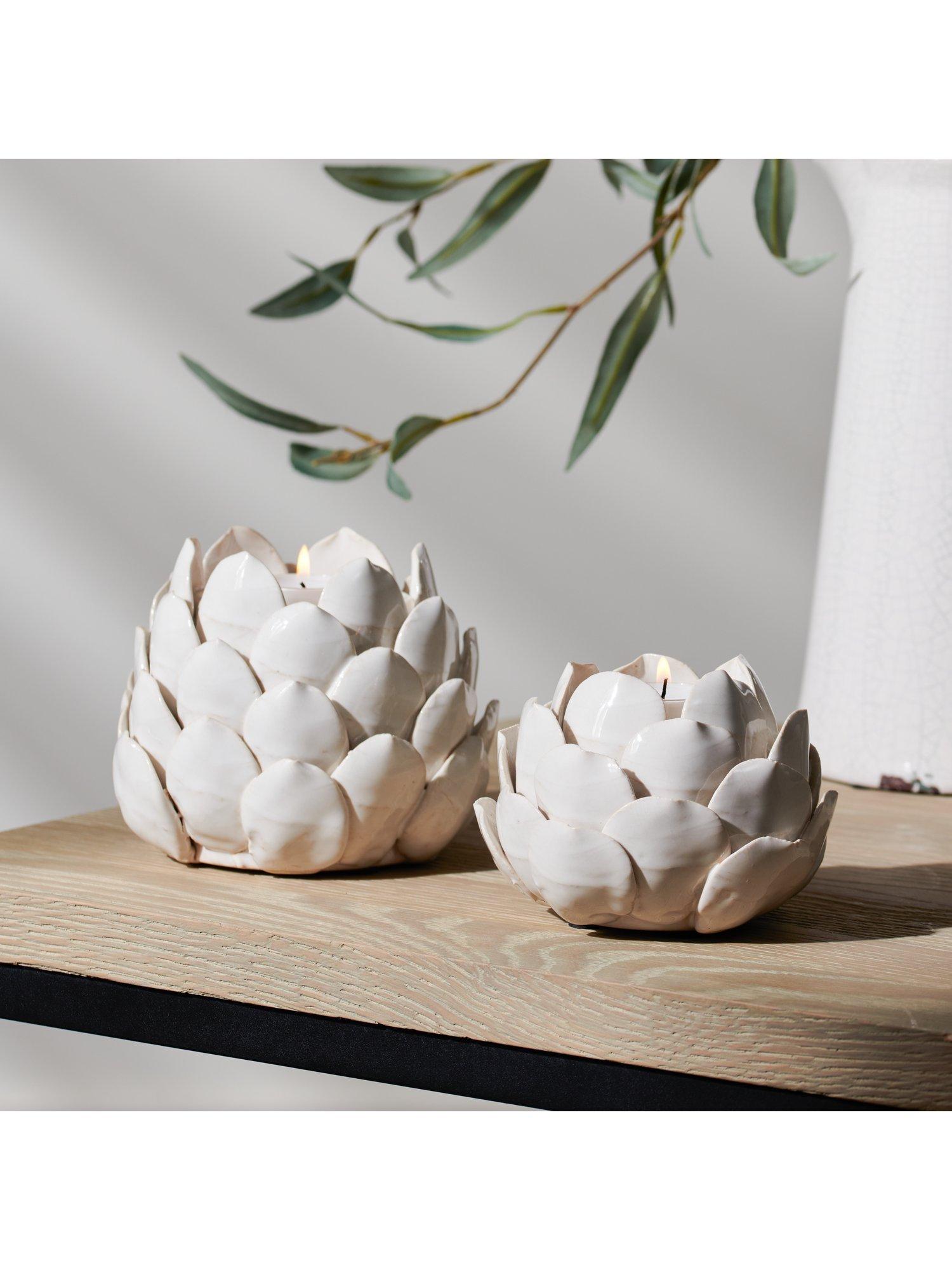 A Suthfield tealight candle holder made from durable stoneware clay, covered in a glossy white glaze. An endearing silhouette with artichoke leaves, creating a contemporary look.