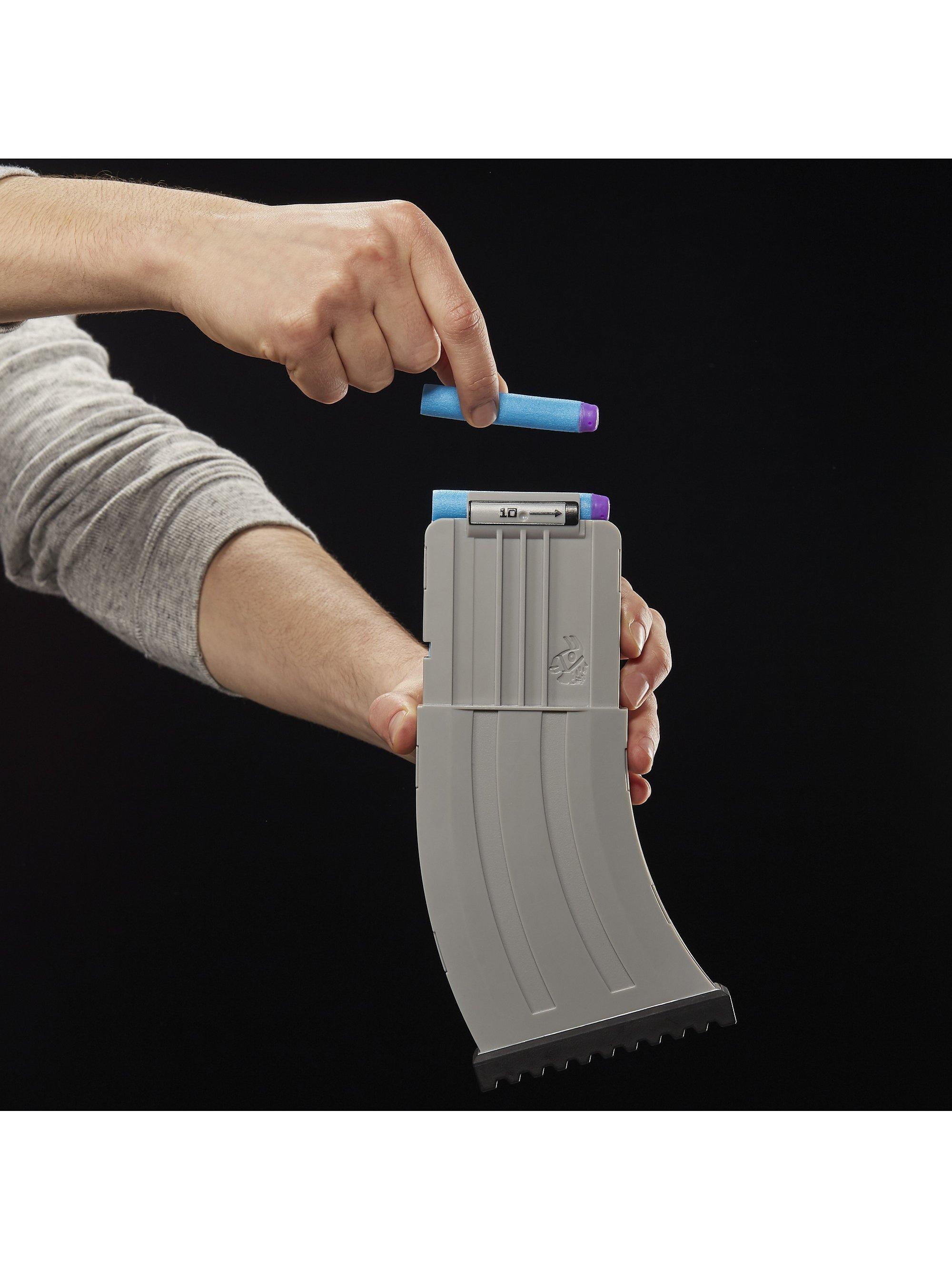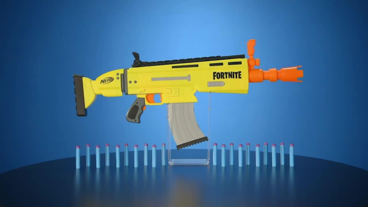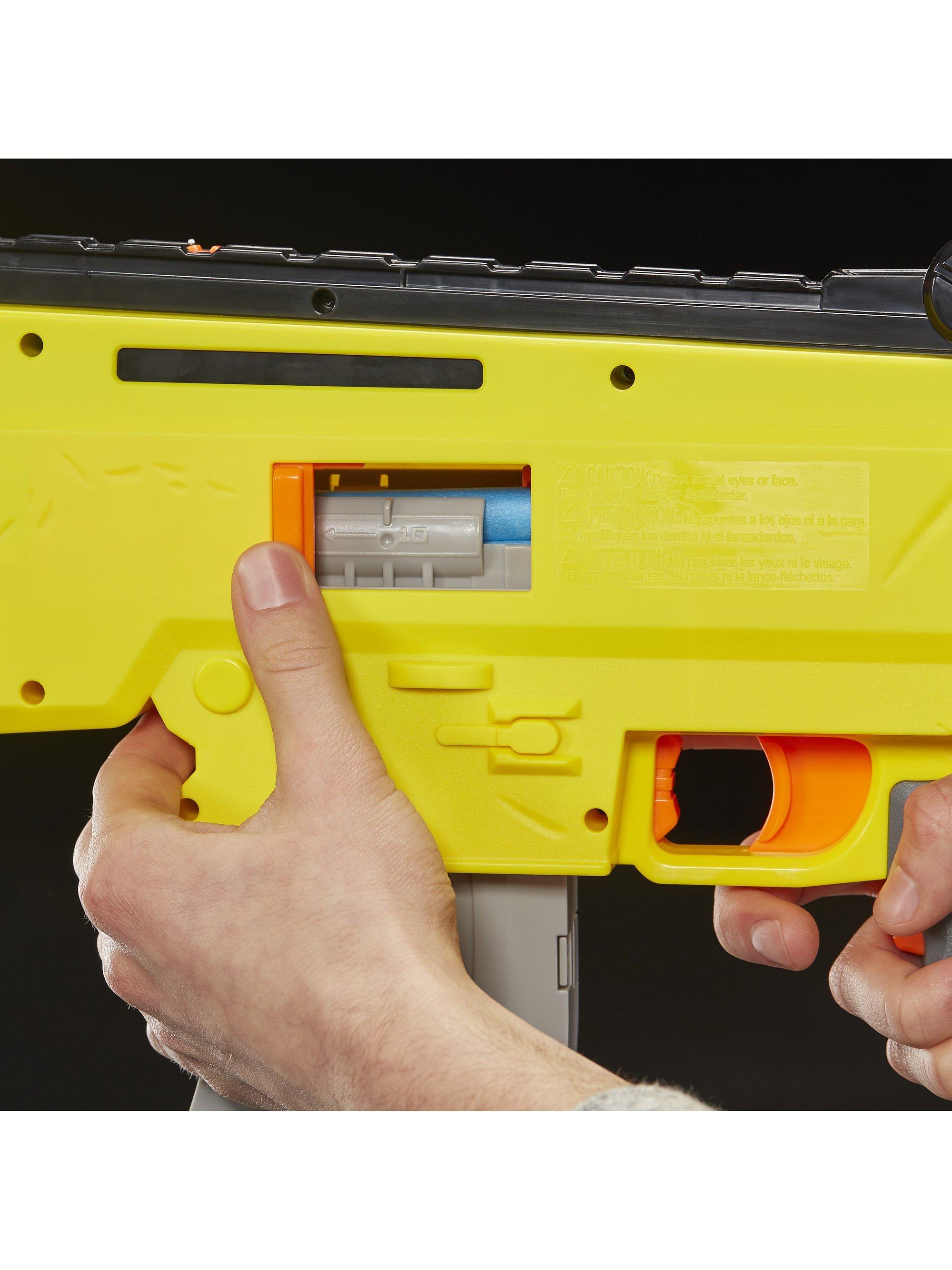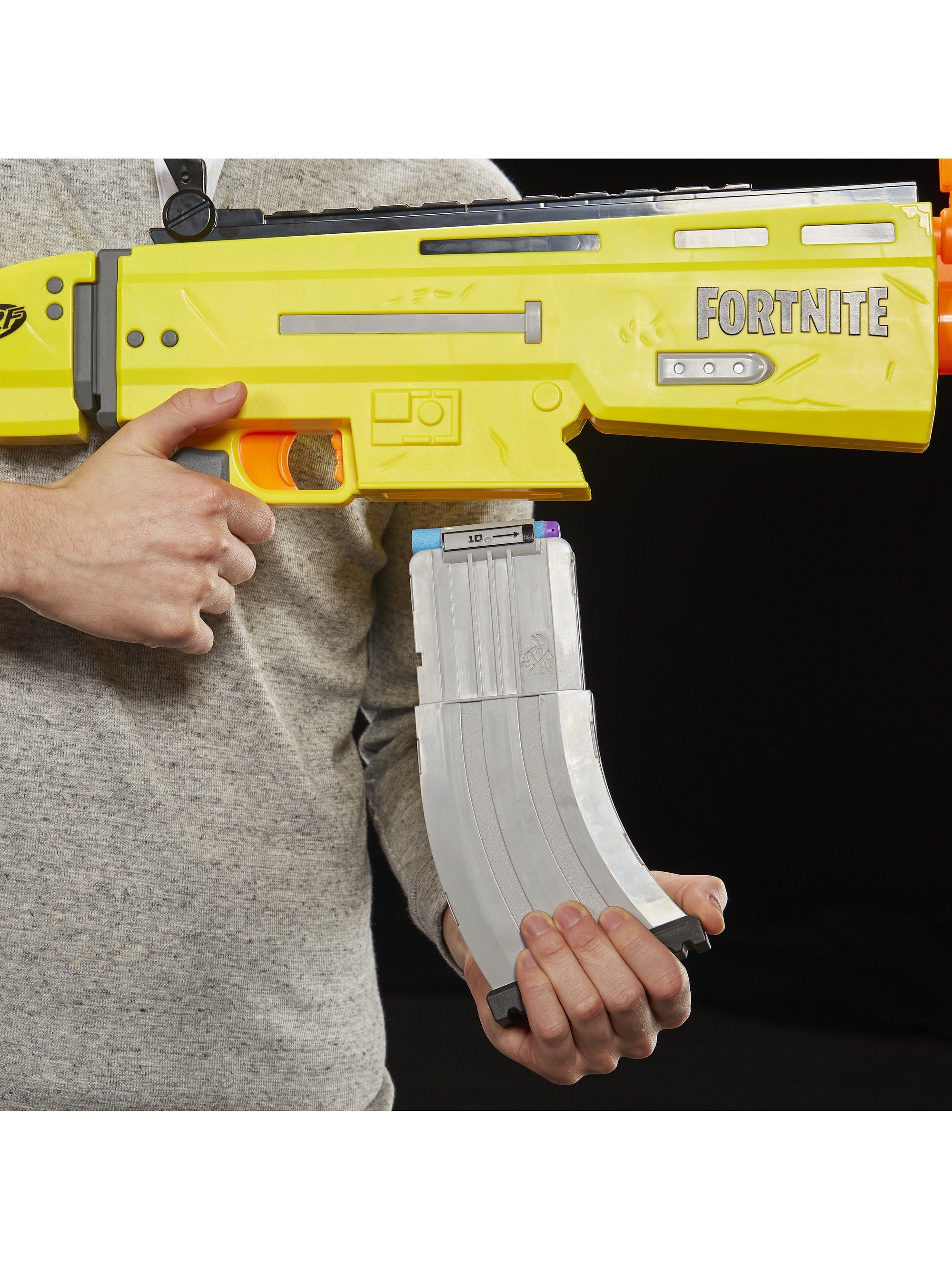 Inspired by the blaster used in Fortnite, replicating the look and colours of the iconic SCAR, it features motorized dart loading and an acceleration button to increase your rate of fire! With a 10-dart clip and 20 Official Nerf Fortnite Elite darts, you've got enough to fully unload the clip and still have 10 backup darts when you need to reload.