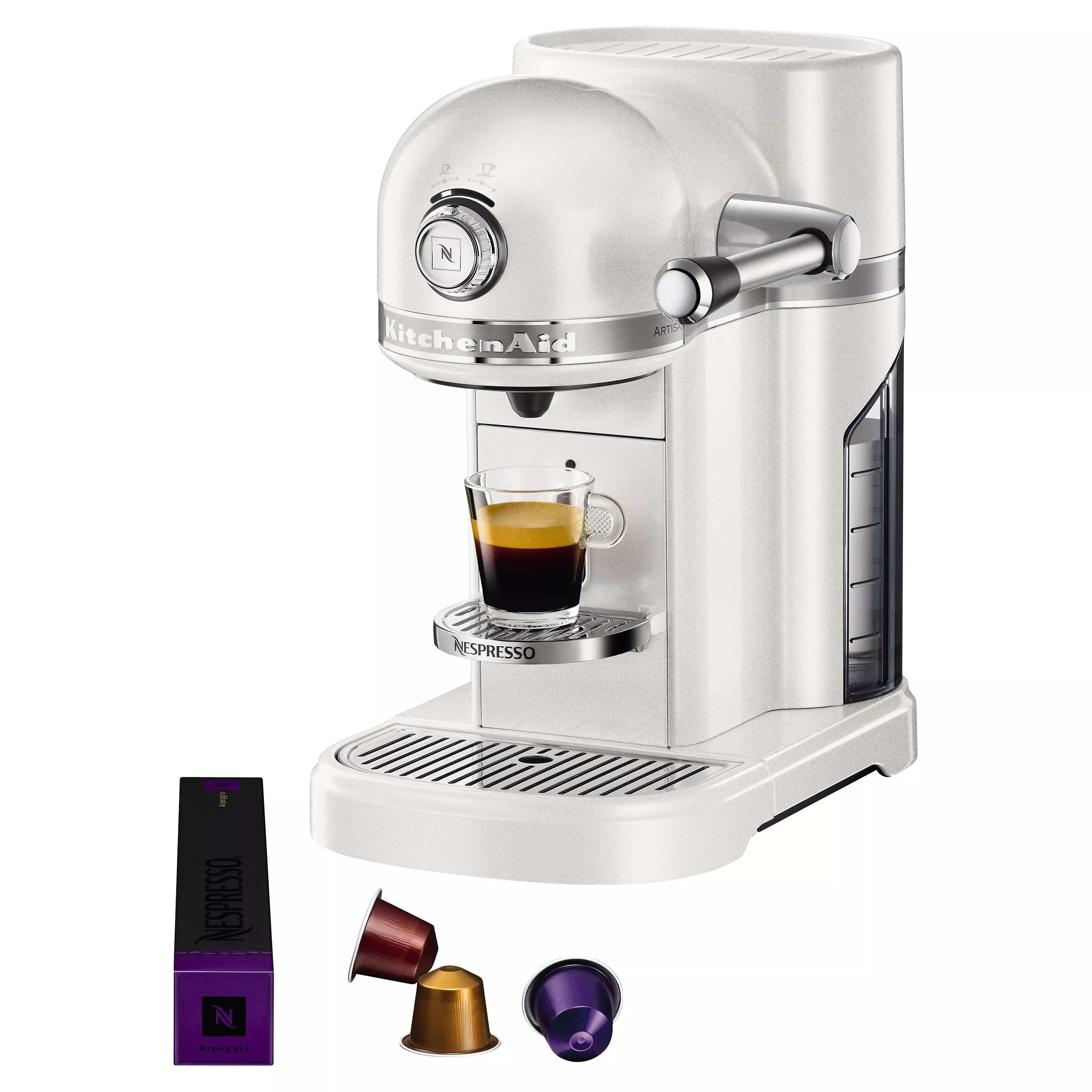 Introducing KitchenAid's Artisan Nespresso coffee machine in premium die-cast metal for a sleek finish, with Nespresso coffee quality included via the 19 bar high pressure system. Several special features include 6 pre-programmed cup sizes, emptying mode for care and cleaning and a descaling mode to make sure all of the hard work is done for you.