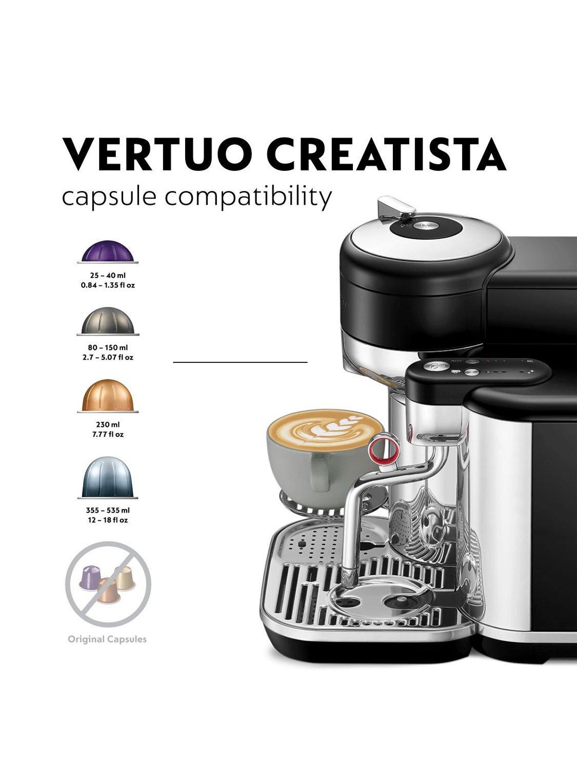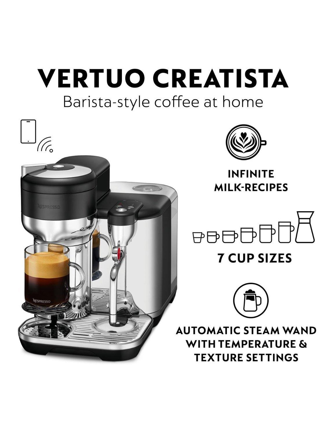 Craft your every milk moment with Vertuo Creatista. With a wide range of coffee options made for different cup sizes, you can indulge in black coffee or create your own milk recipes. Enjoy all your favorites, from small Flat Whites to large Cappuccinos. The integrated steam wand lets you froth your milk and personalize your recipes or try your hand at latte art. You’ll even have the choice between three different temperatures and textures, for coffee and milk that’s always to your taste. All in a premium, stainless-steel design that would fit right in behind a barista’s counter. For creative coffee, crafted at home.