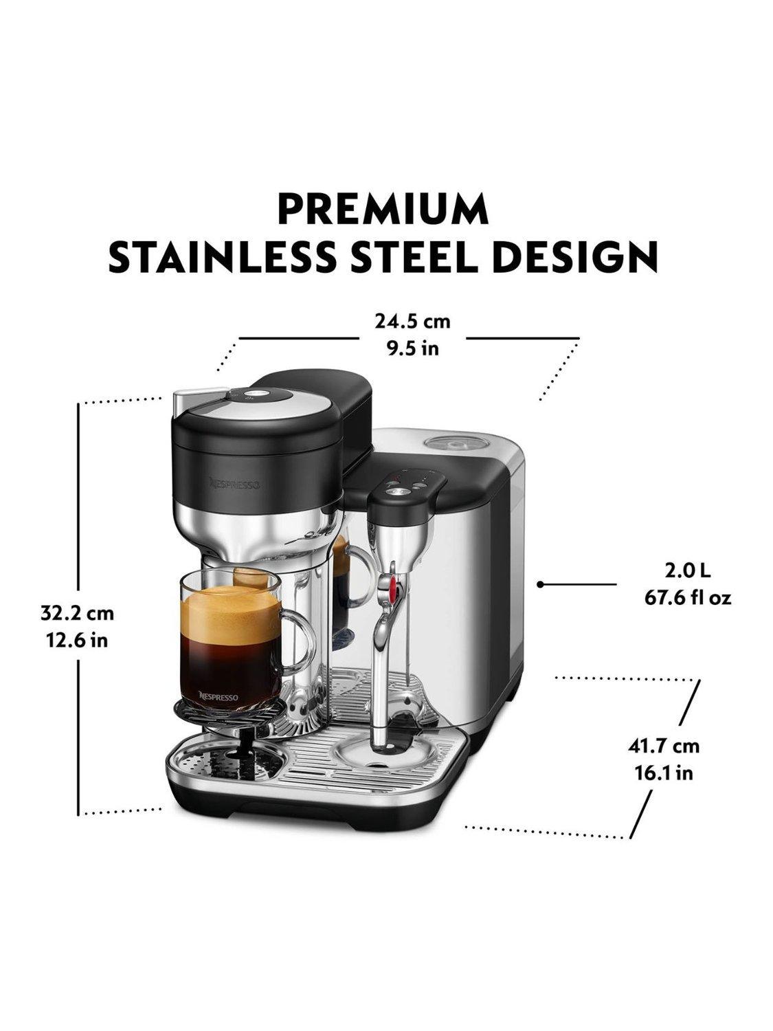 The premium brushed and polished stainless-steel construction allows the Vertuo Creatista to seamlessly integrate into any kitchen. The product design incorporates a small cup support for small drinks, that integrates into the drip tray when not in use. The fully removable drip tray also allows you to brew coffee directly into your favorite travel mug or carafe.