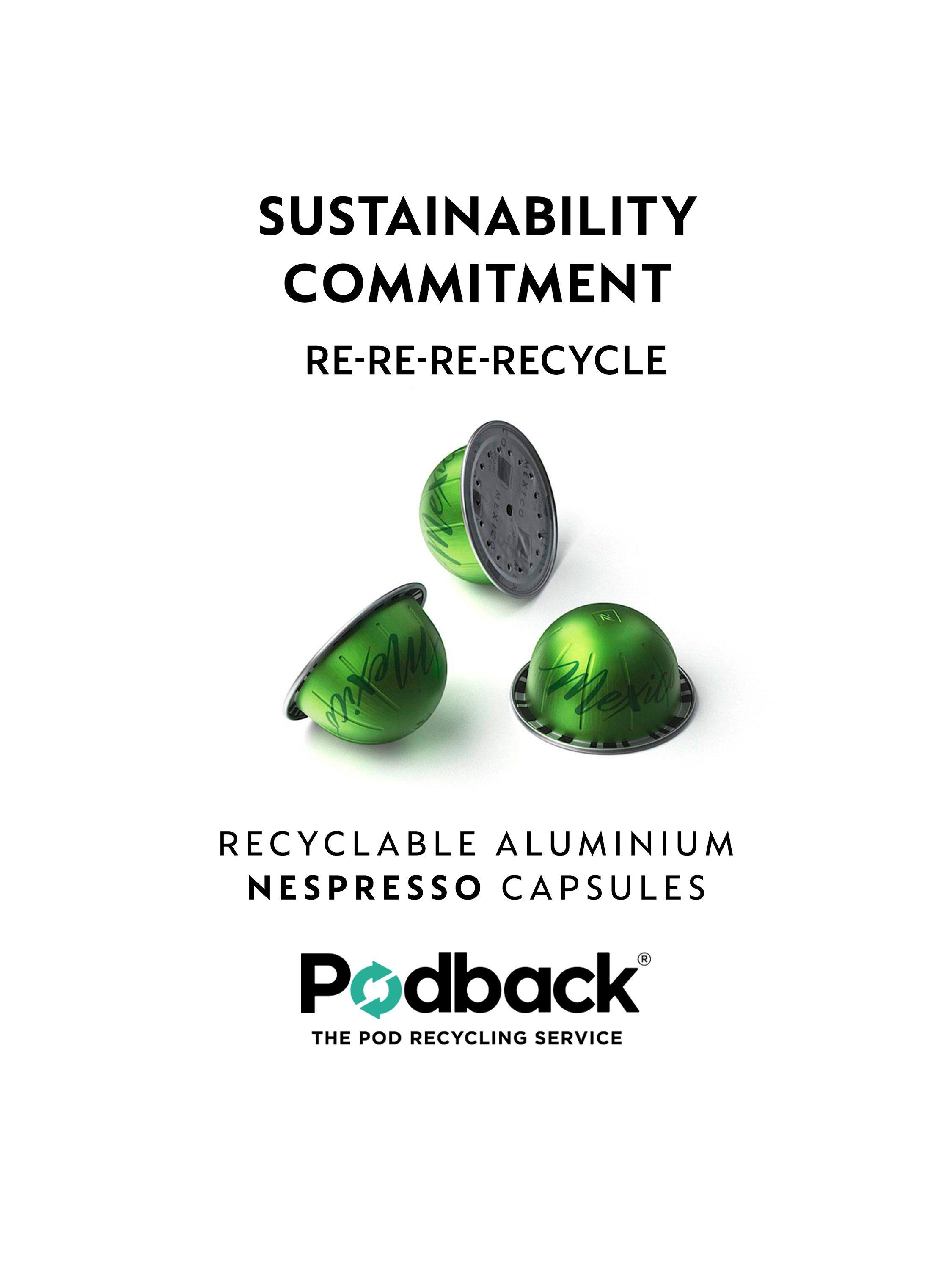 Made from 35% recycled plastic. Nespresso Vertuo pods are made with 85% recycled aluminium and Nespresso's free programme makes recycling your used capsules easy and convenient.