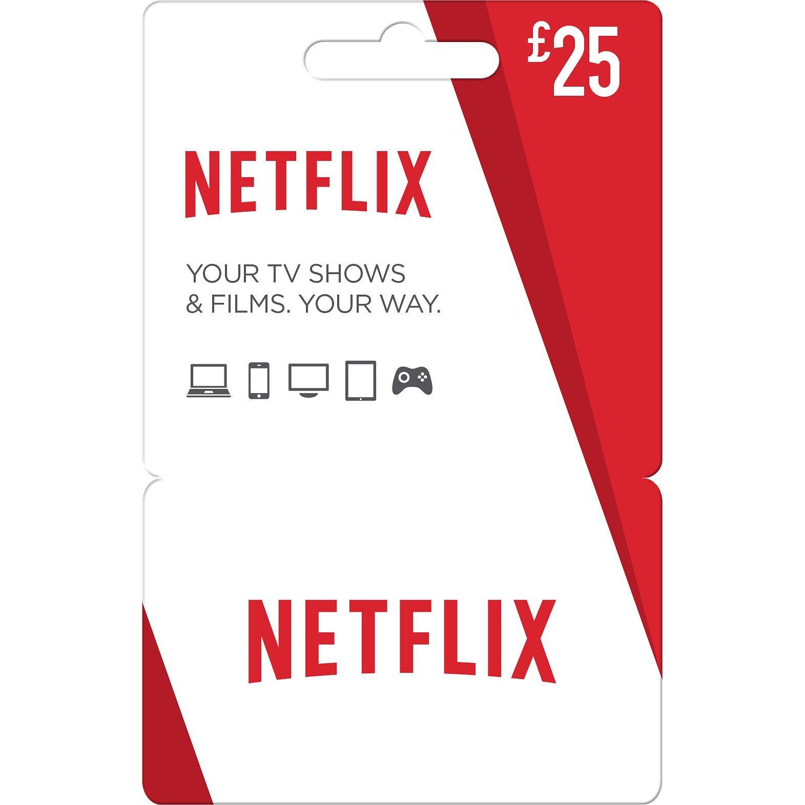 Gift card redeemable for the Netflix subscription service in all countries where the Netflix service is offered in GBP. Requires new or existing Netflix account, subject to prior acceptance of licence and usage terms, and compatible software, hardware and internet access (may be subject to additional fee).