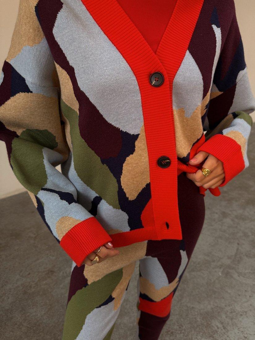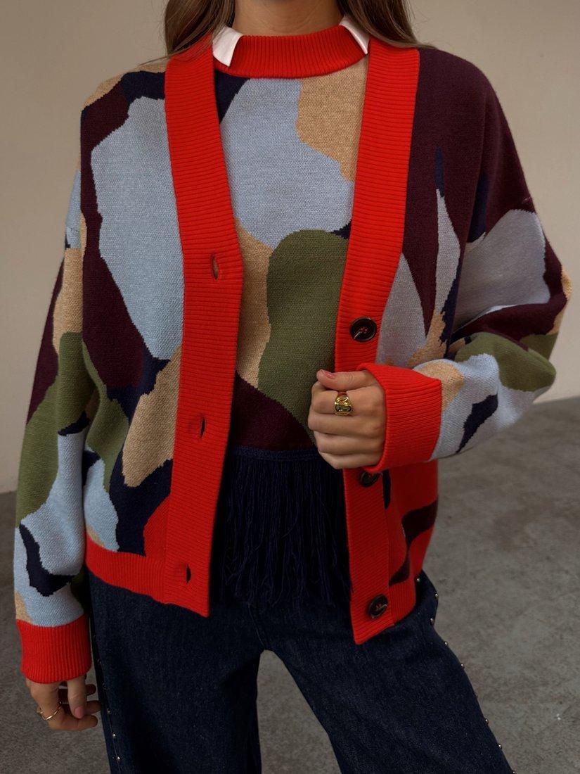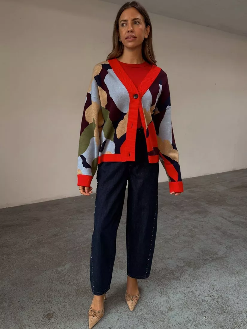 This V-neck cardigan features an abstract pattern and neat button fastening, offering comfort and standout style for everyday wear. Its medium-weight knit keeps you warm, while the versatile length makes it easy to style your way.