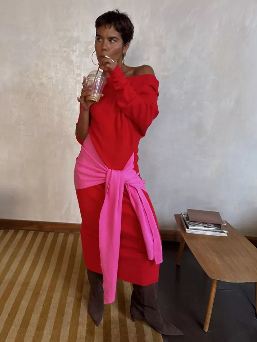 A wardrobe must-have in a straight cut. This long-sleeved midi dress by Never Fully Dressed features a bandeau neckline and lets colours do the talking.