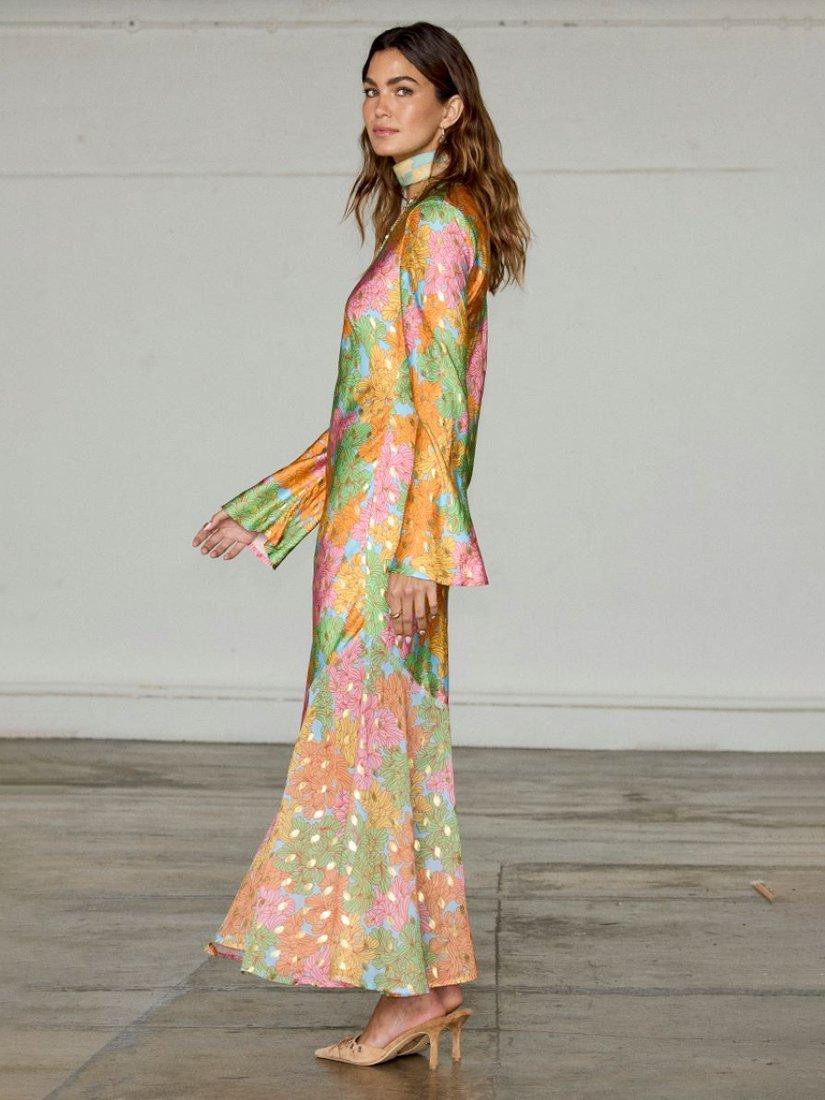 In a simple silhouette with an asymmetric single tiered hem, this floor-length dress from Never Fully Dressed is a vibrant style for summer. Dreamt up from a whisper-weight viscose blend with shiny foil accents on a colourful abstract canvas, it's framed with a round neckline and long fluted sleeves.
