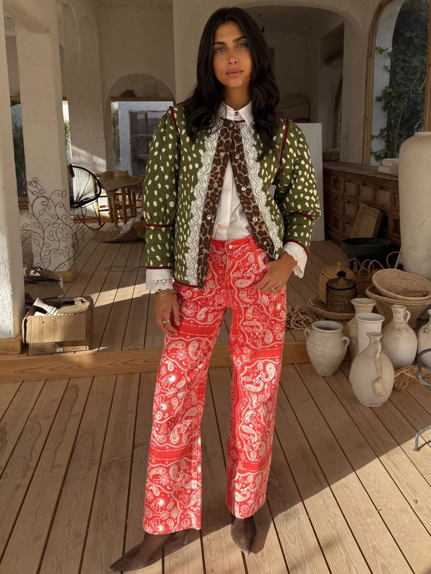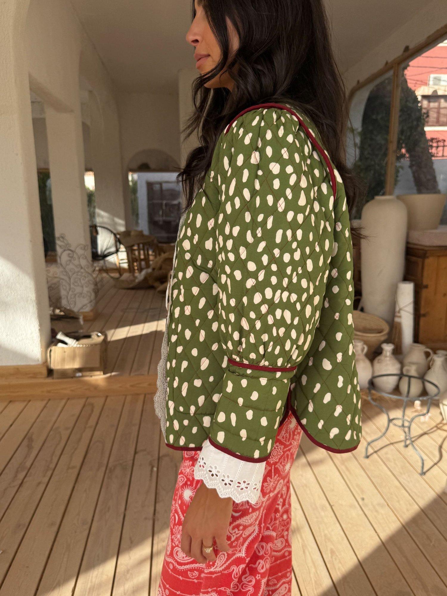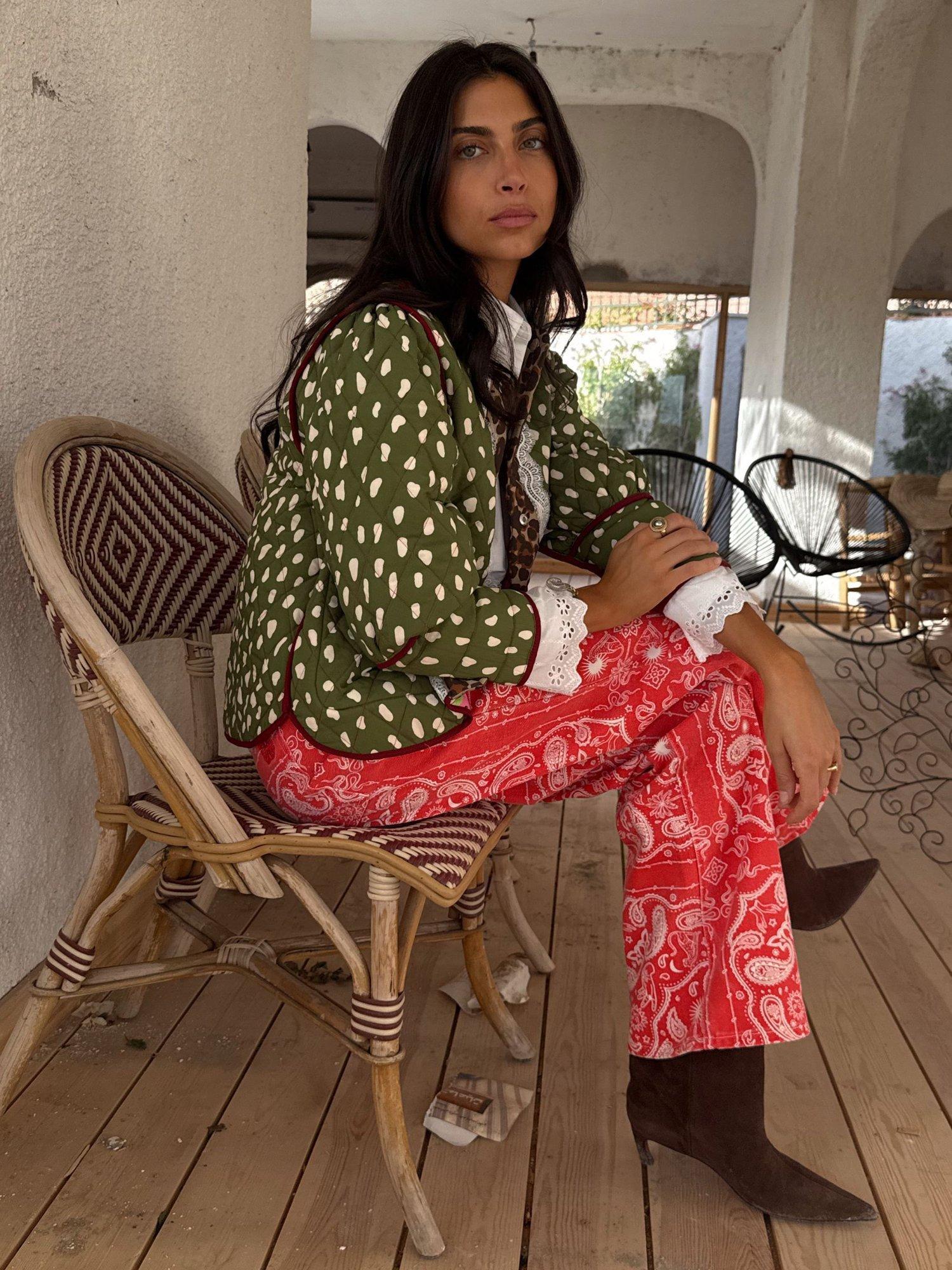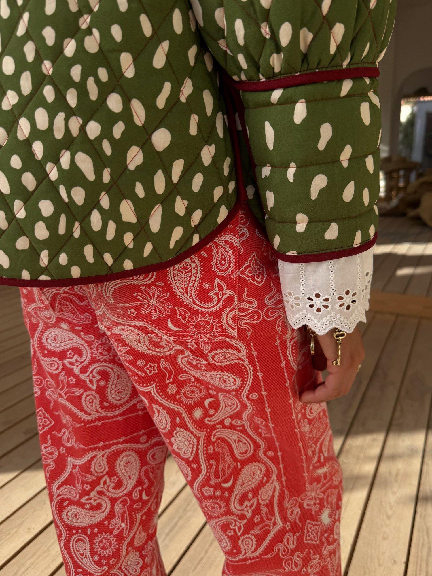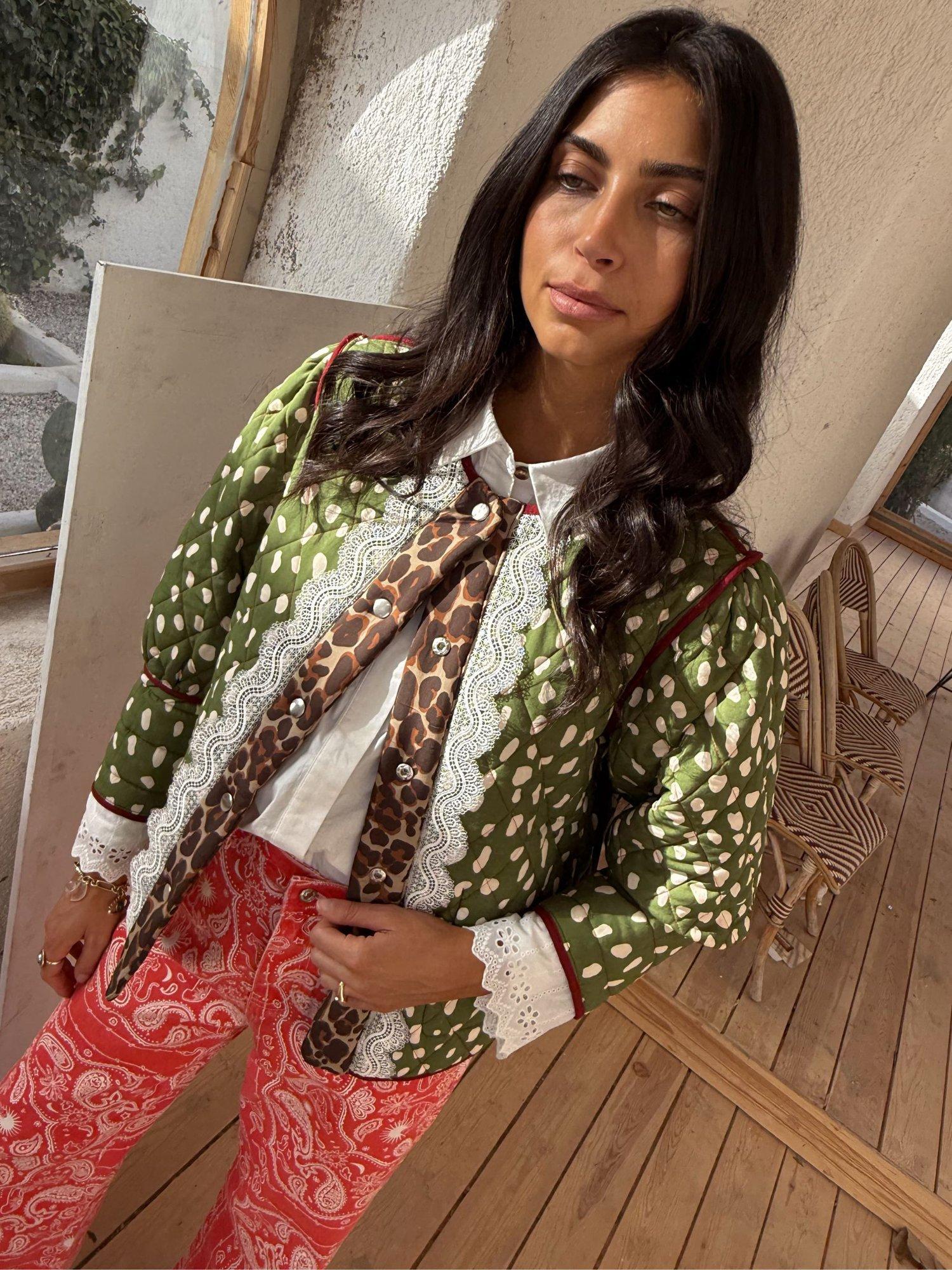 This jacket is an NFD office favourite and a definite must have for your 2026 wardrobe! Two stunning prints, designed in-house, in a quilted fabric. The dallas print featuring abstract cowboy silhouettes and cowgirl motifs on a bright base that reverses into a stunning deer print with trim detailing. With hints of iconic leopard print throughout and intricate lace detailing along the cuffs adding a touch of femininity to the padded structure.