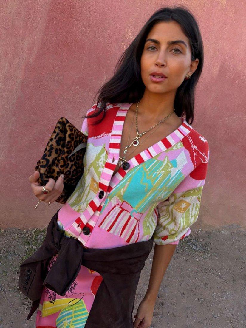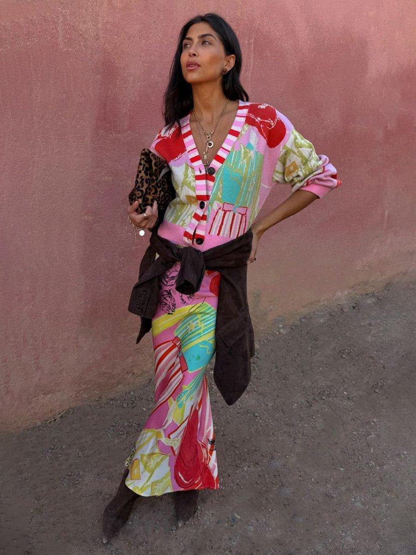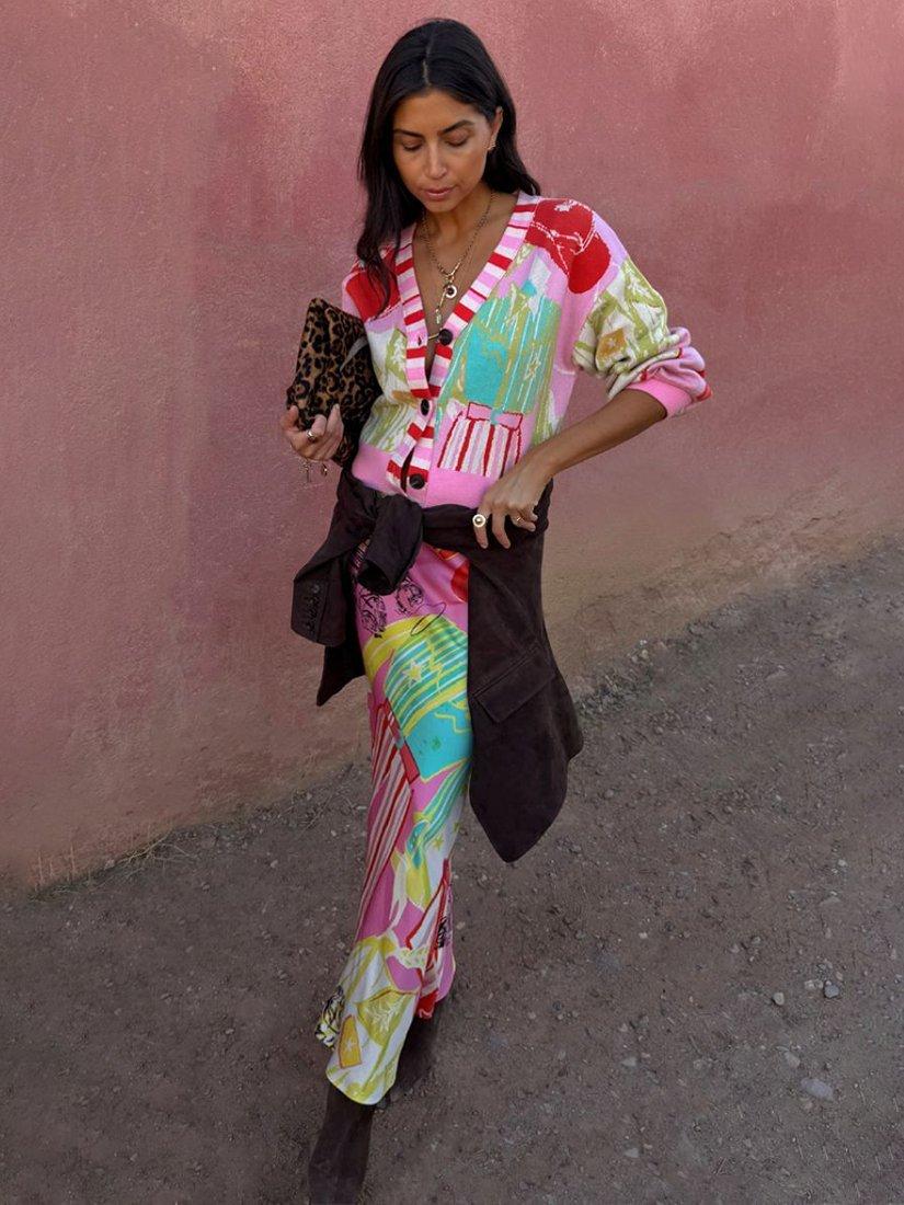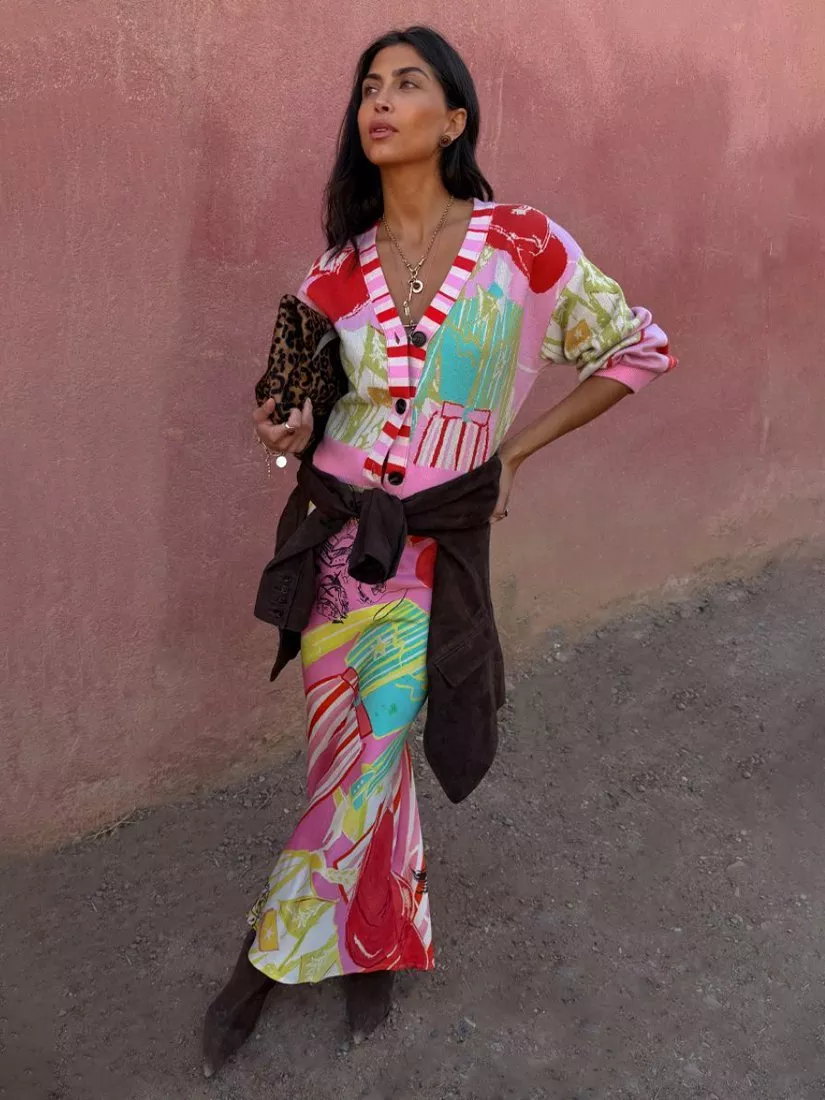 A regular-length V-neck cardigan, featuring a vivid abstract print, striped trim and playful balloon sleeves. All made in a medium-weight for year-round comfort.