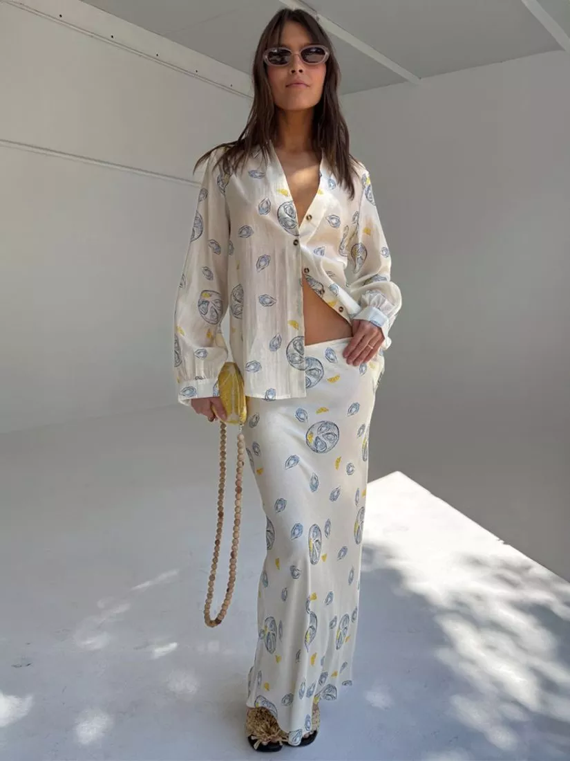 The intricate details in this oyster print combined with the gorgeous base make it the perfect addition to your spring/summer wardrobe! The relaxed silhouette and structure allows you to style with ease, throw over swimwear for sun filled days by the sea.