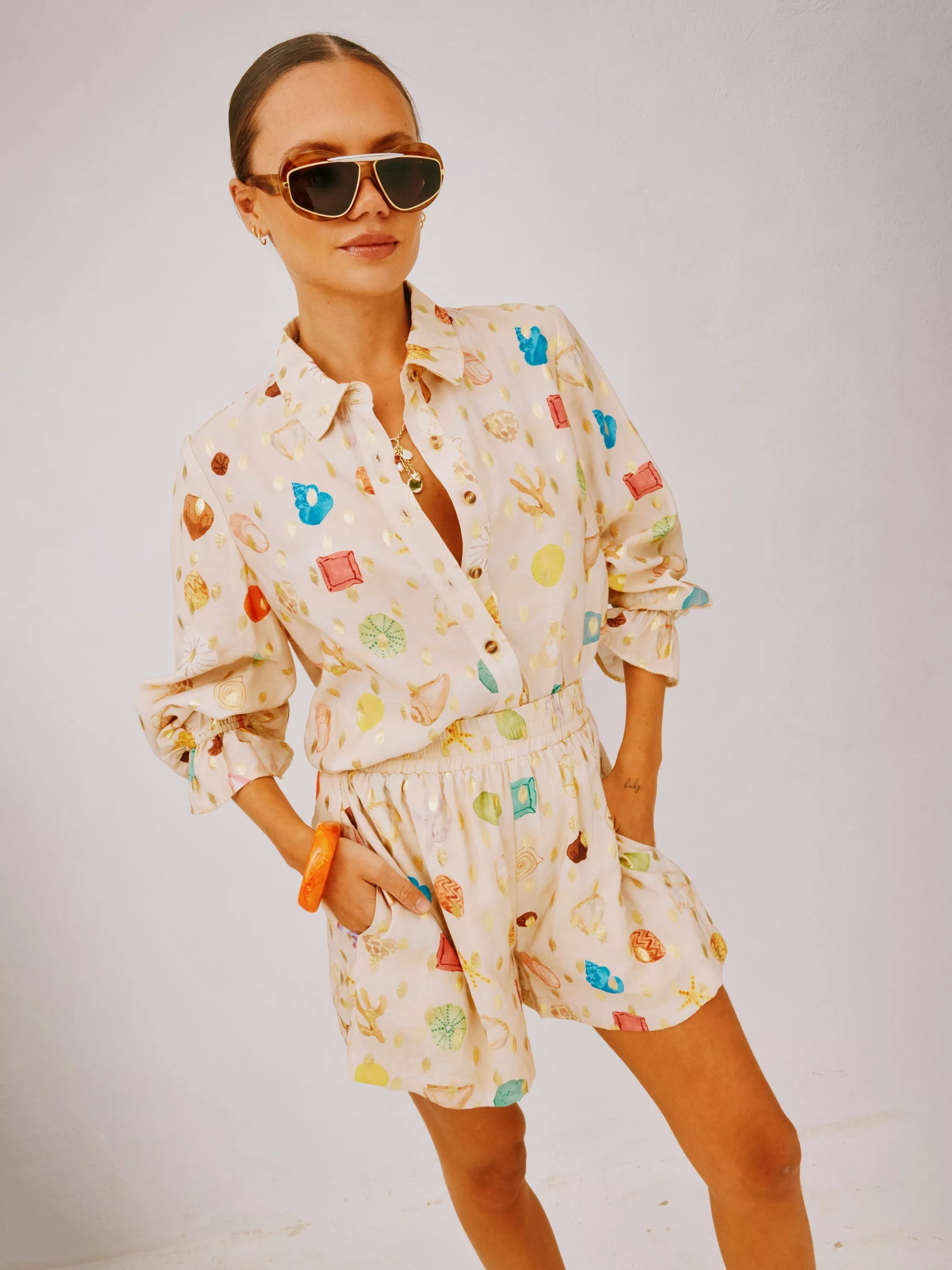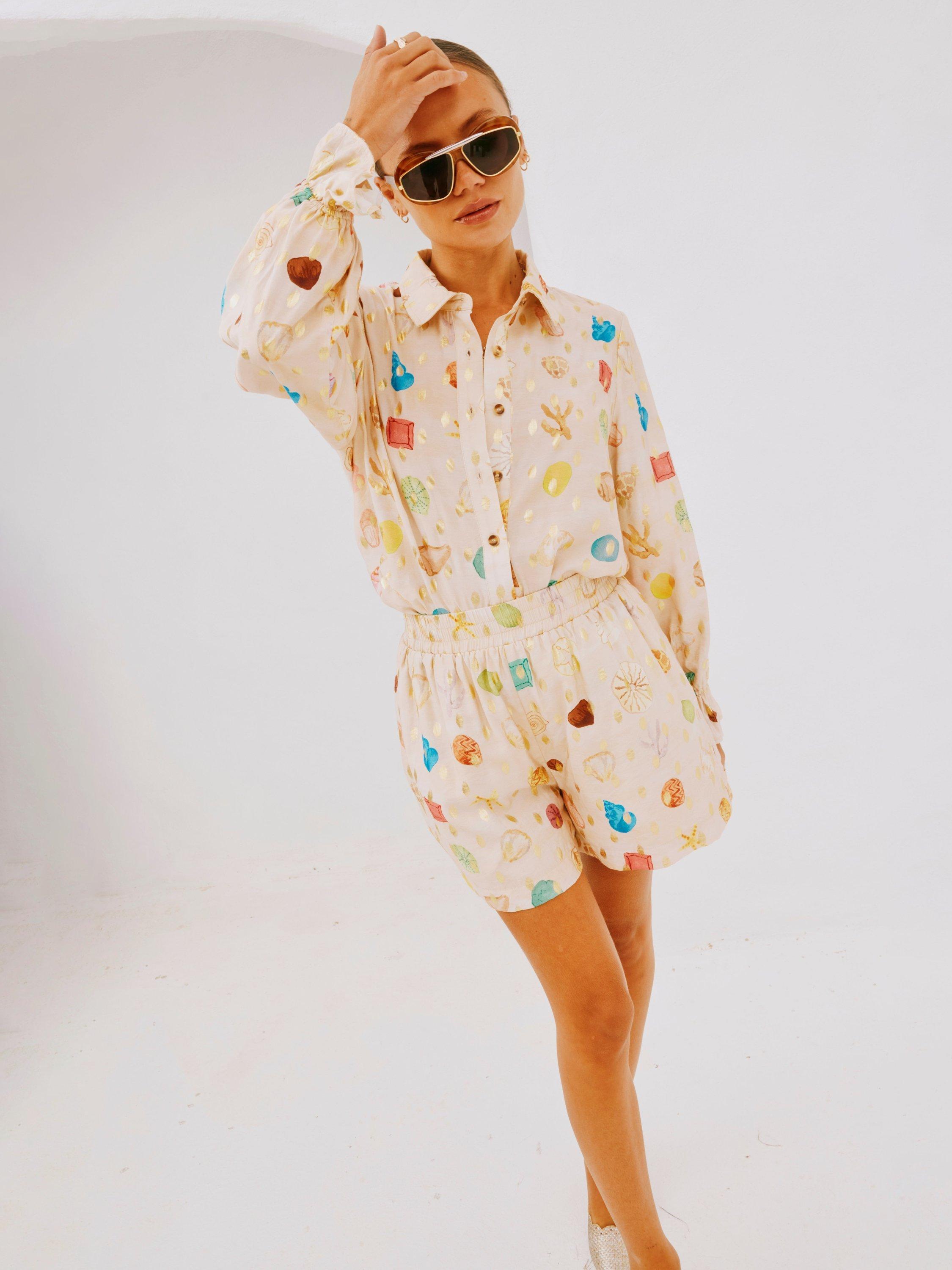 In a soft base with a fleck and colourful shell print that adds a extra touch of NFD! The elissa shorts are easy to style, whether it's with a classic rib tank or swimwear for a stroll along the beach or paired with heels for a soft night out look.