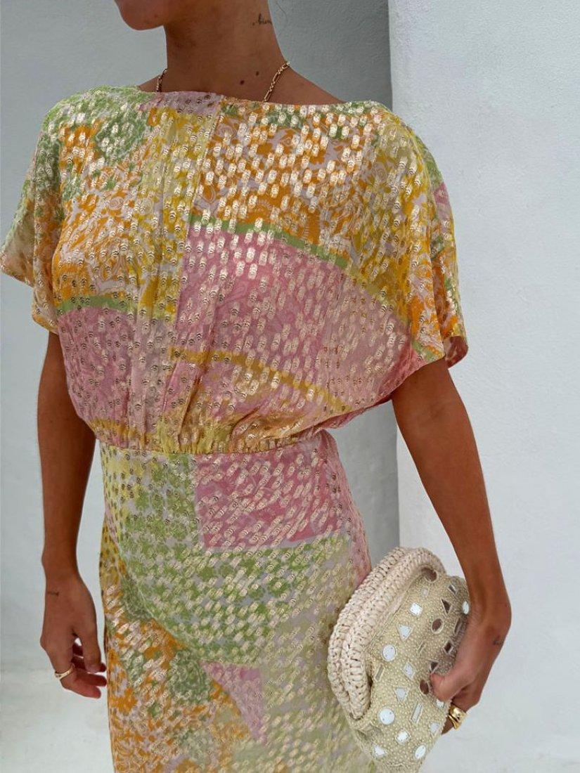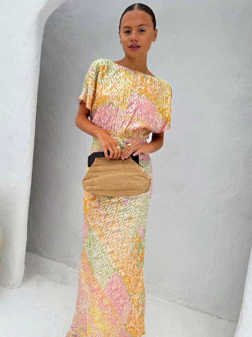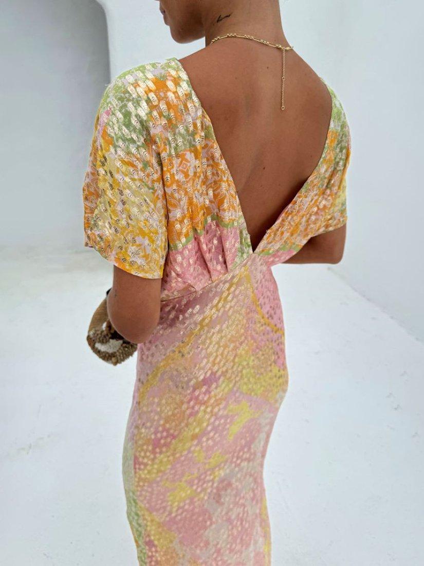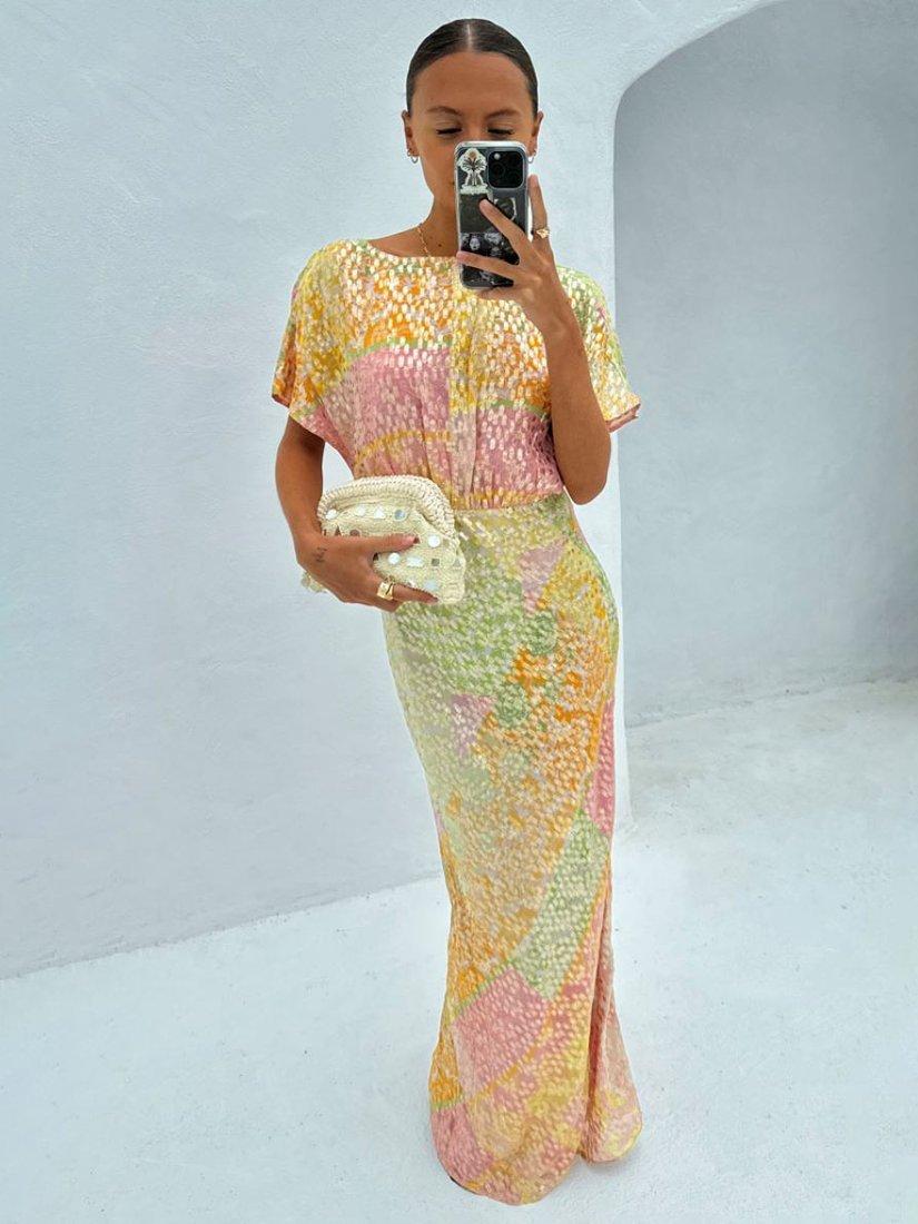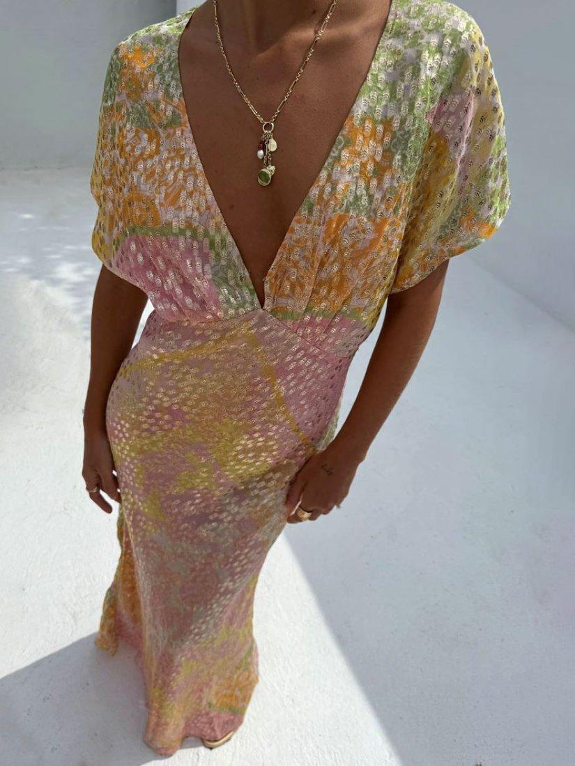 The definition of slip-on-and-go, this floor-length dress from Never Fully Dressed is an occasion wear favourite. Blended from a colourful abstract printed fabric imbued with metallics for a shimmering finish, it features a plunge neckline and short sleeves.