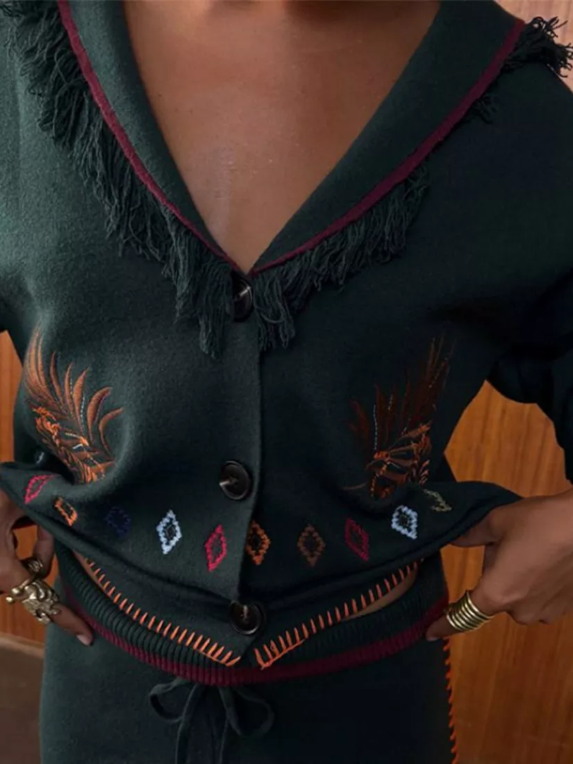 This soft cardigan is crafted from a luxurious knit that's perfect for cosy settings. Embroidered paisley patterns and motifs add a vibrant pop of colour, while fringe detailing along the sleeves and chest elevate this classic silhouette.