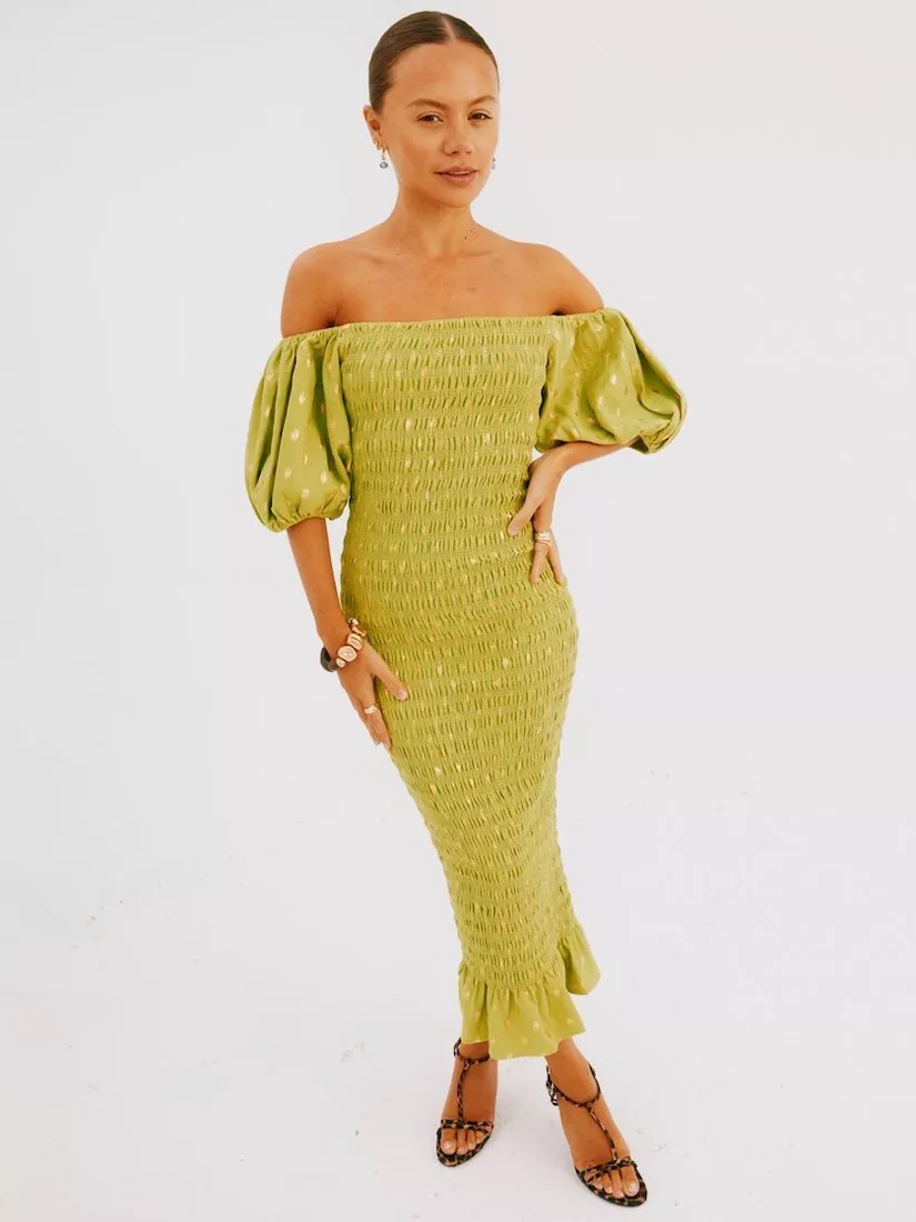 In a frame-hugging silhouette with a frill fluted hem, this shirred maxi dress from Never Fully Dressed is fabricated in a soft cotton blend. With an off-the-shoulder neckline and short puffy sleeves, this style is drenched with a metallic dotty fleck print.