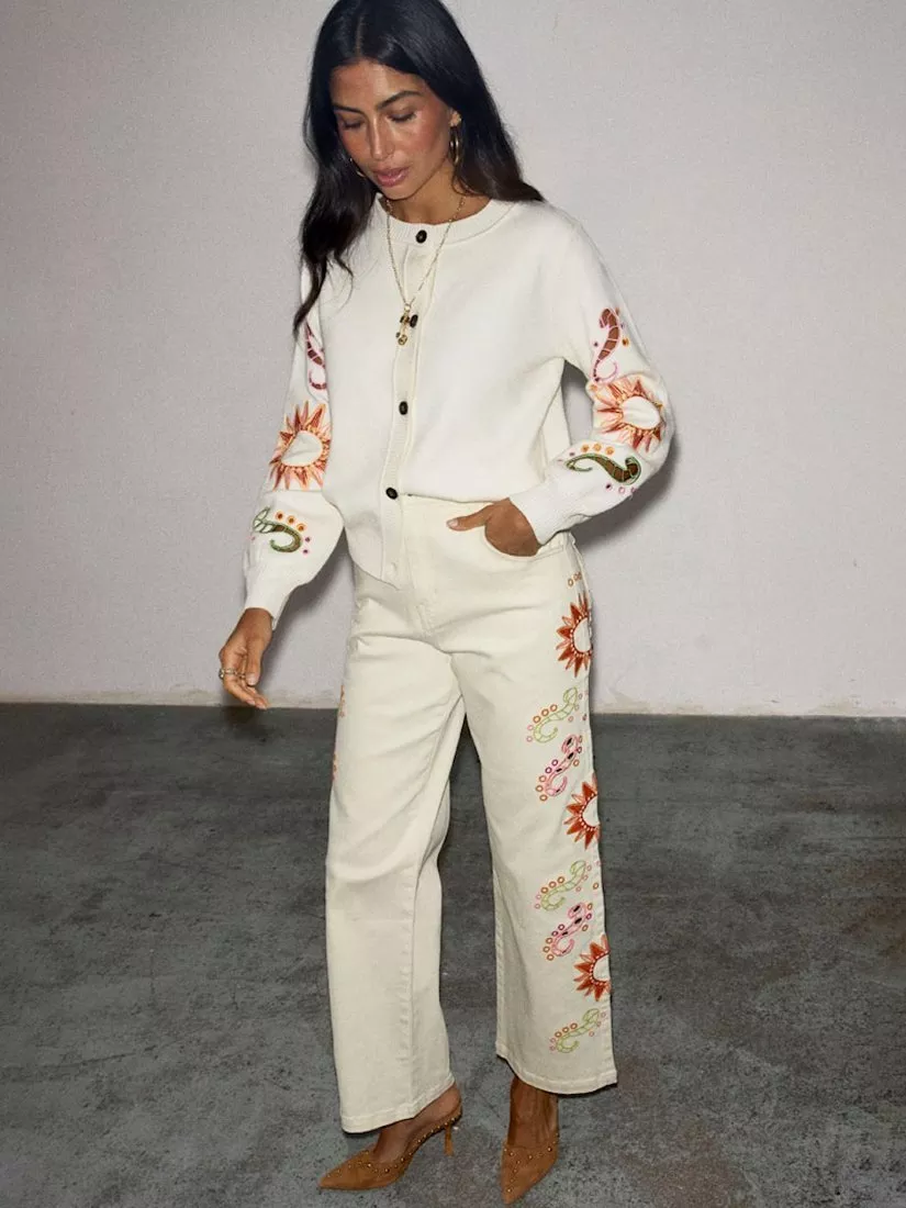 Never Fully DressedFloral Embroidered Scallop Pocket Jeans, Cream/Multi
