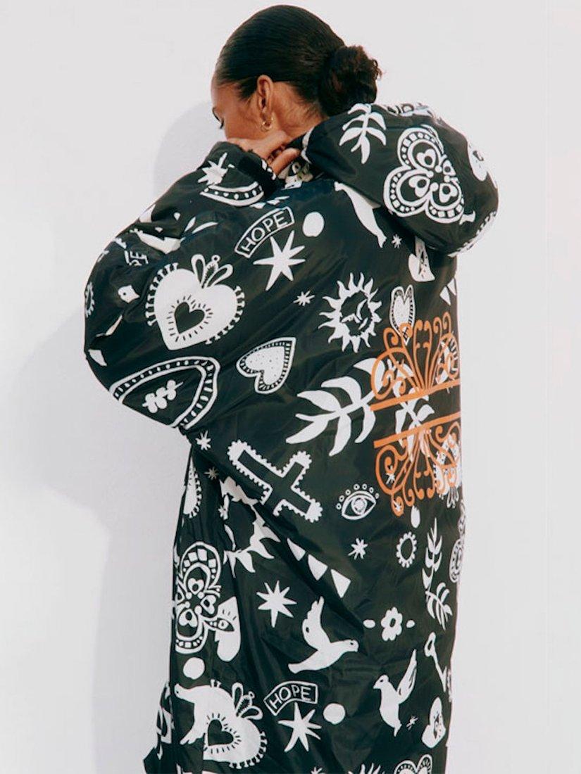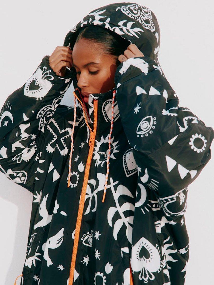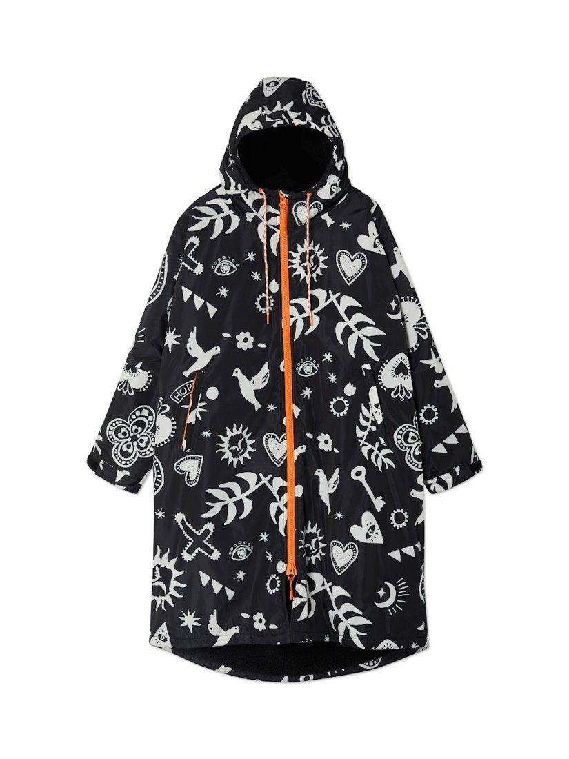 In a waterproof fabric that is lined with cosy fleece fabric and printed with an iconic NFD motif.