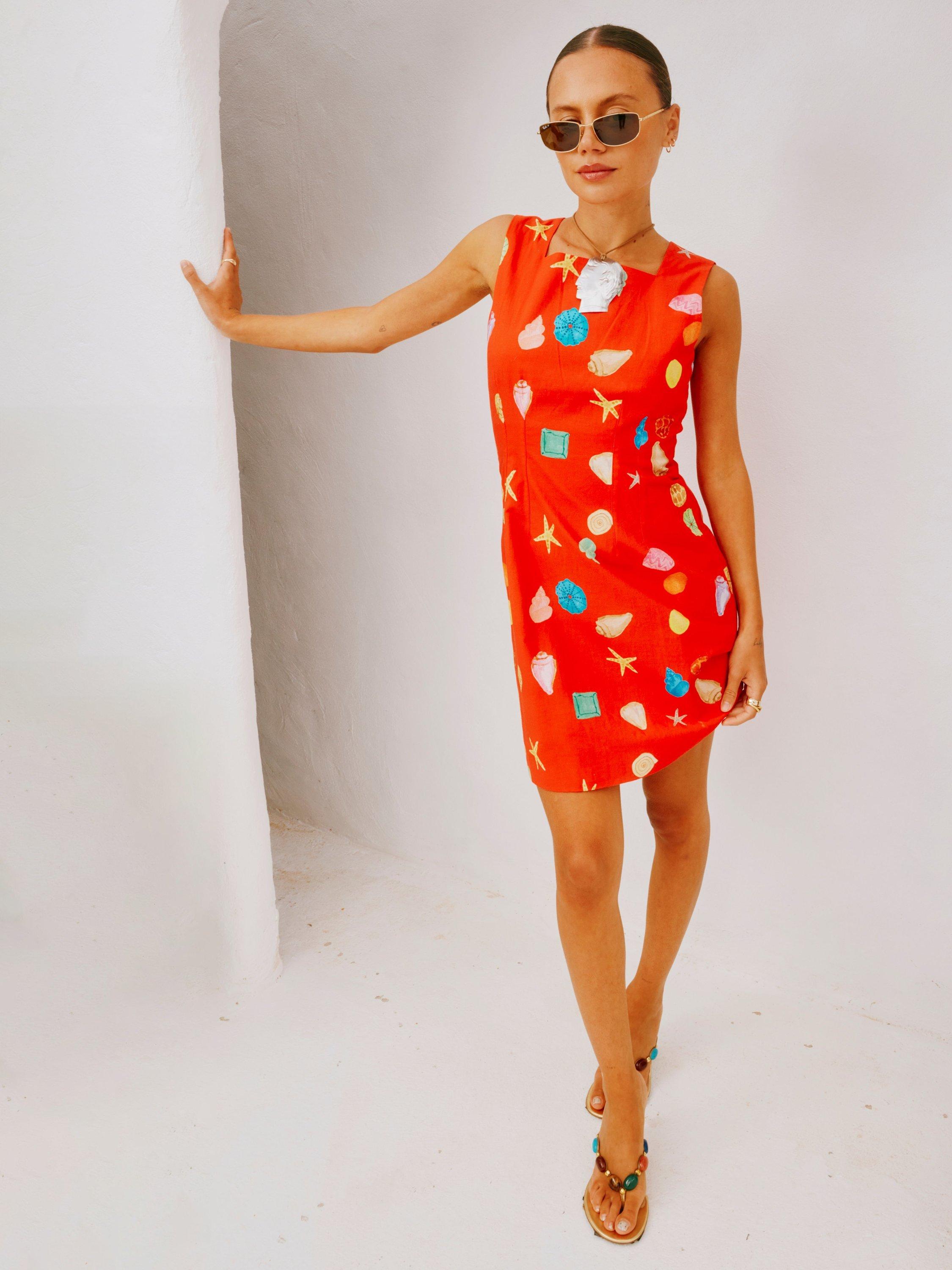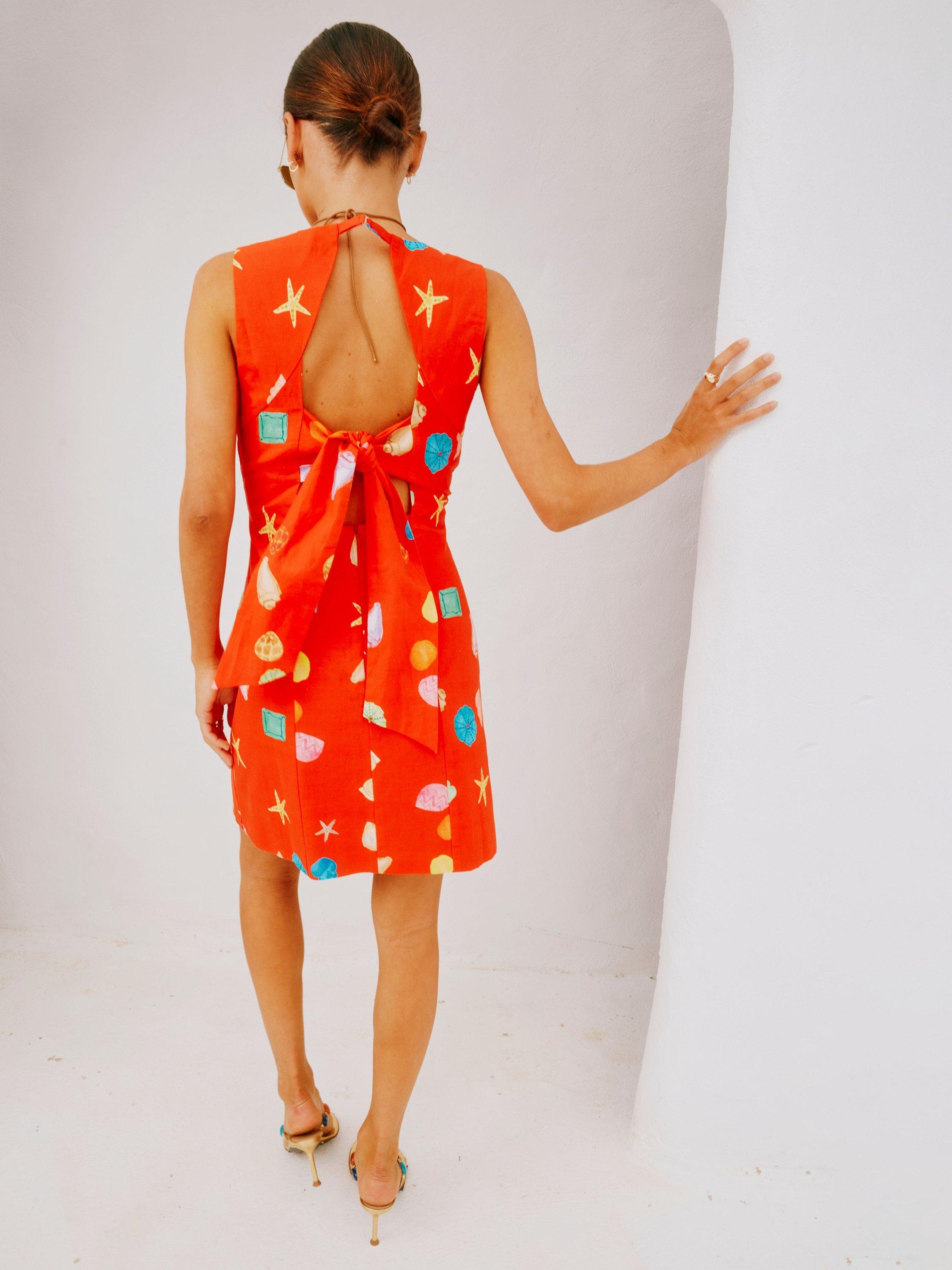 This dress brings a bit of joy into your spring/summer wardrobe! A bright and bold base with a fun multicoloured shell print, adding that pop of NFD flare! The simple but structured silhouette and tie back detailing make it so easy to style.