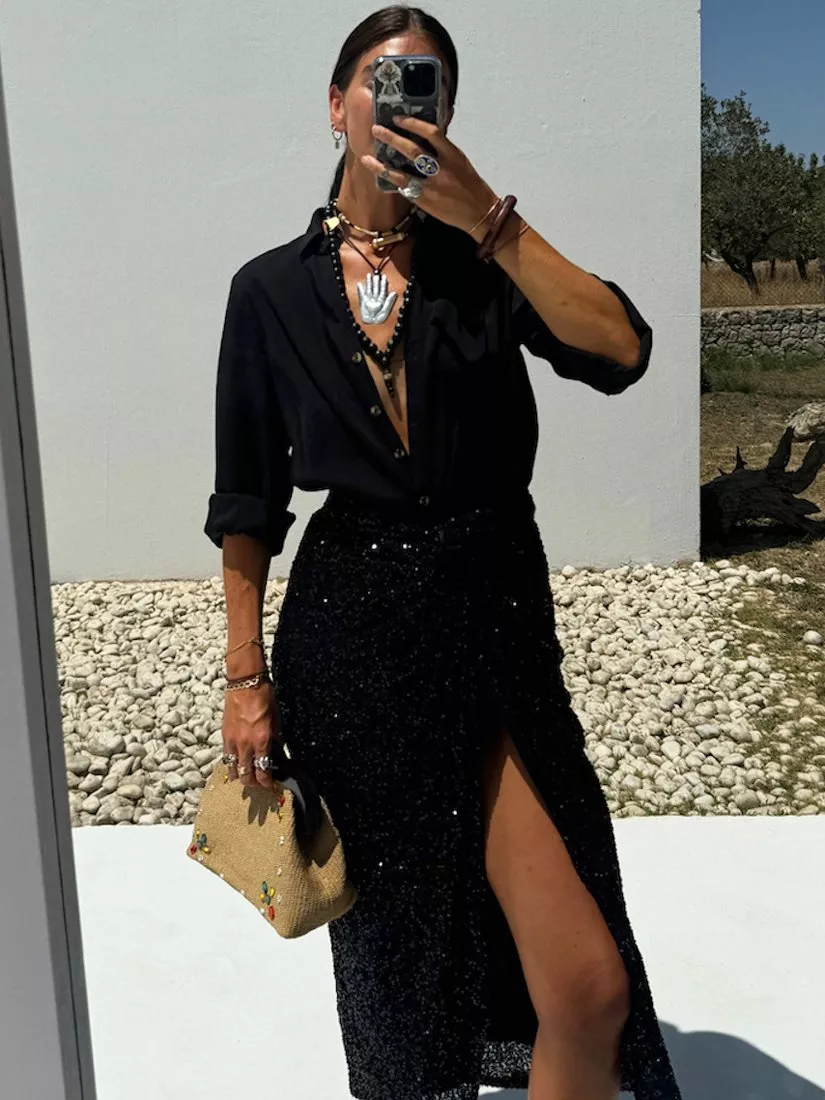 Cut to a classic A-line silhouette with a thigh-high split, this maxi skirt by Never Fully Dressed shimmers with sequin embellishment. Sitting at the waist and with an adjustable wrap waist that can be tied in different styles, it's the perfect partywear piece.