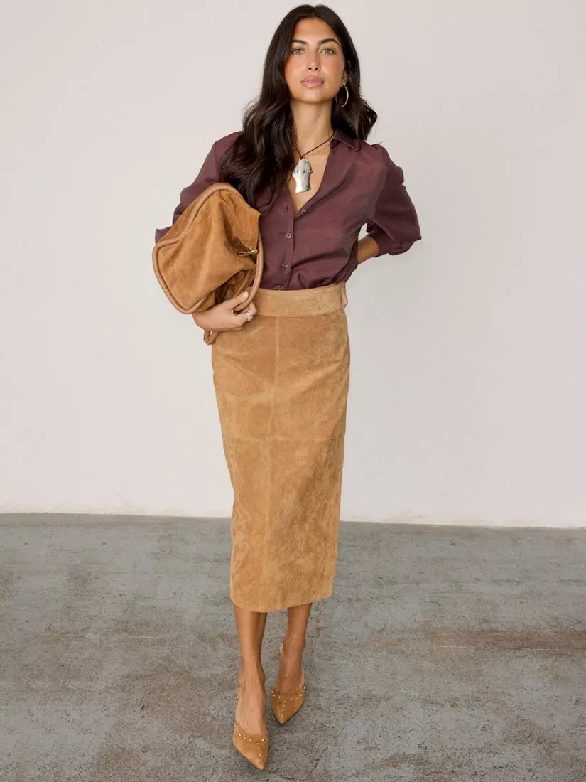 Embracing effortless femininity with a body skimming silhouette, this suede midi skirt from Never Fully Dressed is kept trend-free so that it'll sit in your closet for years to come.