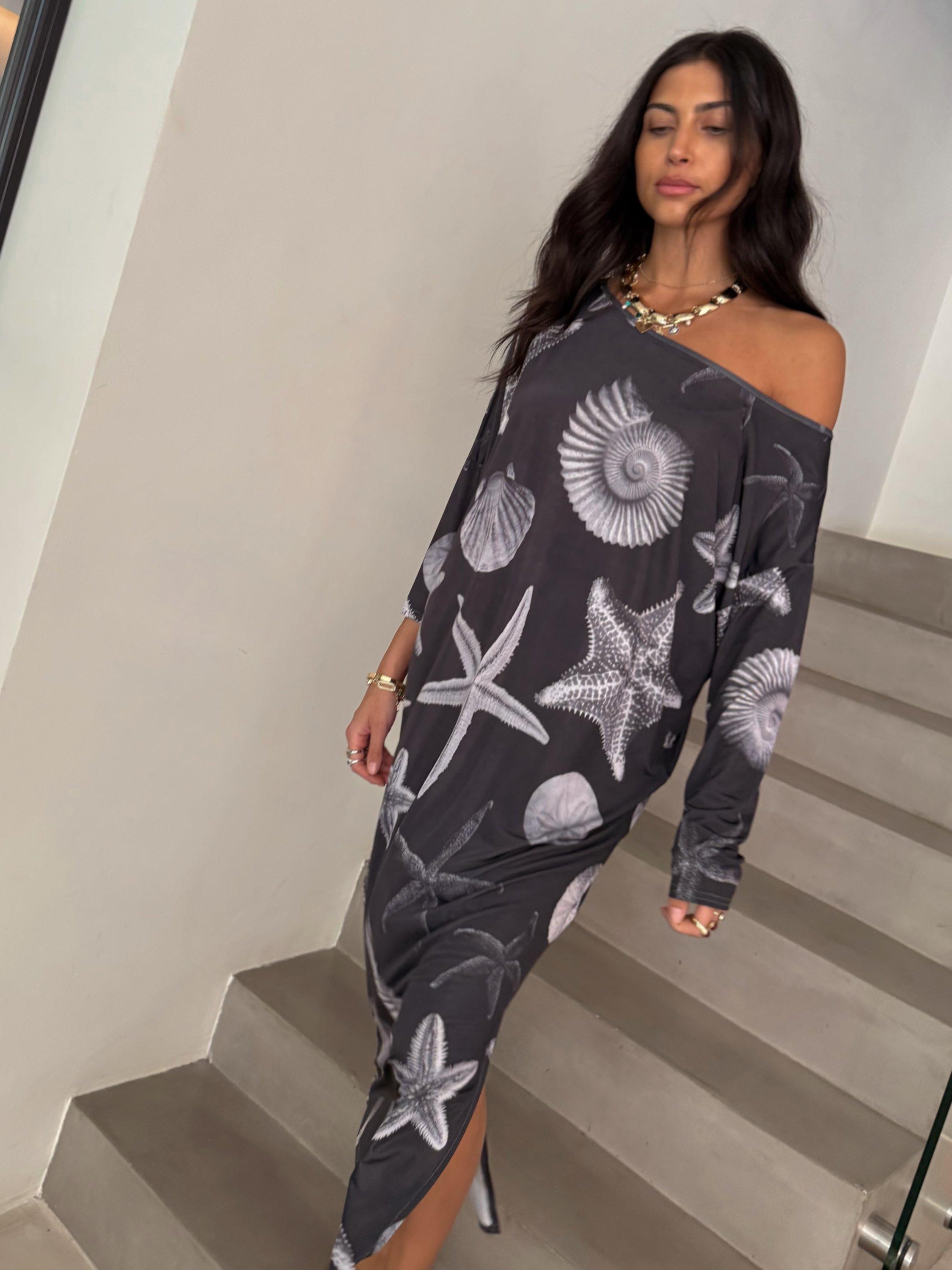 The best-selling Jem dress is back in a gorgeous new print! The chic seashell print transports you to the coastal views of the Balearic islands where this print was inspired from. The relaxed silhouette makes it an easy throw on and perfect for strolling along the beach.