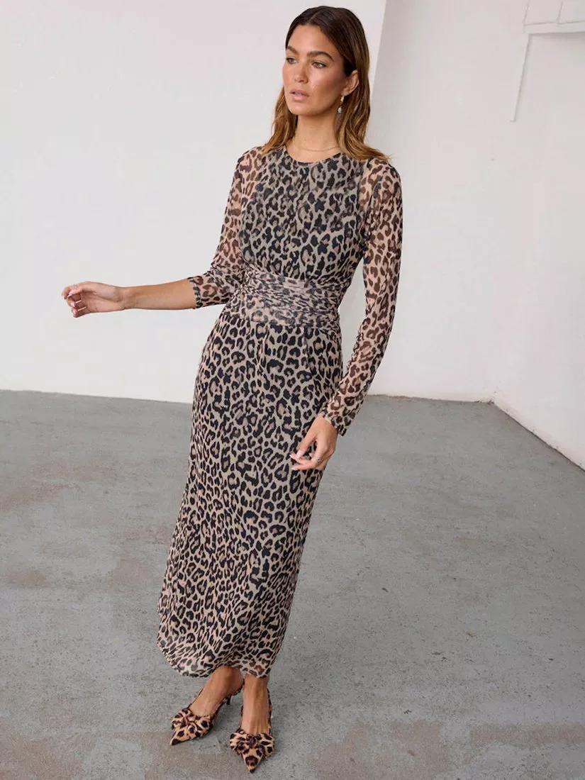A soft silky mesh in a leopard print that skims the curves and falls to the ankle. It comes with a slip to layer underneath.