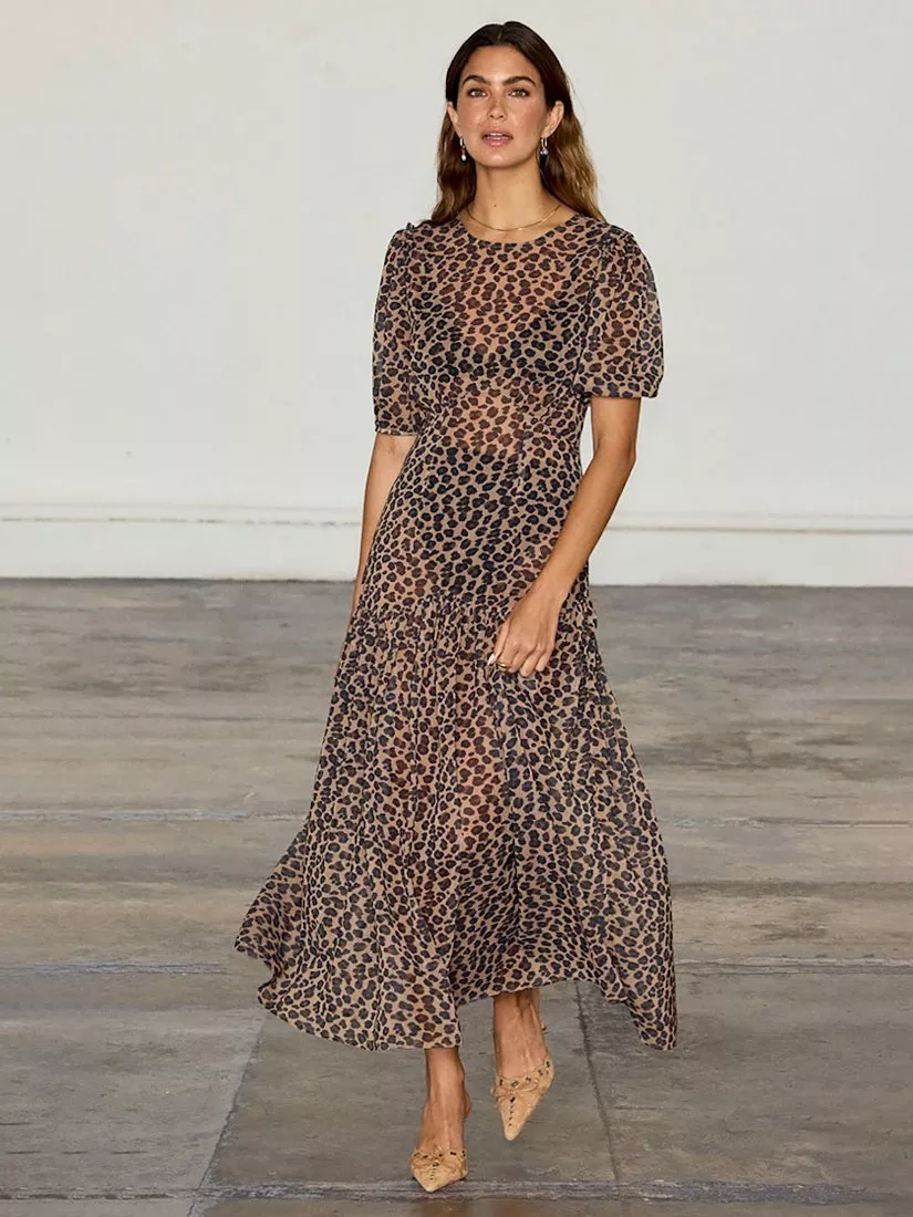 Never Fully DressedLucia Leopard Print Semi Sheer Dress, Brown