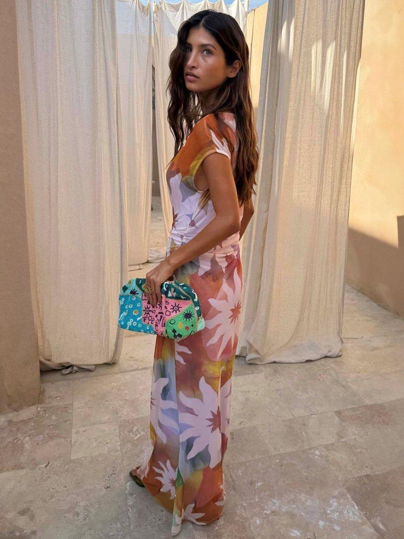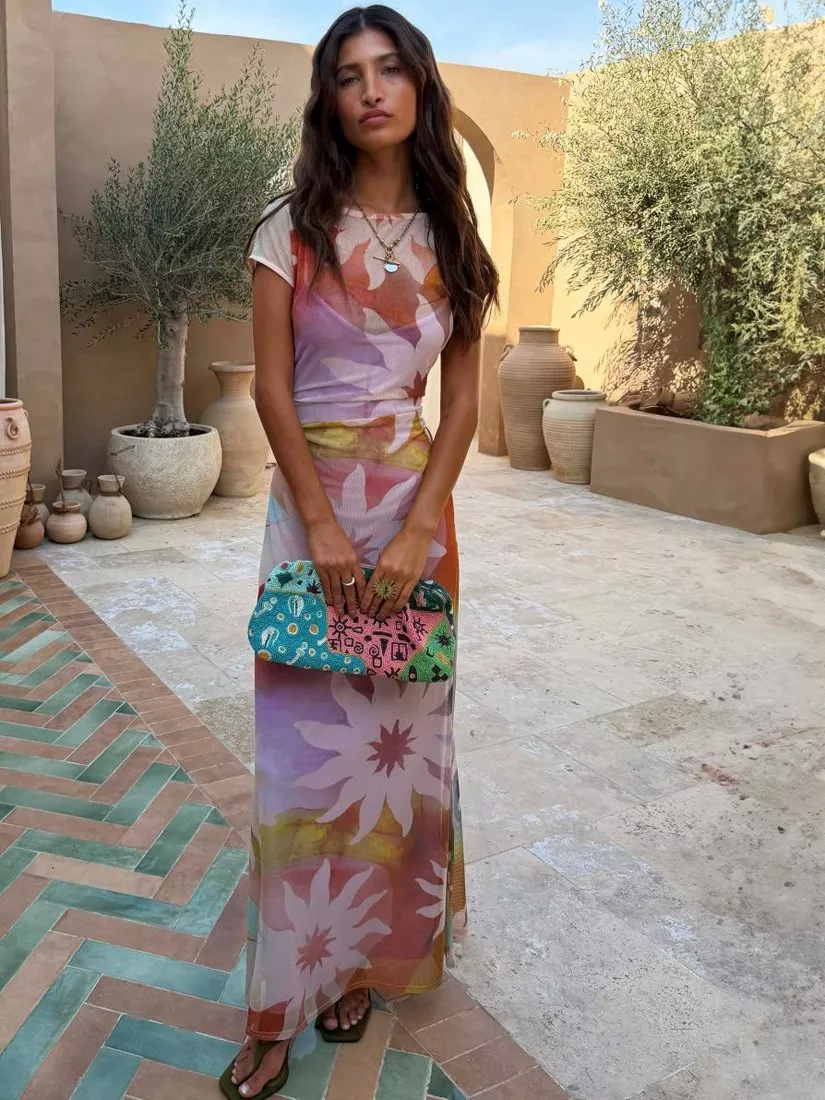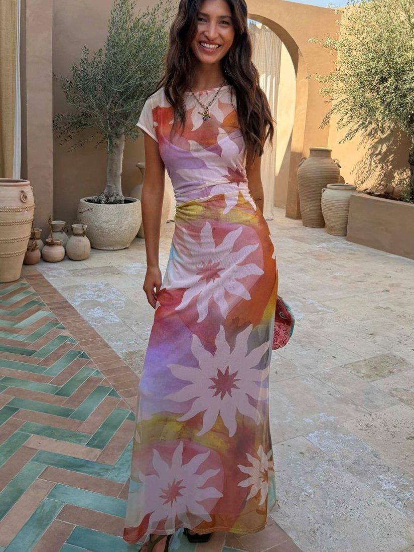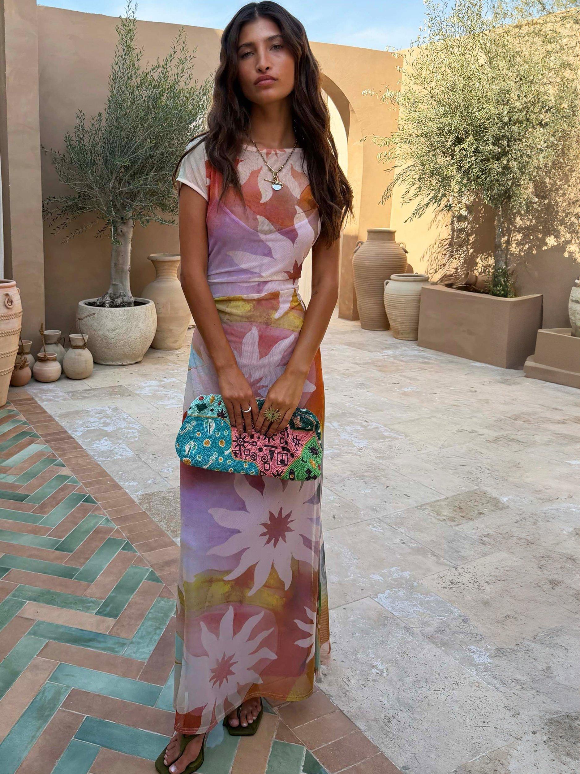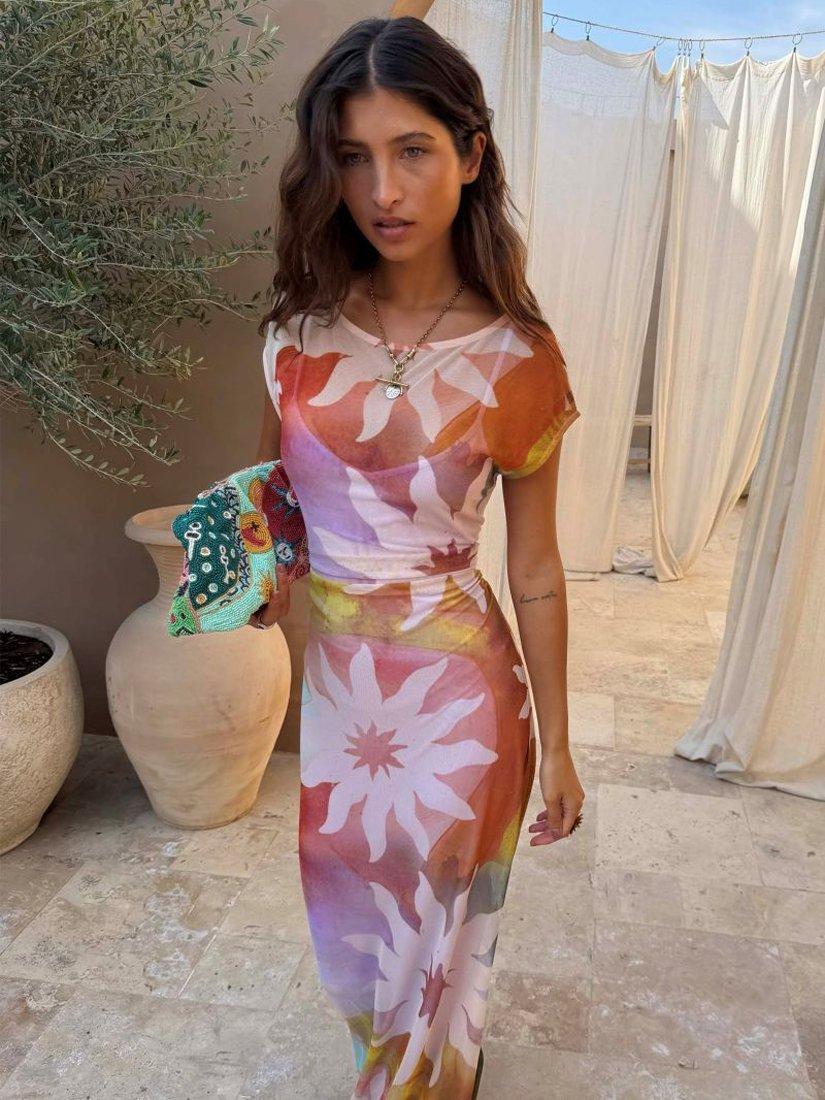 This mesh sheath maxi dress from Never Fully Dressed features an abstract soleil pattern and easy round neck with short sleeves, blending bold character with all-day comfort for standout looks at day or weekend gatherings.