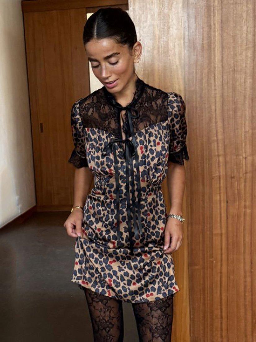 This mini dress brings energy to any party, with its playful leopard and cherry pattern and elegant lace details. The A-line shape makes moving and mingling effortless. Enjoy the clever tie neck and flattering fit designed for you to stand out.