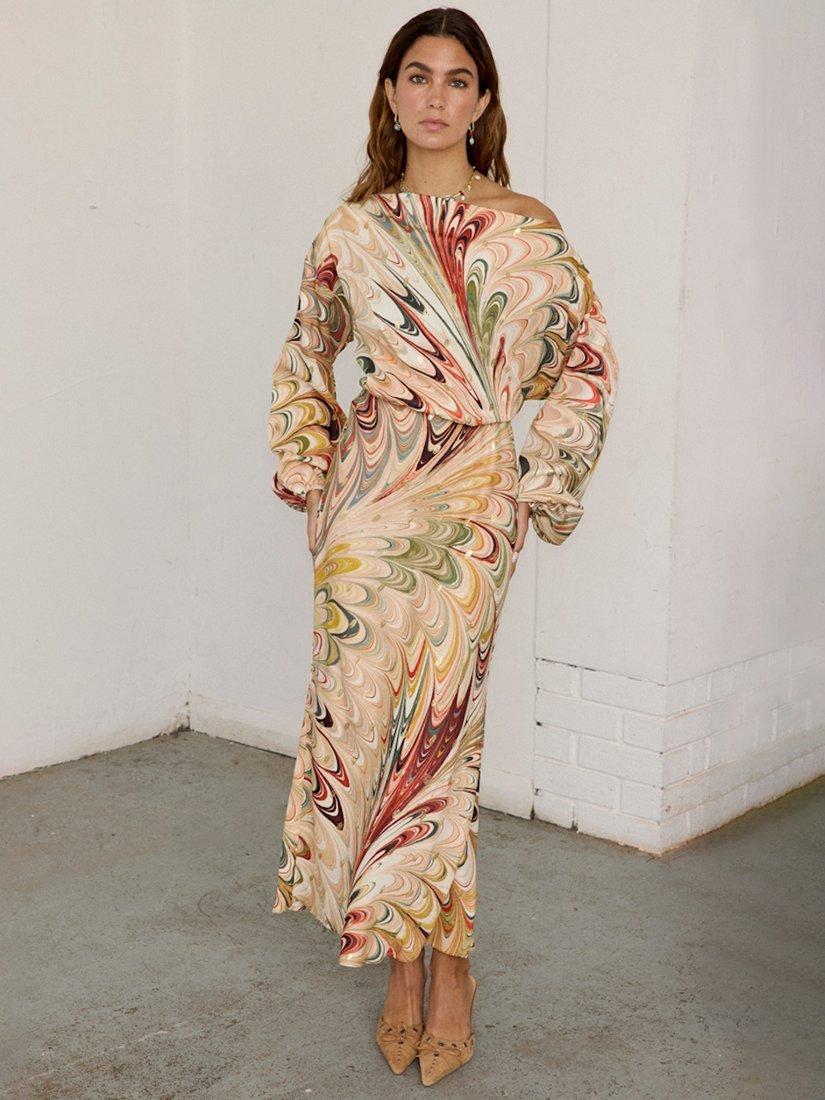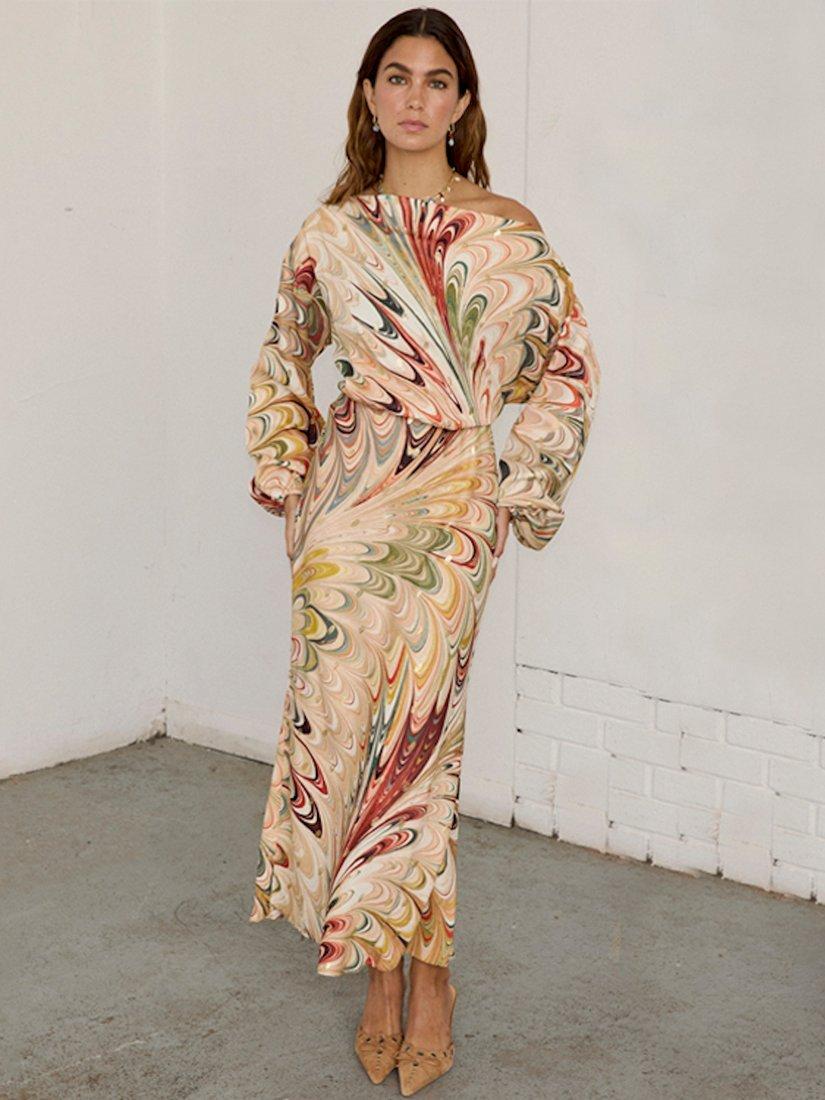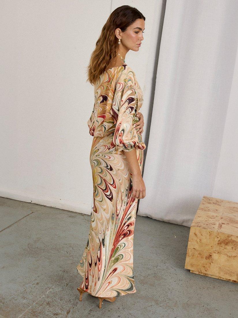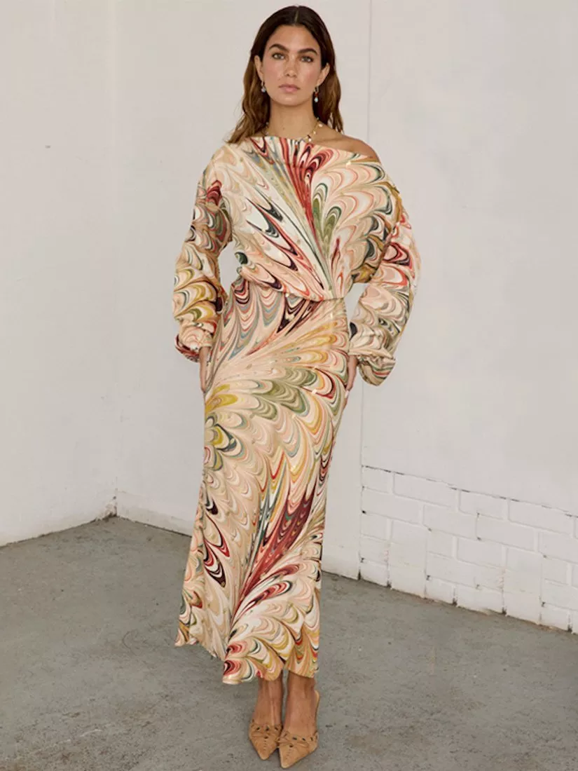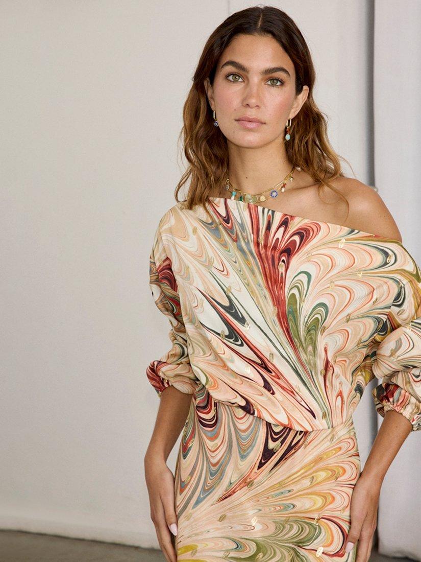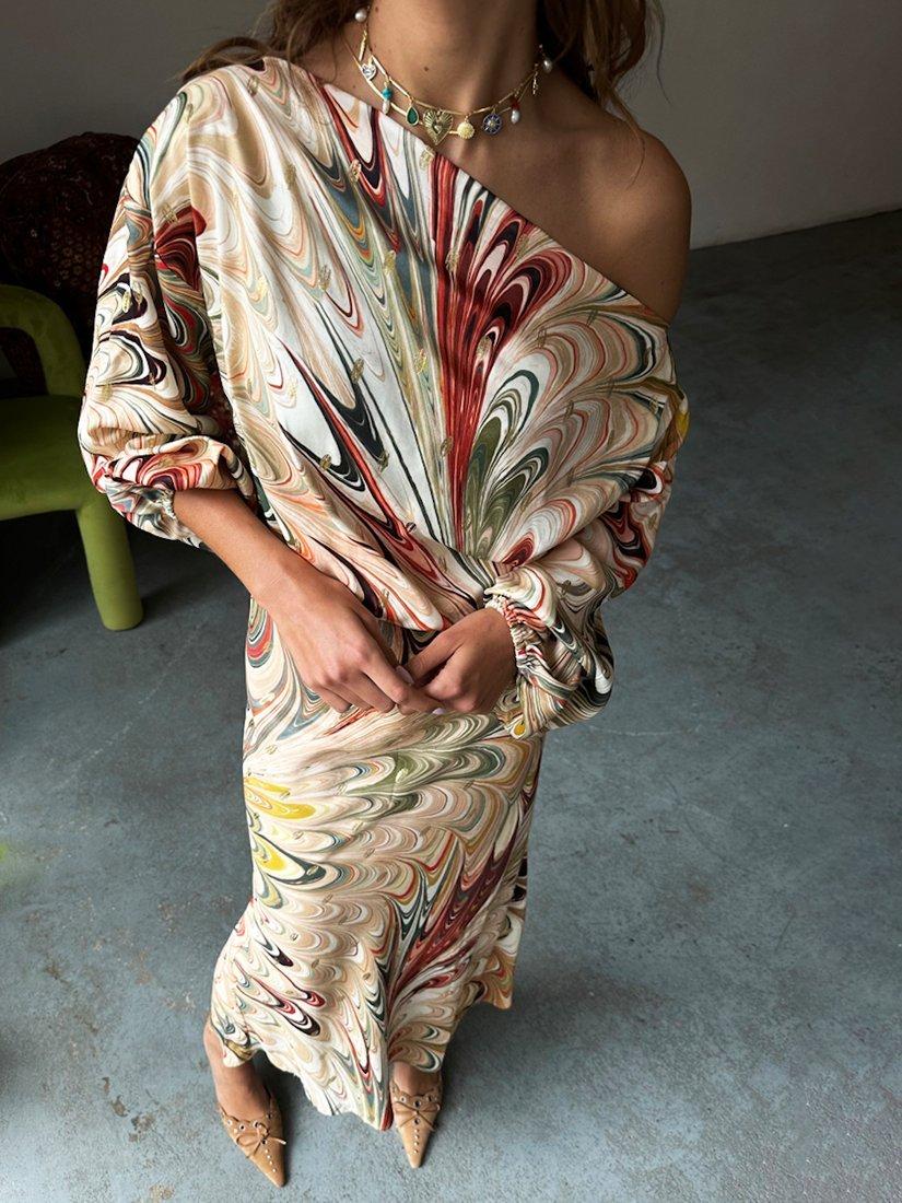 A gorgeous satin-esque fabric in multicoloured marble print, with sparkling fleck.