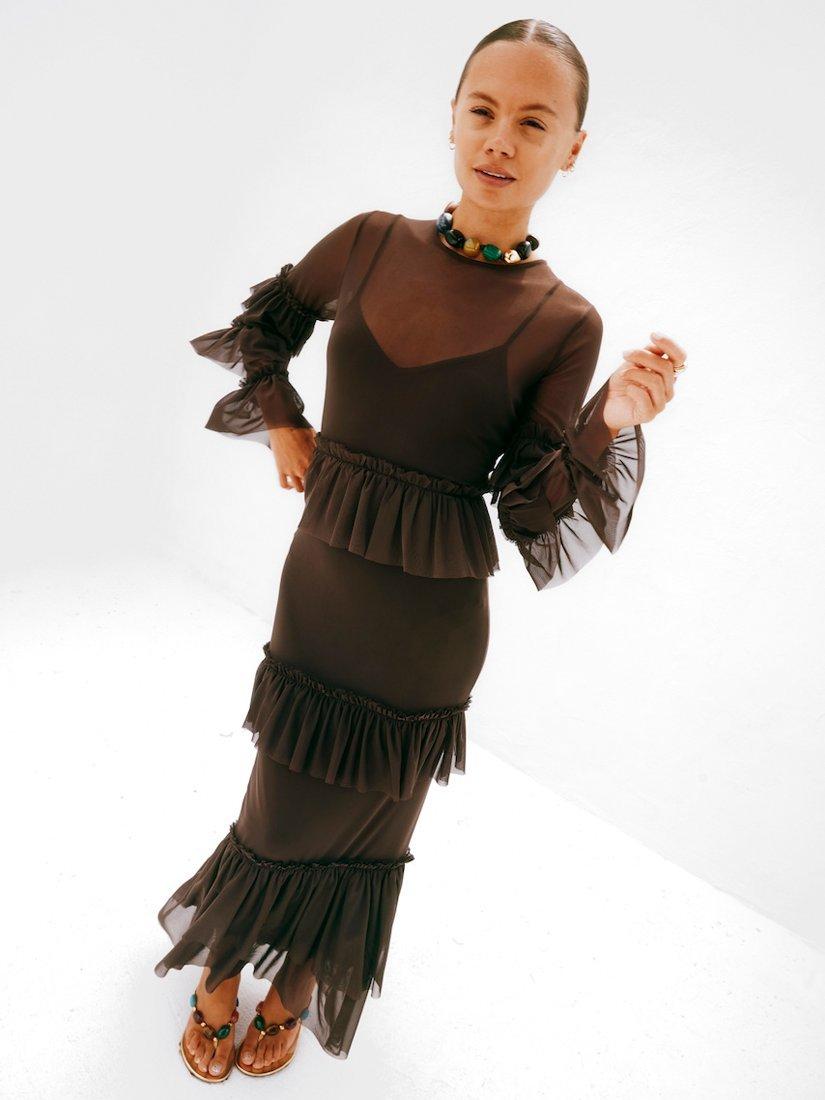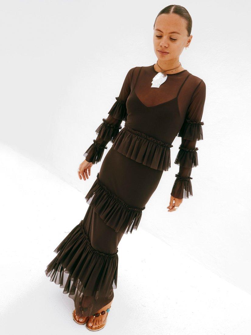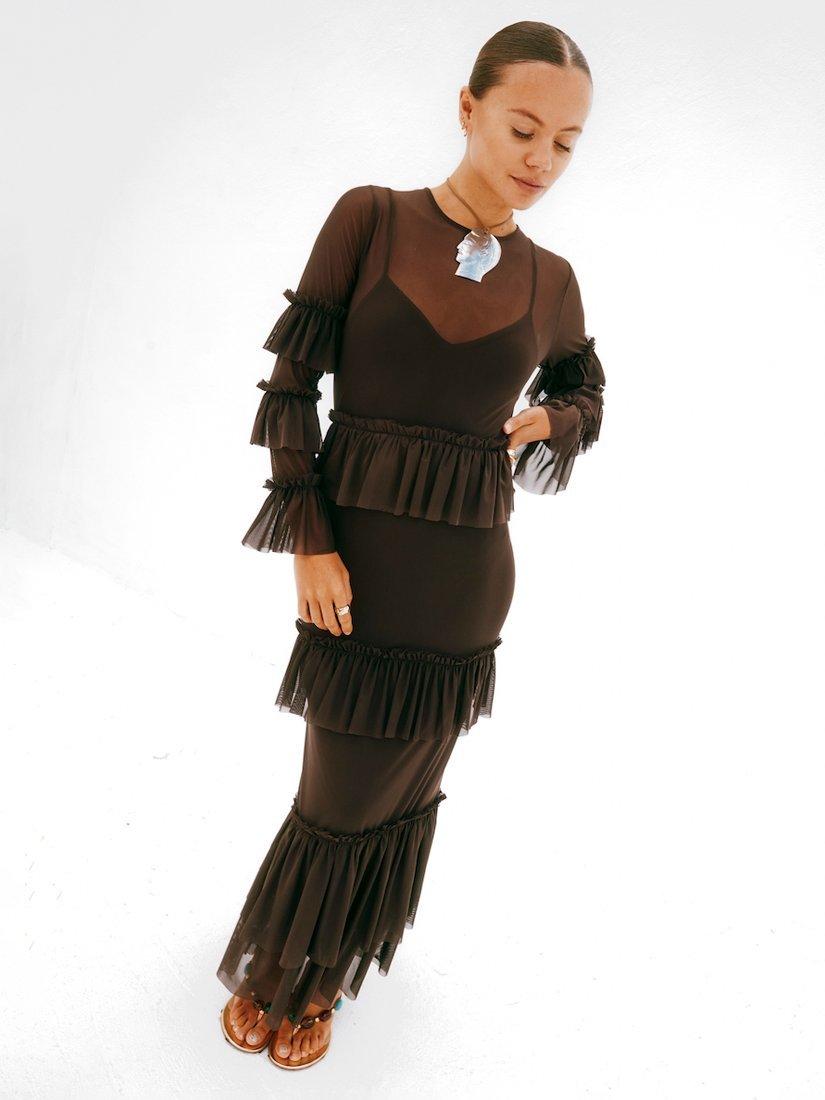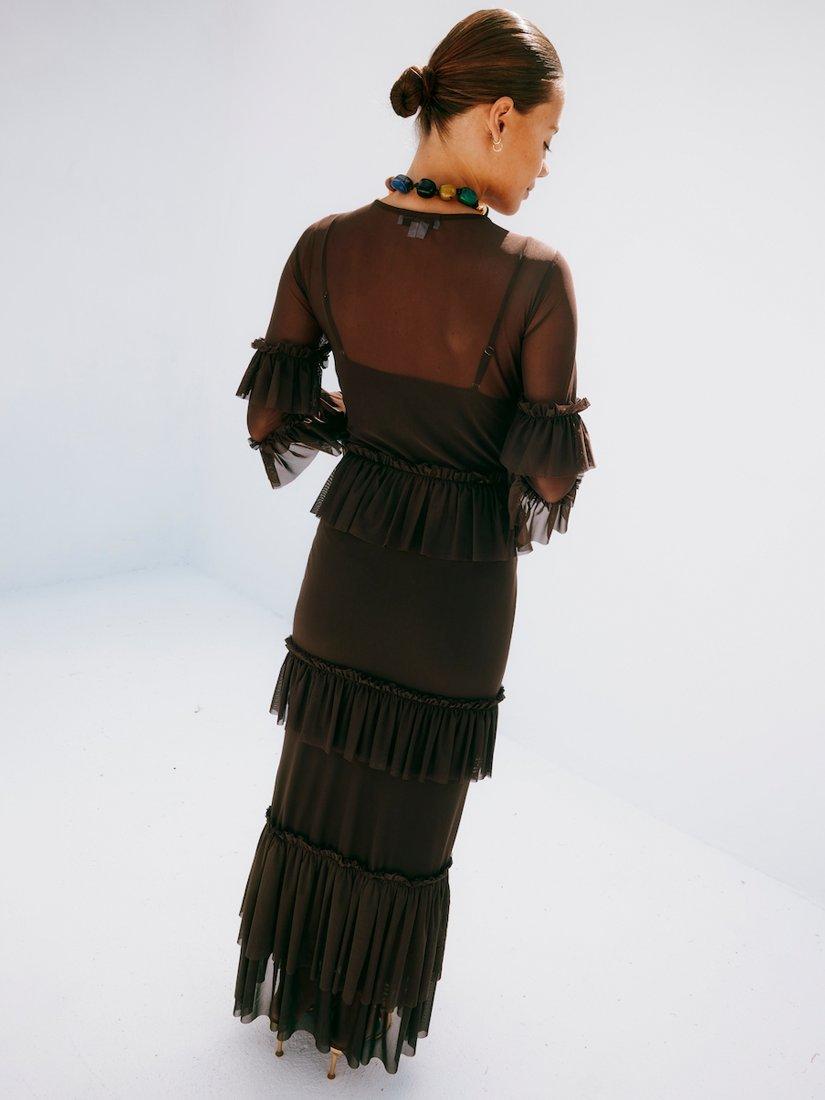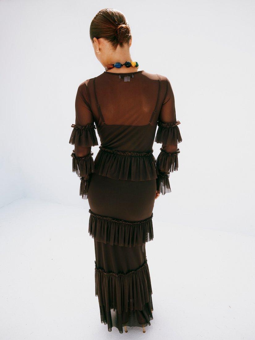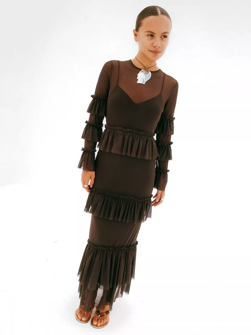 A gorgeously lightweight mesh with tiered ruffle detailing along the bodice, sleeves and hem.