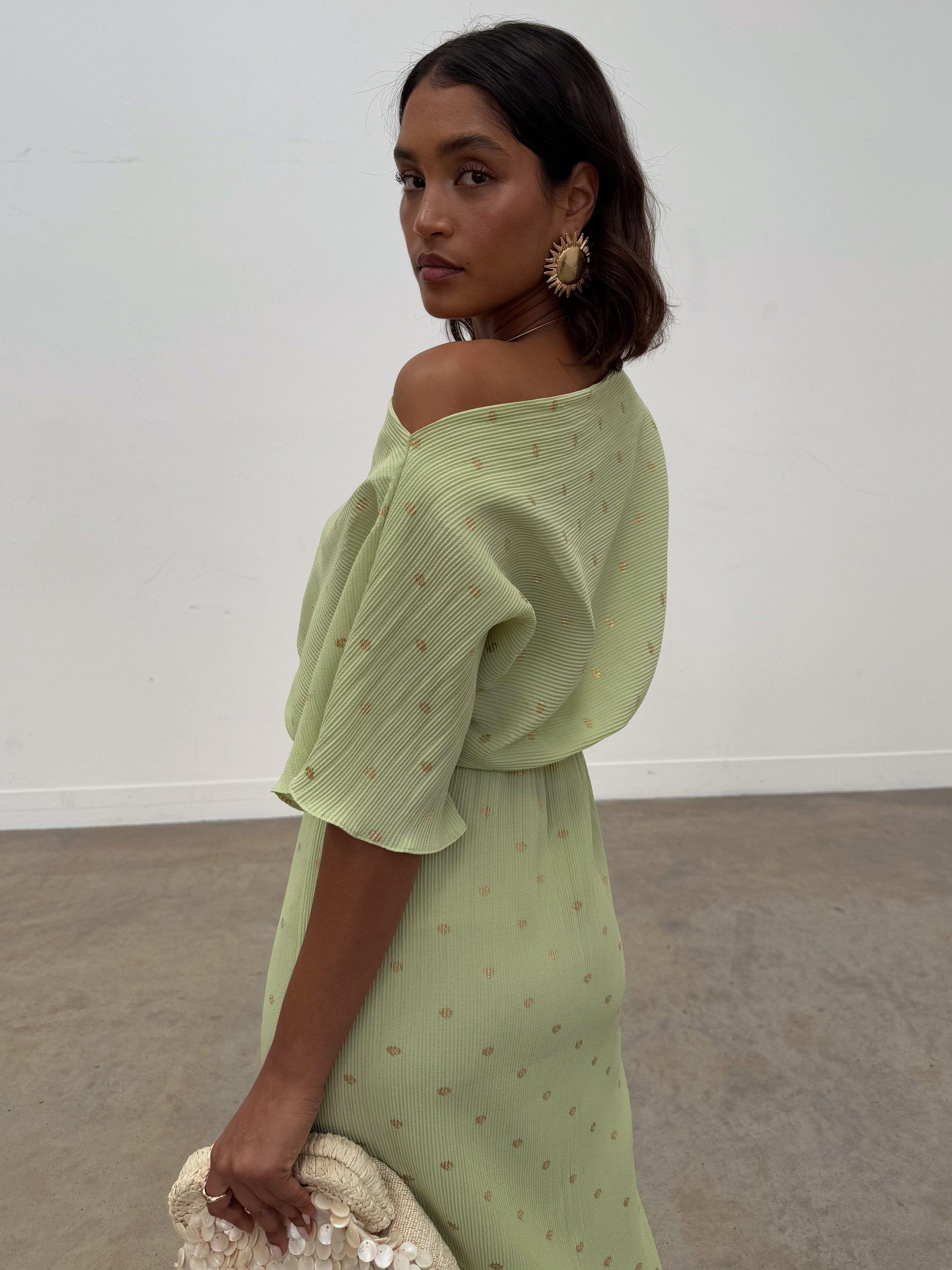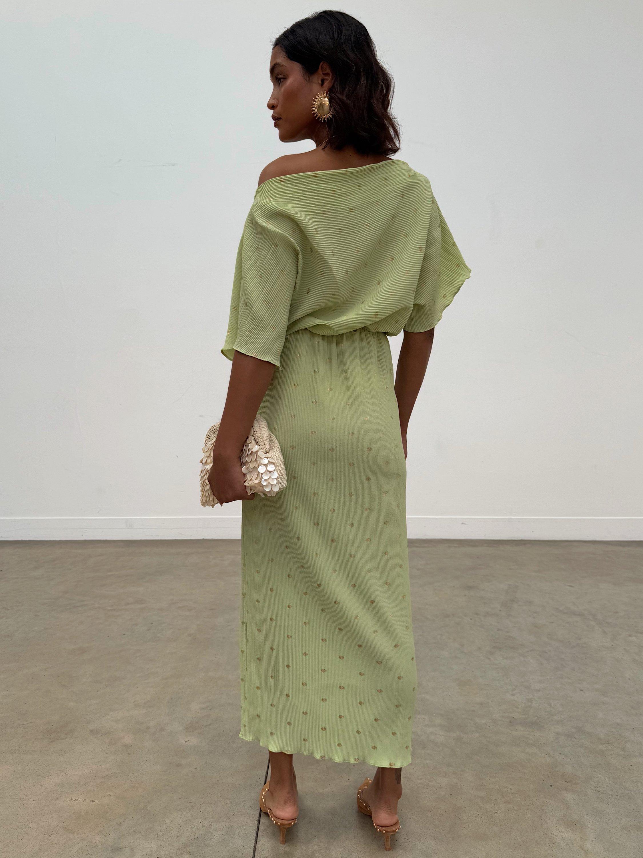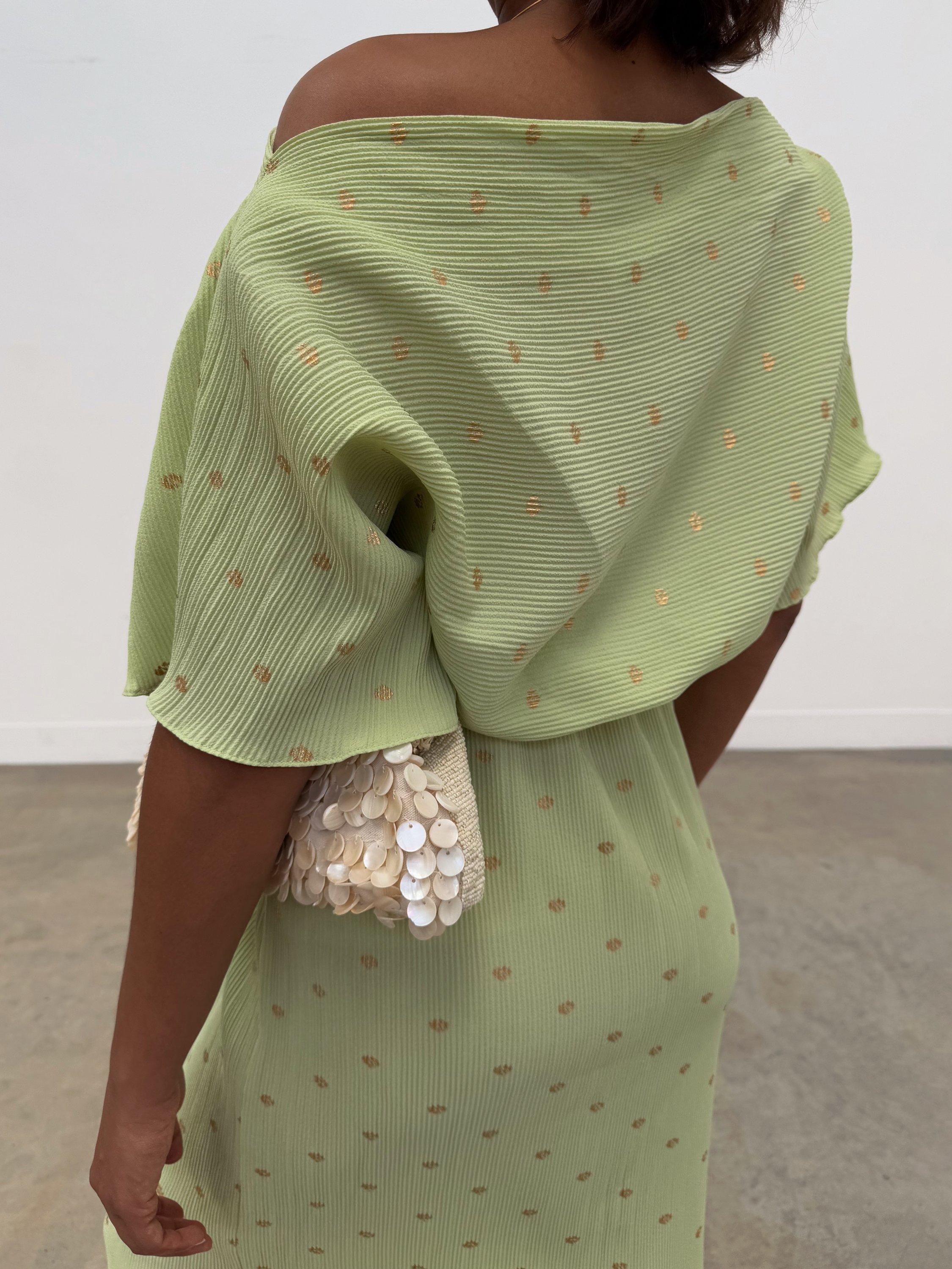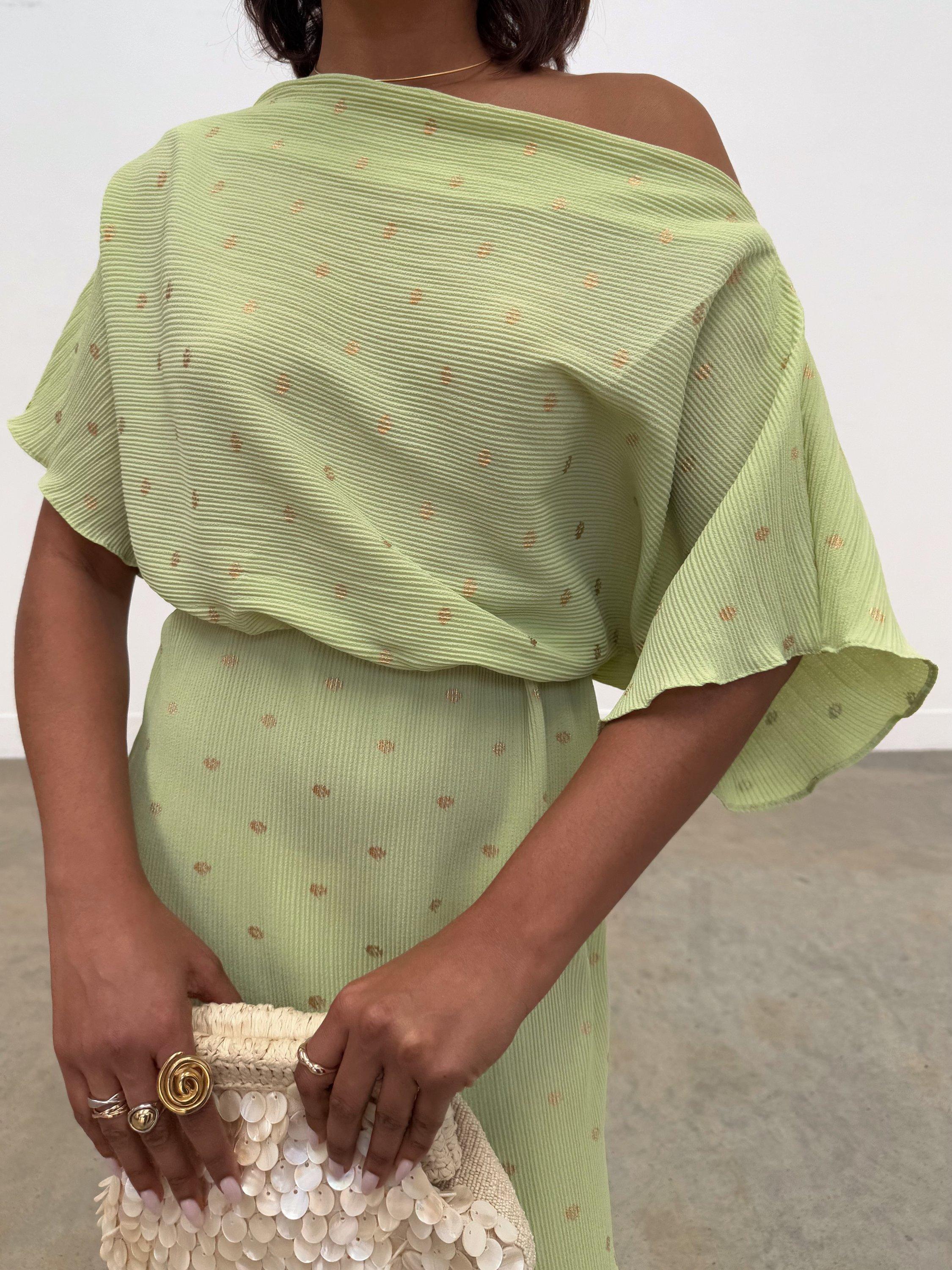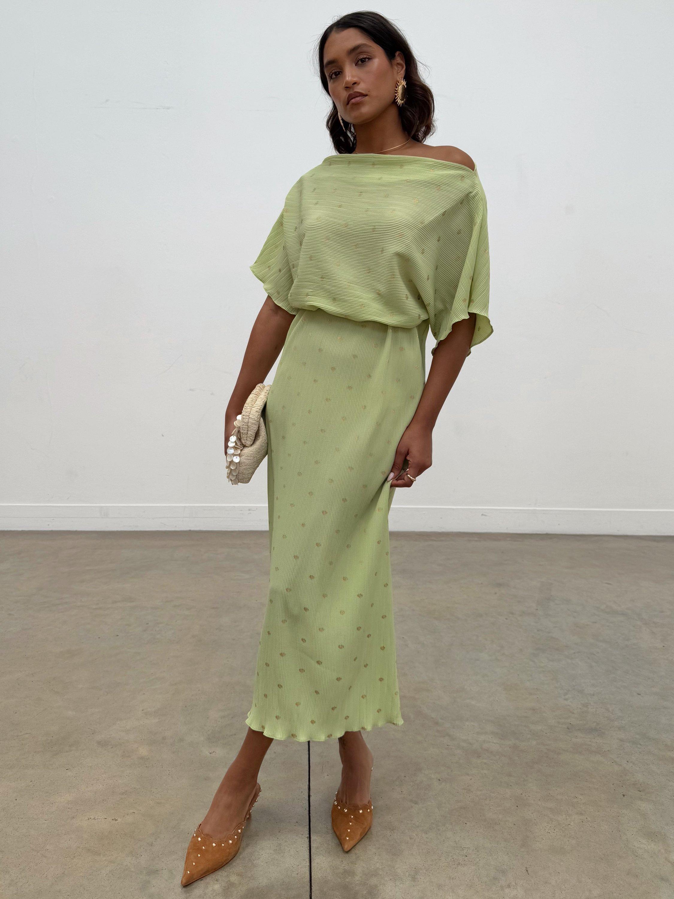Designed in-house, this bestselling fleck print features metallic brushstrokes that are highlighted by the sunlight. A fitted skirt with a slightly more voluminous top creates a dramatic silhouette.