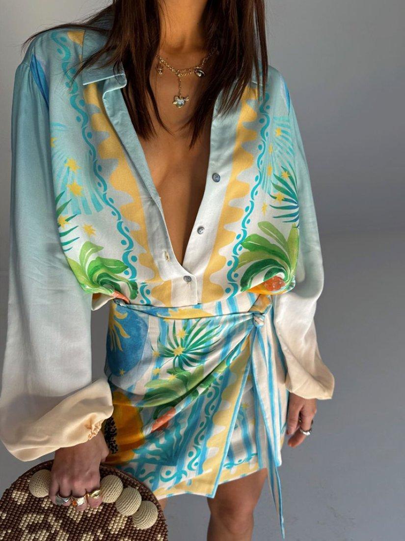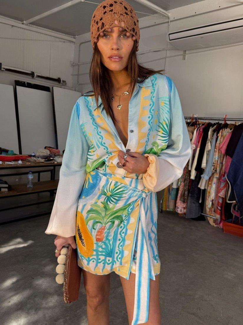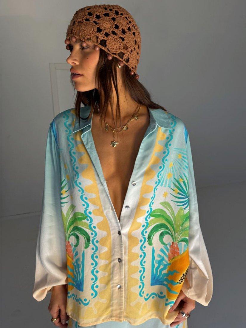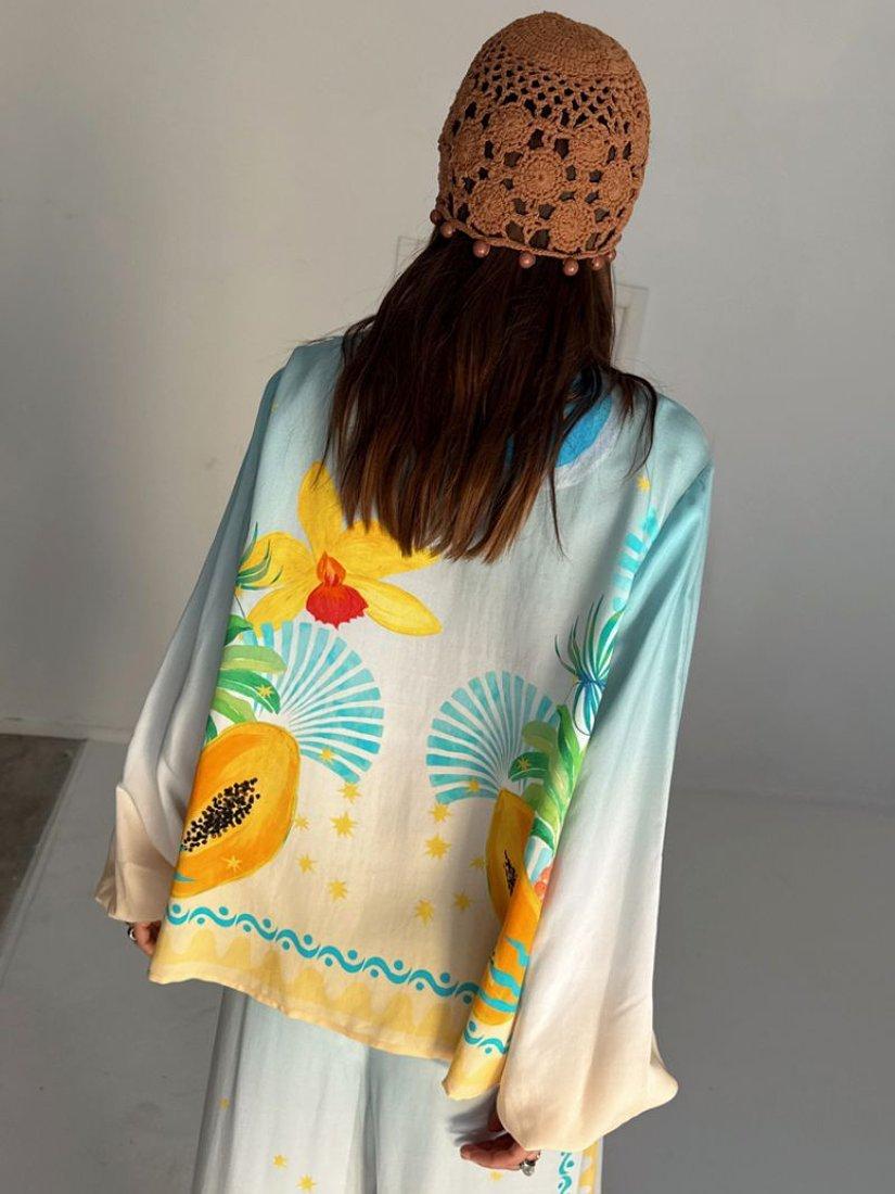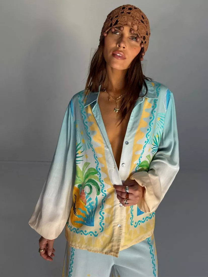 The best-selling Miley shirt is so versatile and in a lightweight, breathable fabric, it's perfect for trans-seasonal styling. The gorgeous Rio print combines iconic NFD motifs with a range of tropical fruits that are hand-painted and designed in-house by our amazing design team! With elasticated cuffs and tortoise shell buttons.