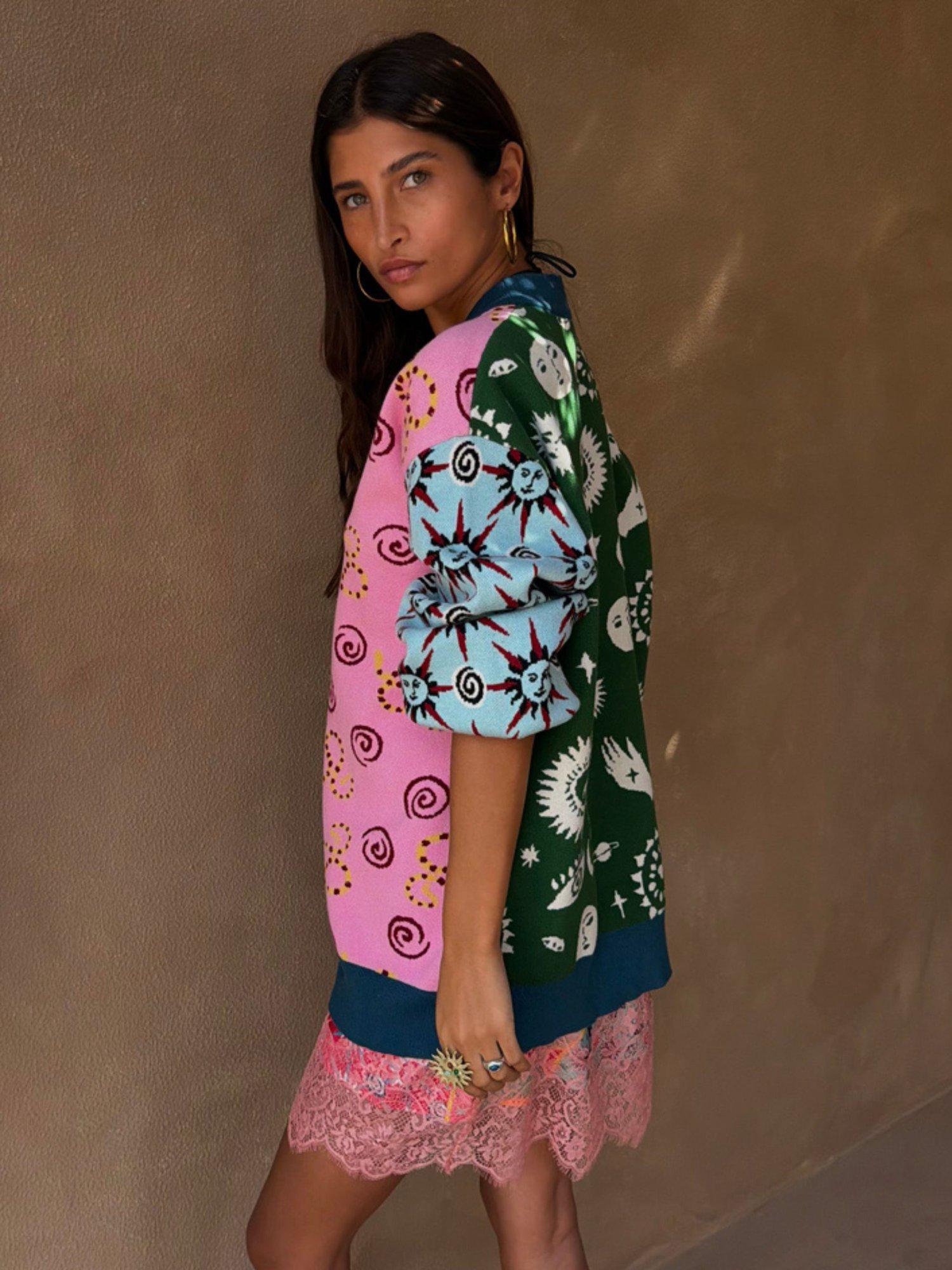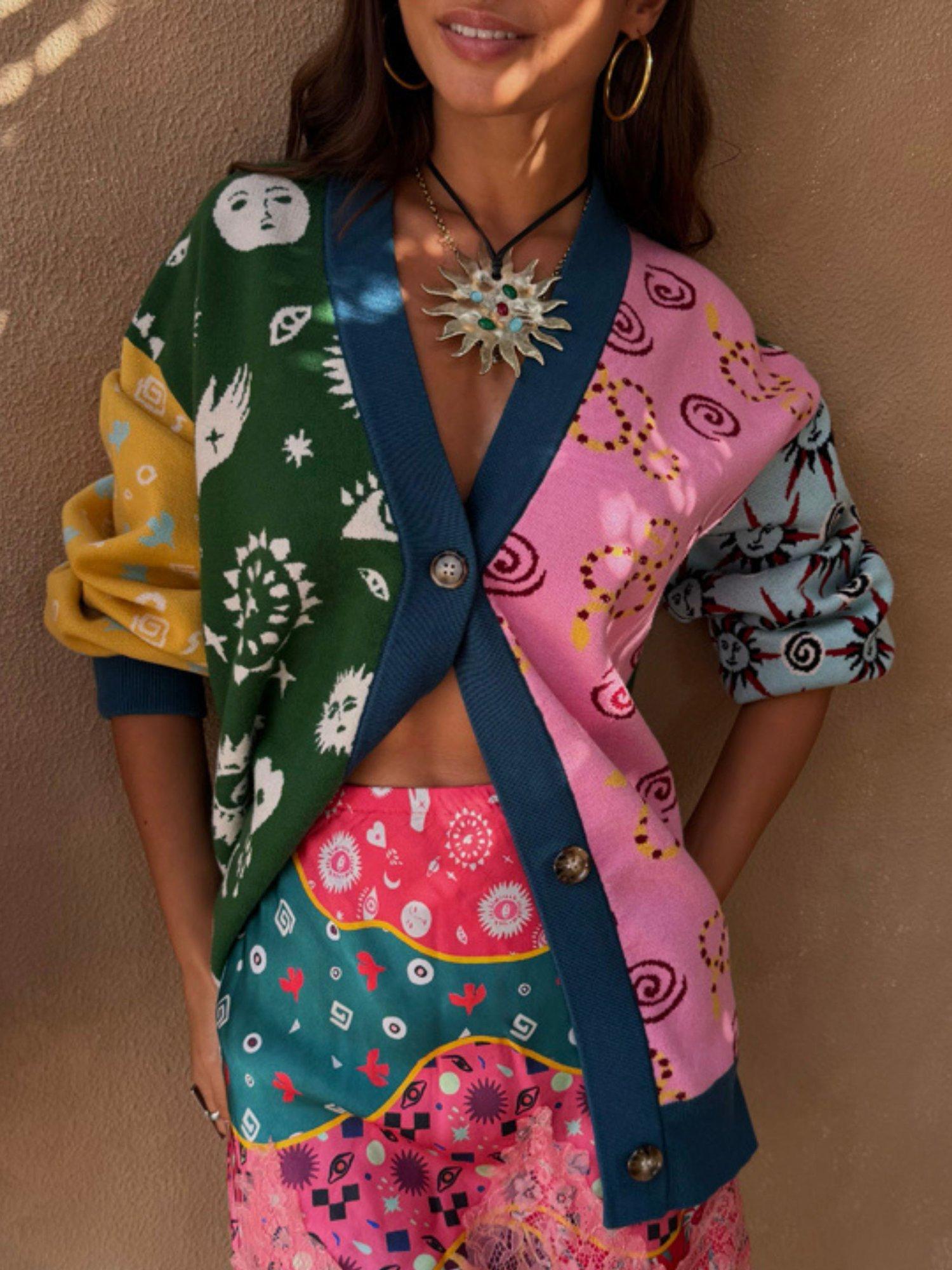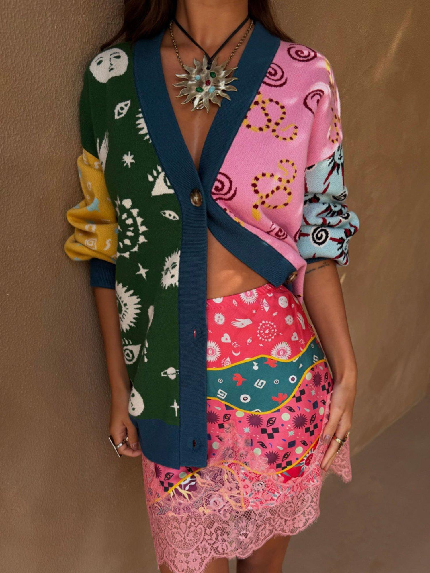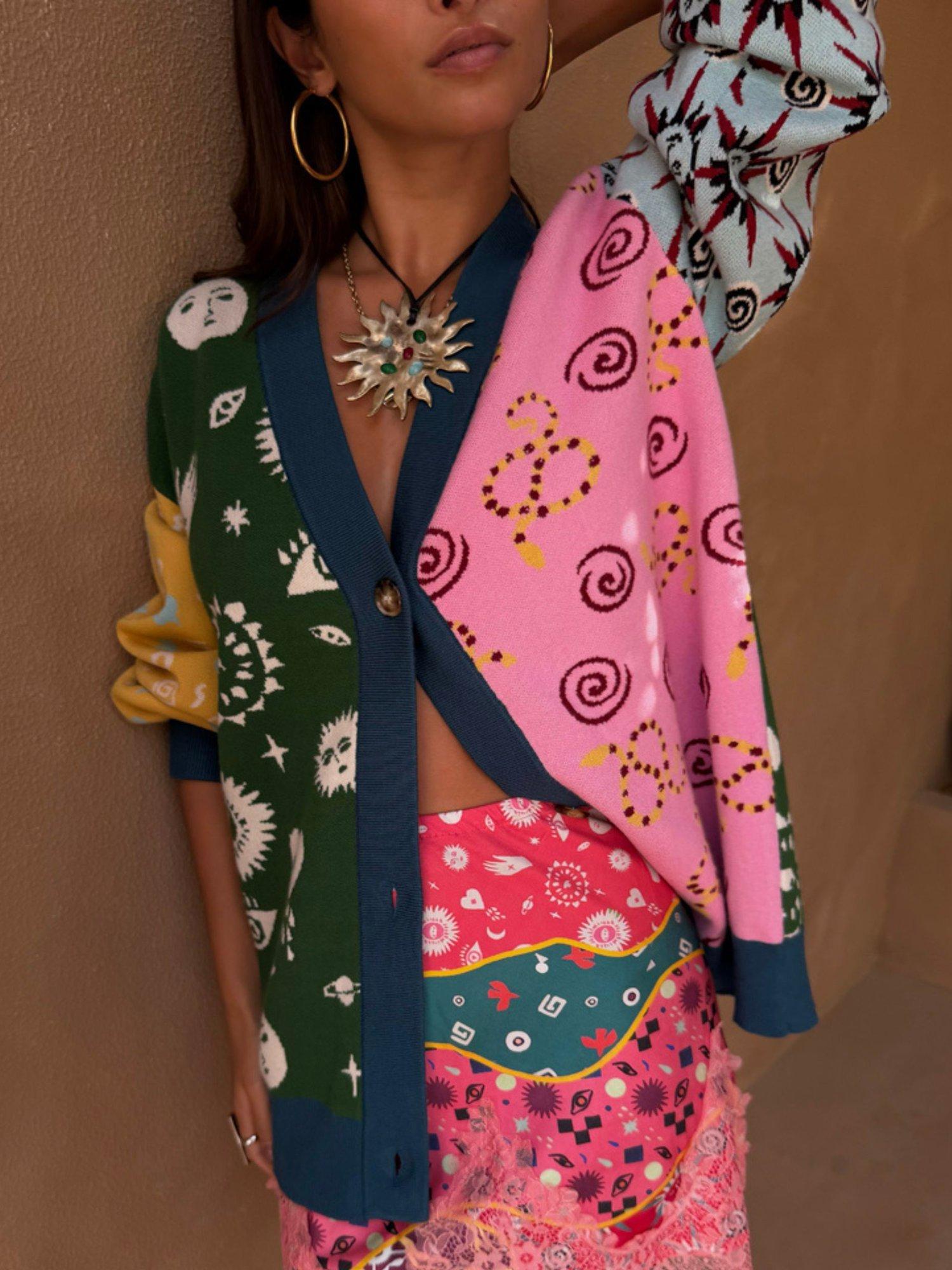 Step into your day with this abstract cardigan. The V-neck and long sleeves keep you comfortable, while the medium knit and loose fit invite you to express yourself confidently in any setting.