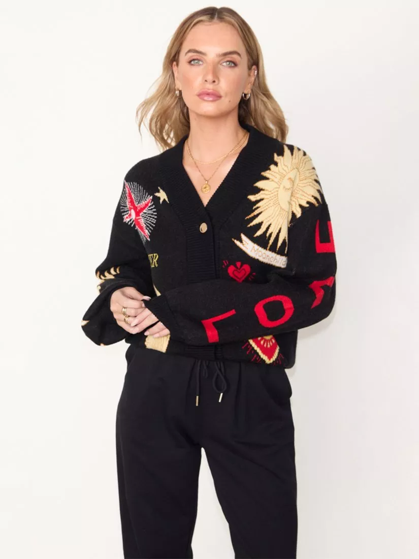 A bomber is ideal for the season, a light throw over for when it gets chilly in the evenings, with the structure of a jacket. The knitted fabric is so soft to the touch and feels weighty to drape the frame nicely. The beautiful embroidered motifs, inspired by the accents of gold and silver accompanied by engravings of suns and moons that can be found throughout the souks of Marrakech.