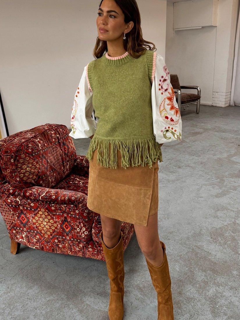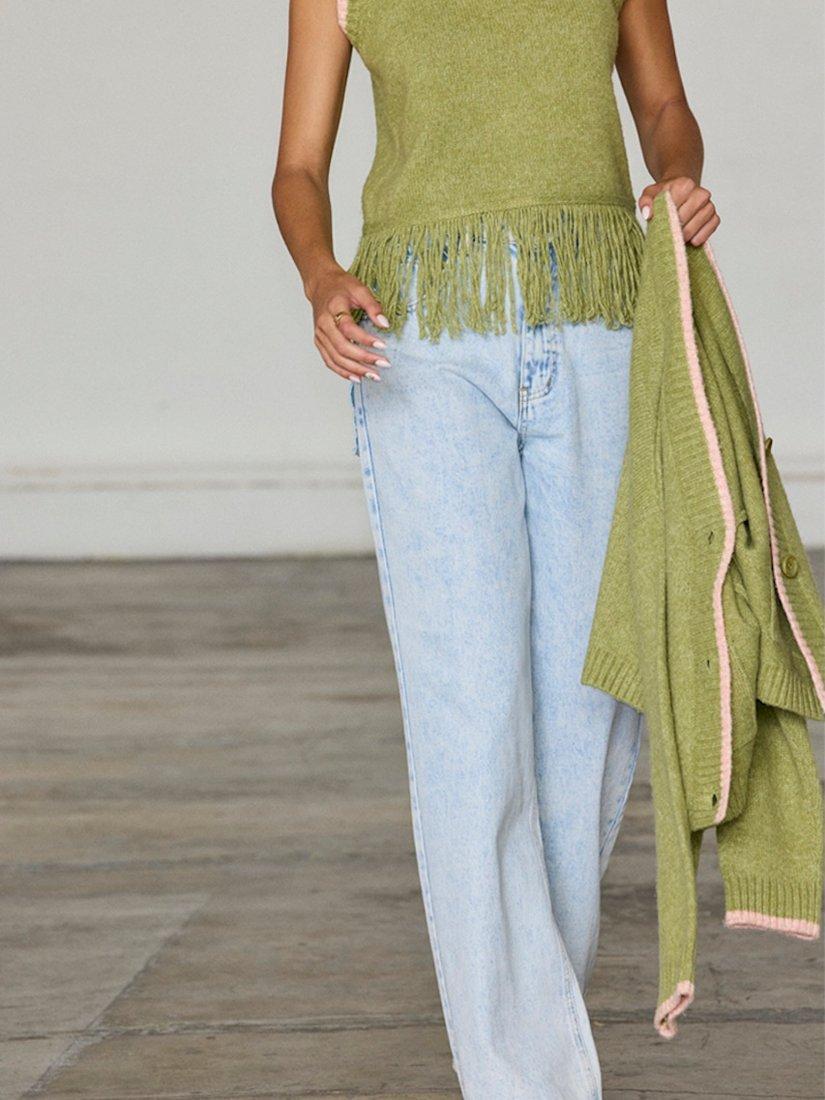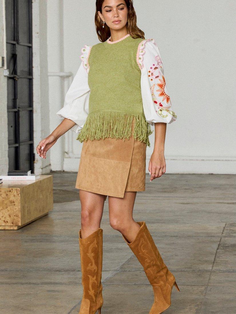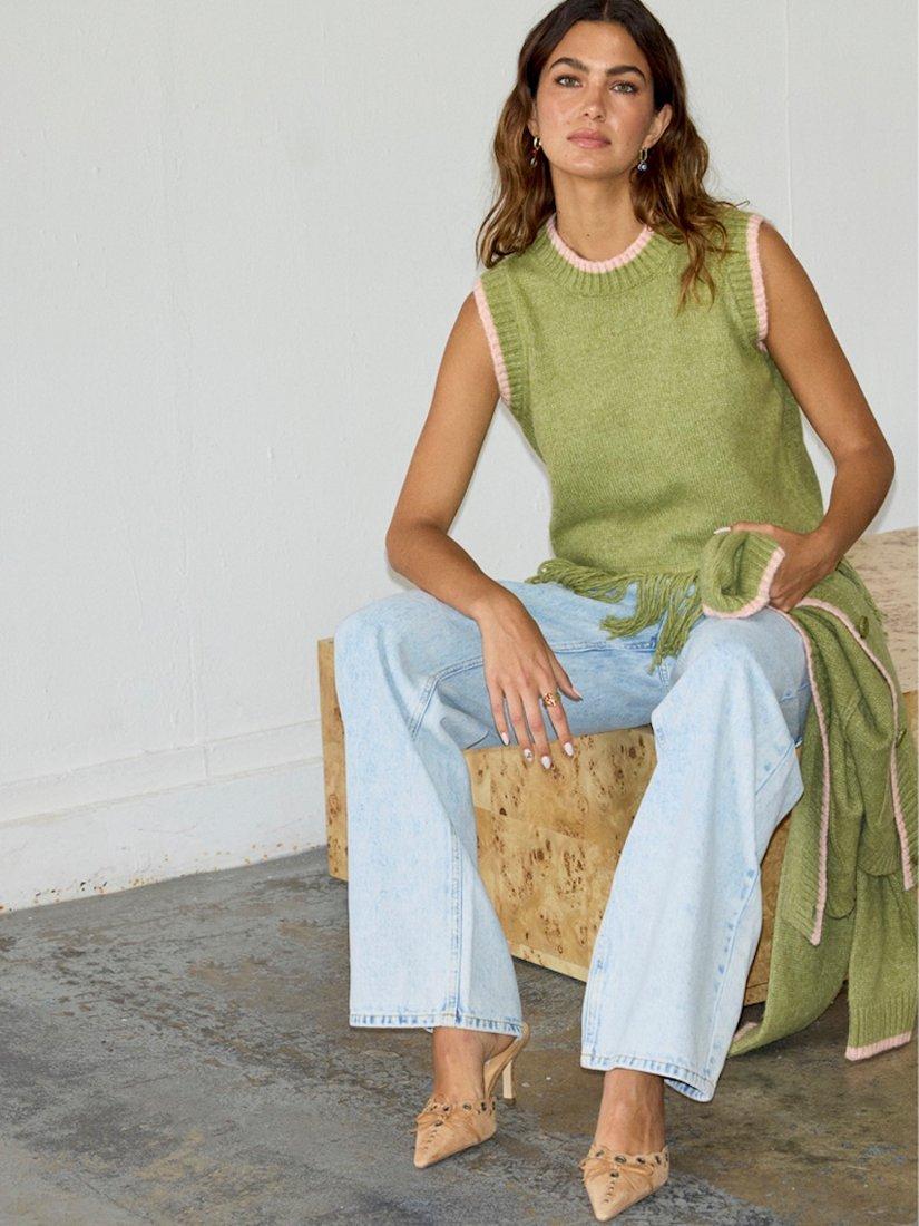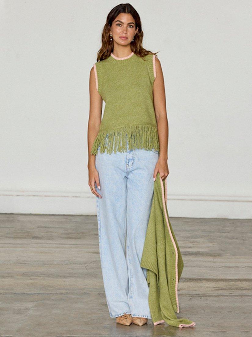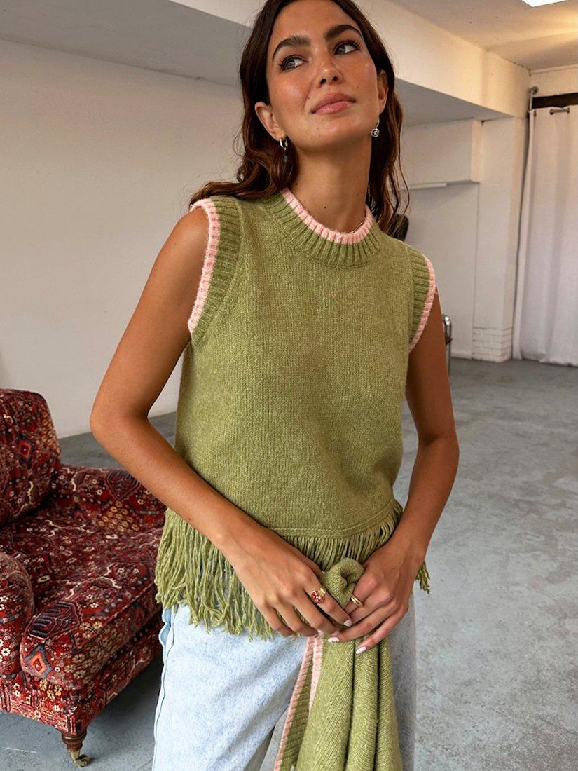 Knitted from a soft fabric blend with wool, this sleeveless vest is elevated with ribbed trims around the round neckline and it features a playful tassel-style hem. Wear it alone or layered over a lightweight top when it's cold.