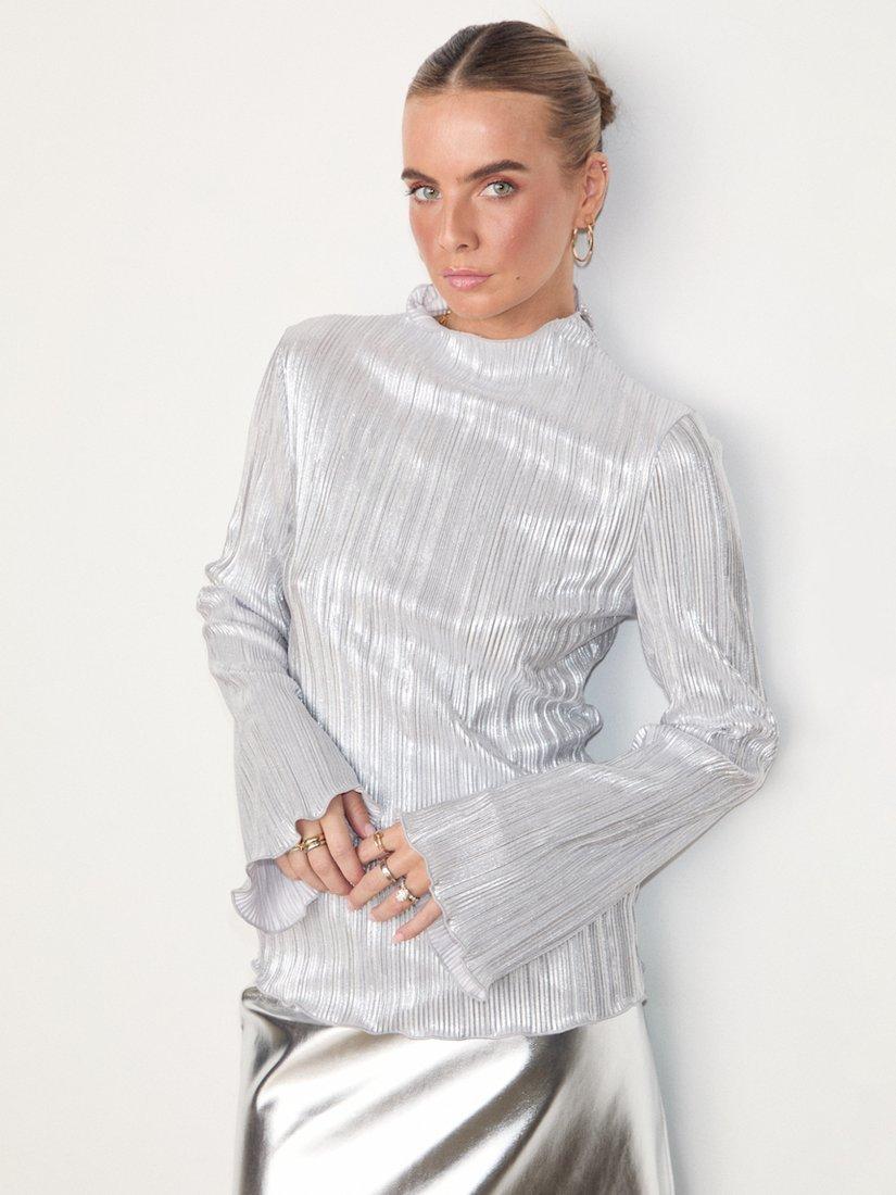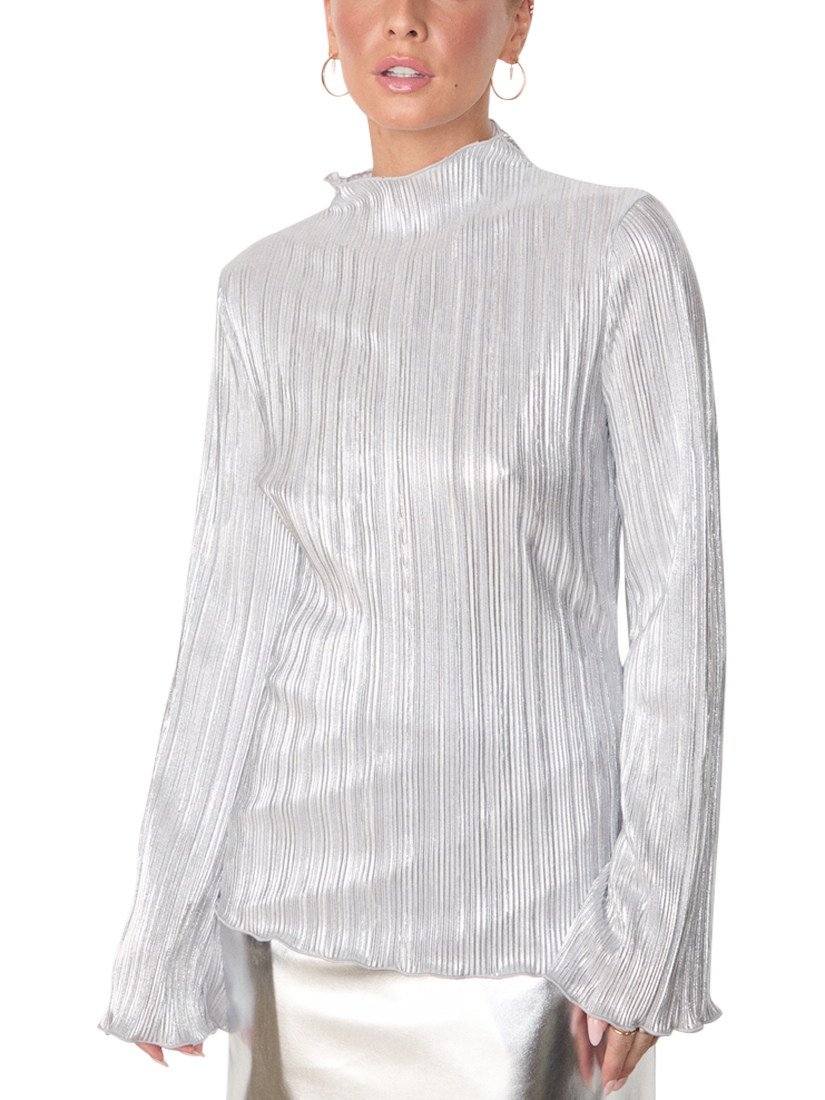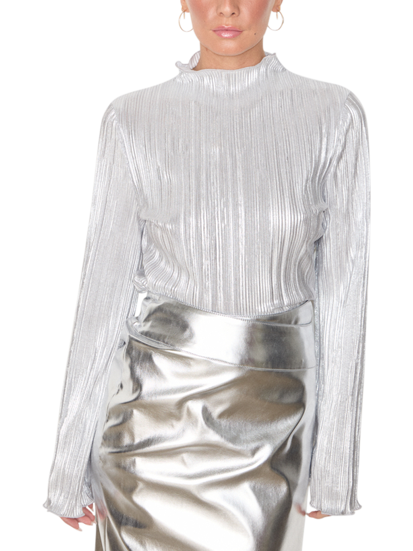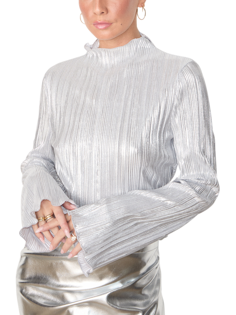 Silky plisse that catches the light in each little fold, and creates a beautiful almost holographic shimmer. With long floaty angel sleeves and bias hems that create a beautiful rippling effect. Pair with our leather mini jaspre, some heels and a clutch for the perfect date night outfit or keep it simple with some scallop edge jeans.
