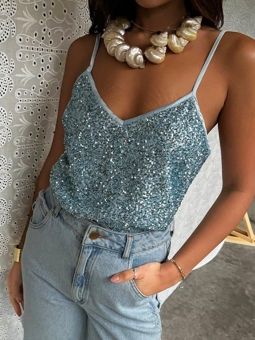 Lathered in beautiful blue sequins that catch the sunlight like a disco ball, this classic cami is designed by Never Fully Dressed. Pair with jeans for an elevated take on casual, or double up on the sparkle and tuck into a sequin skirt.