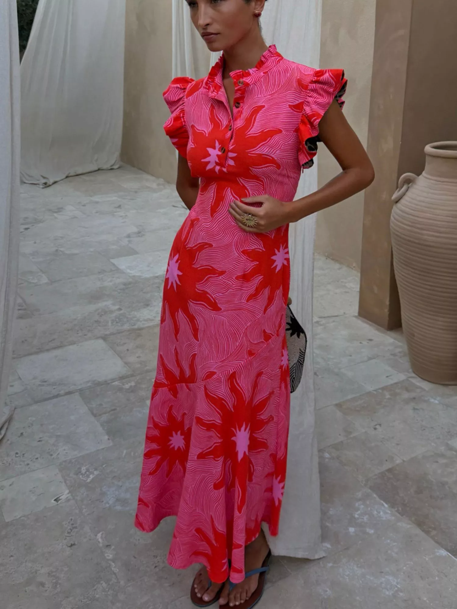 Shaped with a draped maxi silhouette, this soleil printed design features a V-neck and frilled short sleeves, balancing ease with striking detail for weddings, summer gatherings or day events.