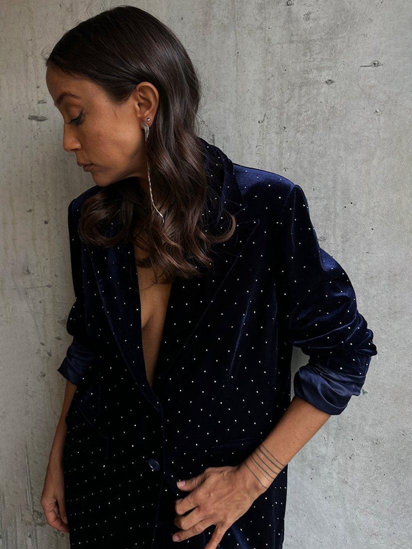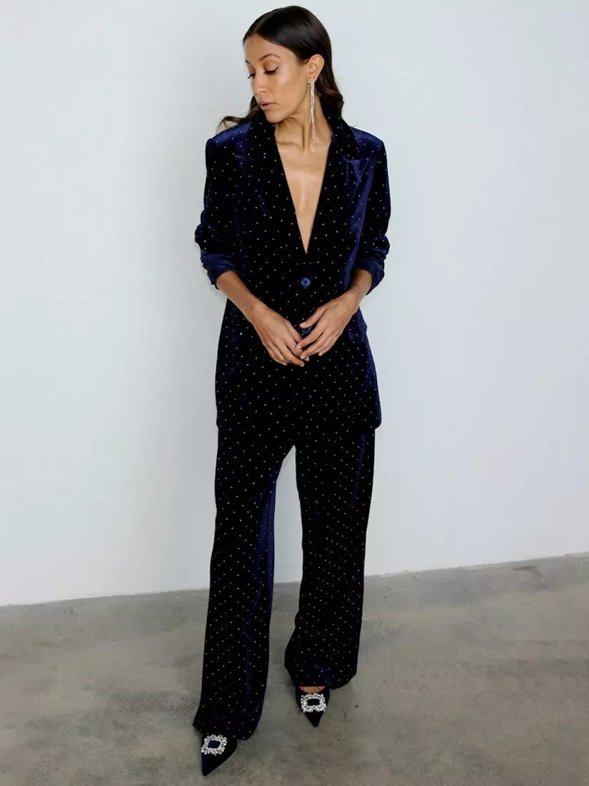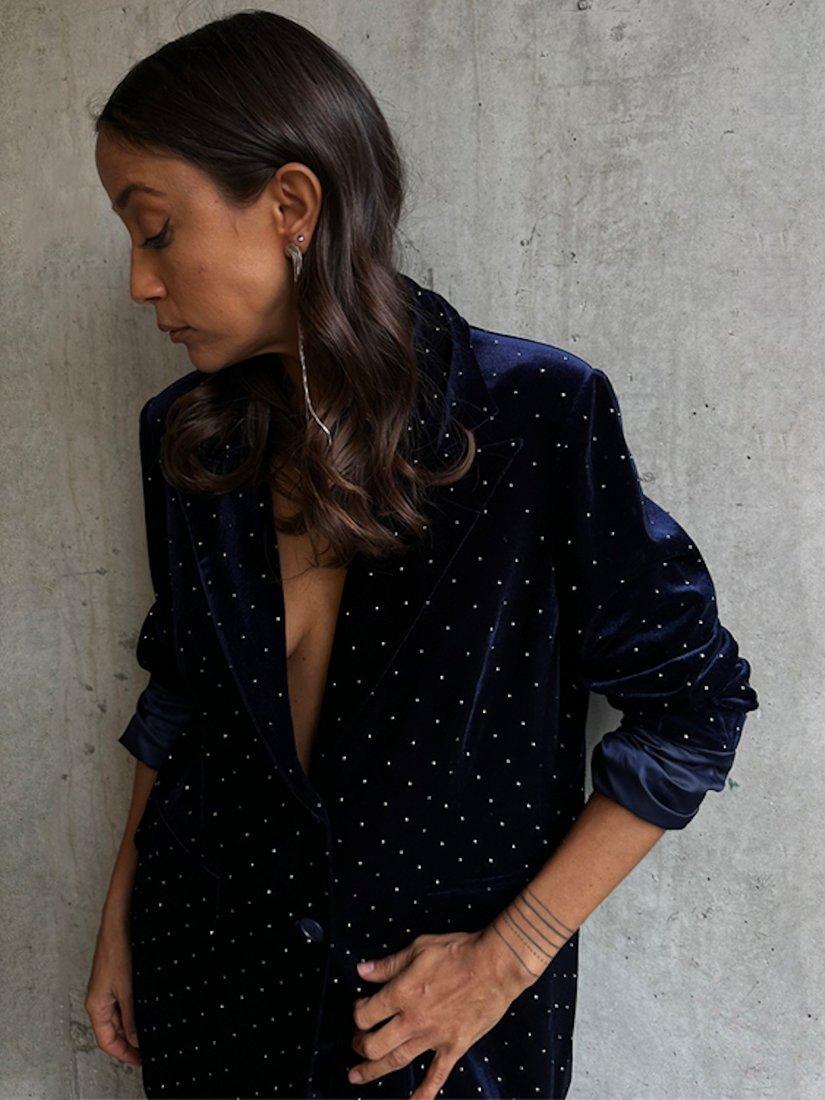 A single breasted blazer - a cool finish that reflects your dramatic personality. Made from a buttery soft velvet and studded with little diamonds.