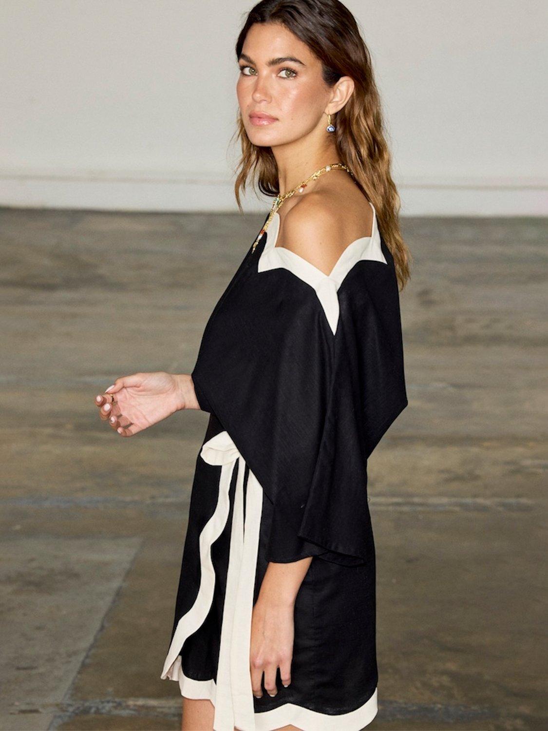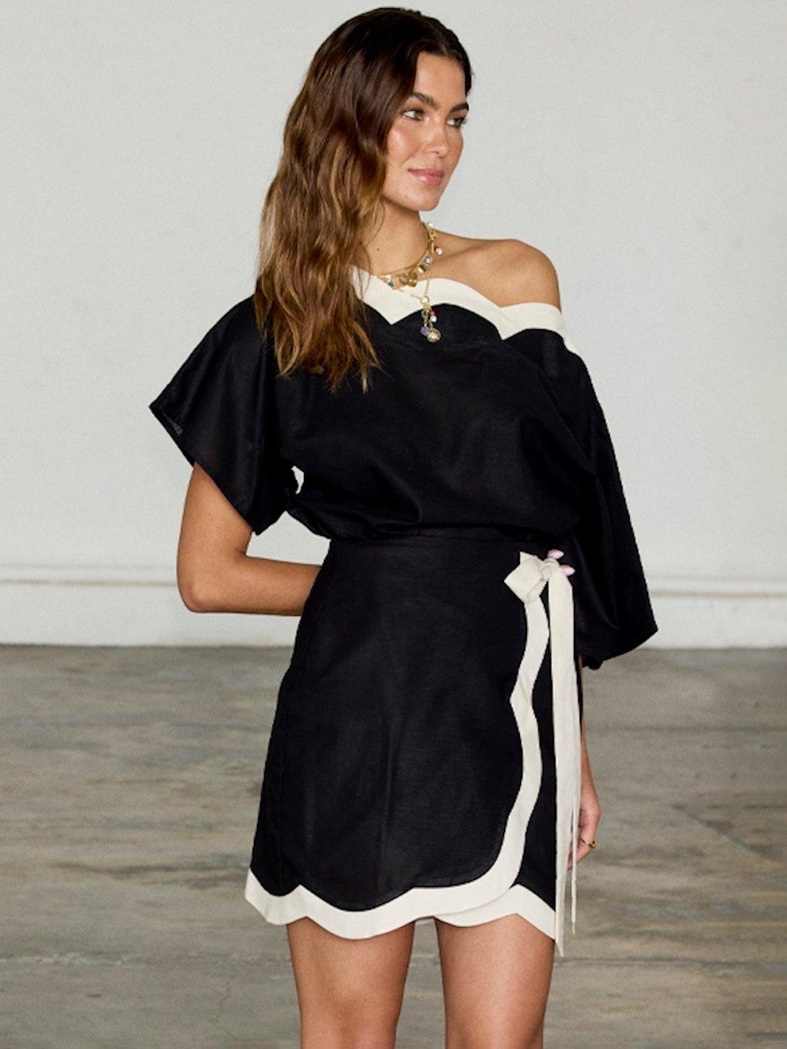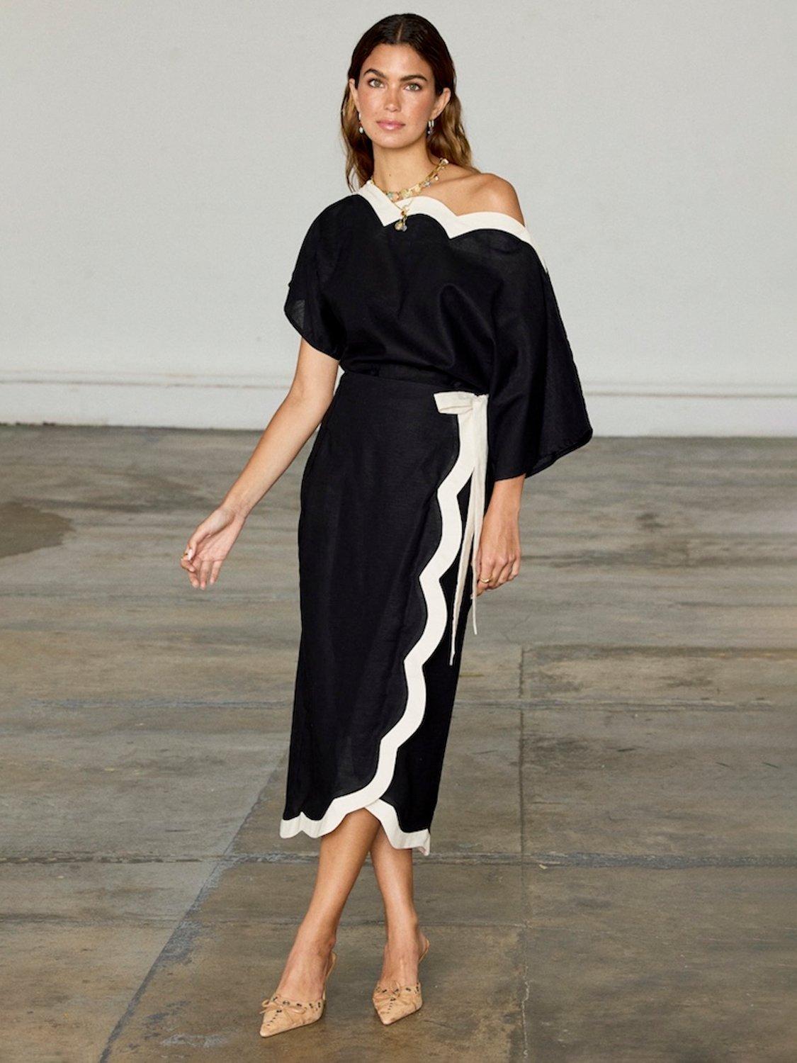 With contrast white scallop detailing, this blouse from Never Fully Dressed is framed with an asymmetric neckline and batwing elbow length sleeves. Made from a linen blend for a breathable, airy quality, pair with the matching wrap skirt for the coordinated look, or simply pull on with jeans.