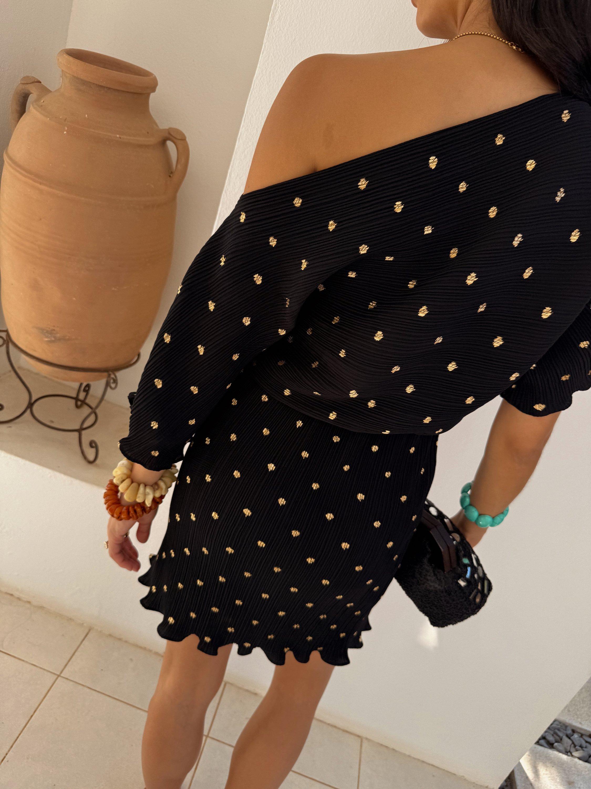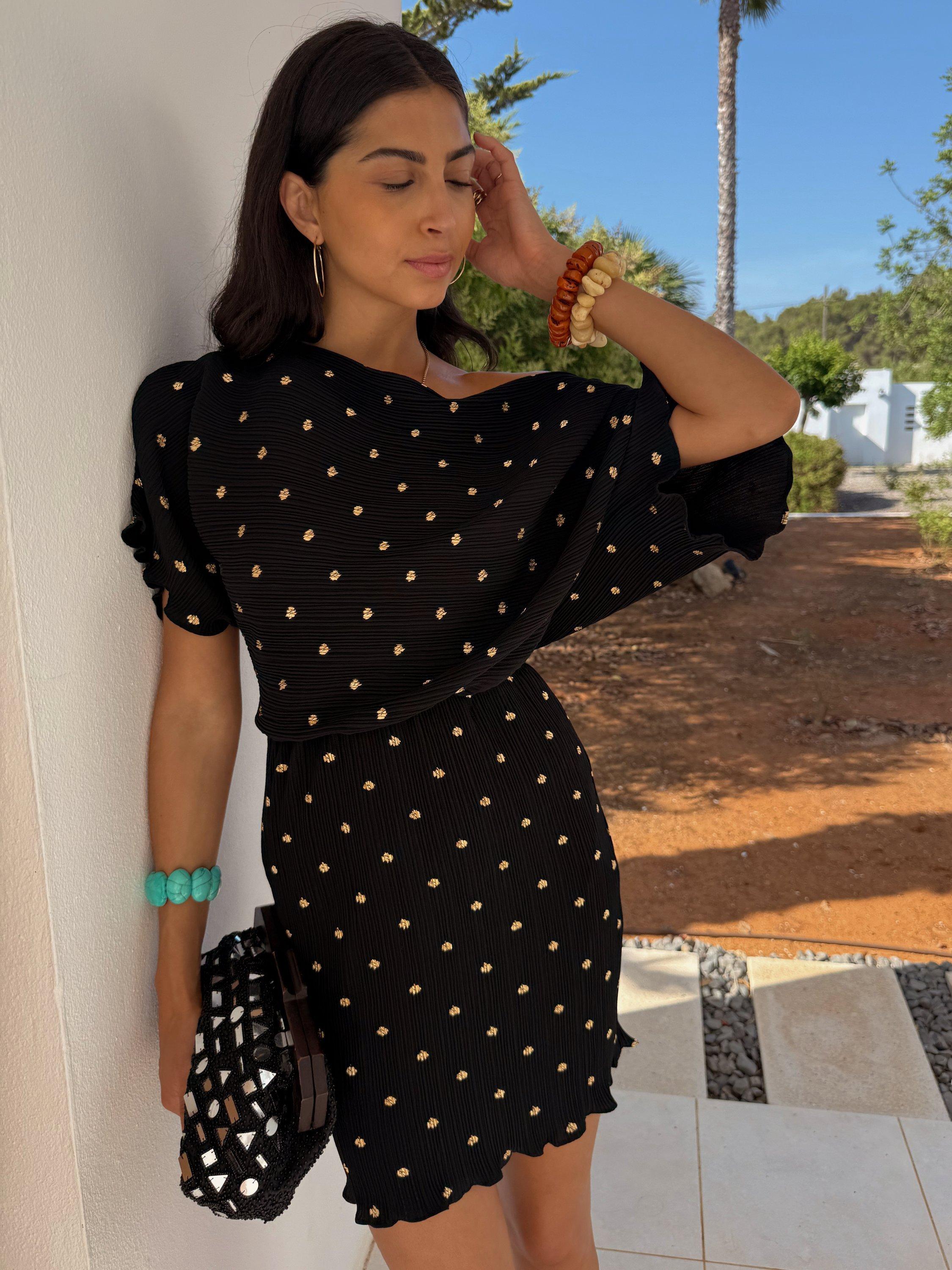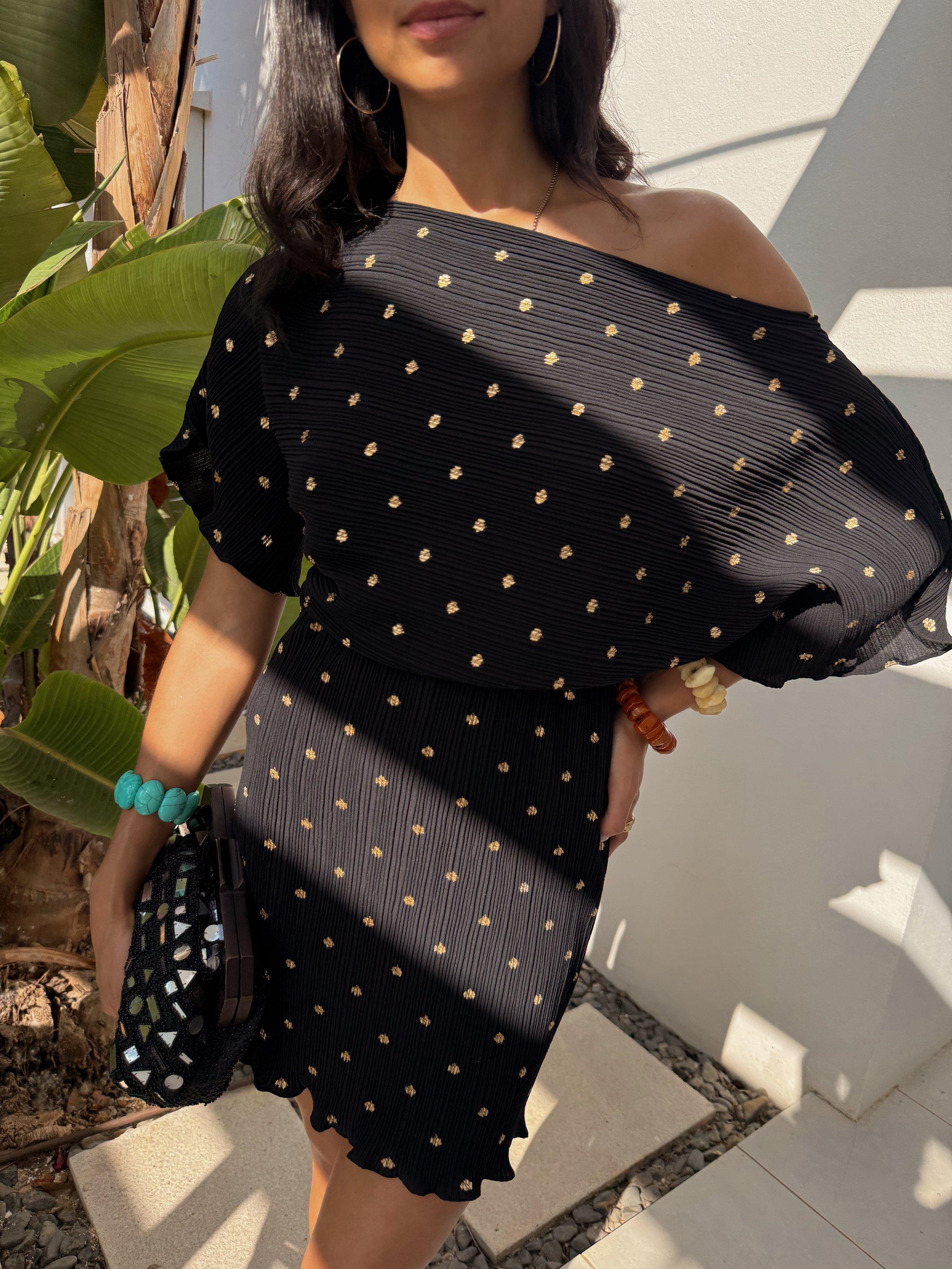 A re-edition of the bestselling Plisse Tilly dress in a brand new mini silhouette. Made with a plisse fabric, hundreds of tiny little pleats and an elasticated waistband means it has extra give, super comfortable fit and is perfect for bump dressing. Speckled with little metallic dots that are highlighted by the sunshine, it's a suitcase staple.