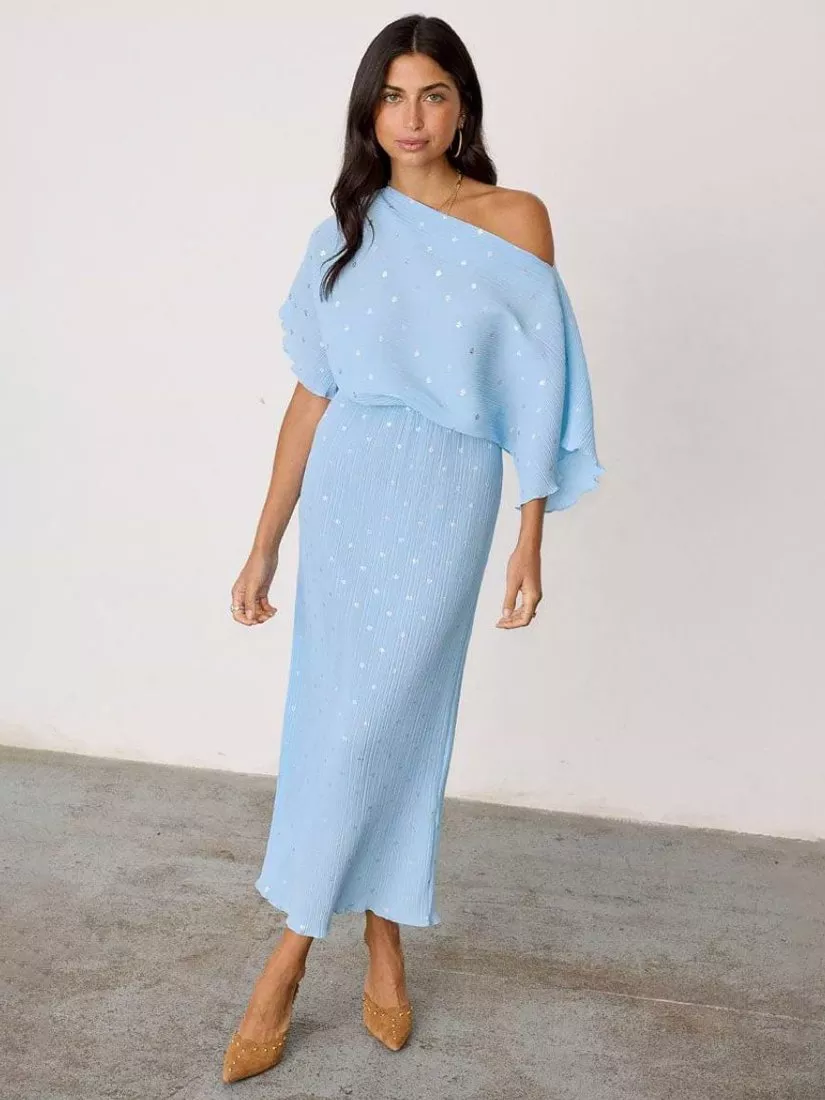 In a stunning silhouette with a blouson bodice and a straight fitting skirt, this maxi dress from Never Fully Dressed is made from a lightweight fabric. Featuring an asymmetric neckline and loose elbow length sleeves, it takes inspiration from vintage design with its subtle polka print.
